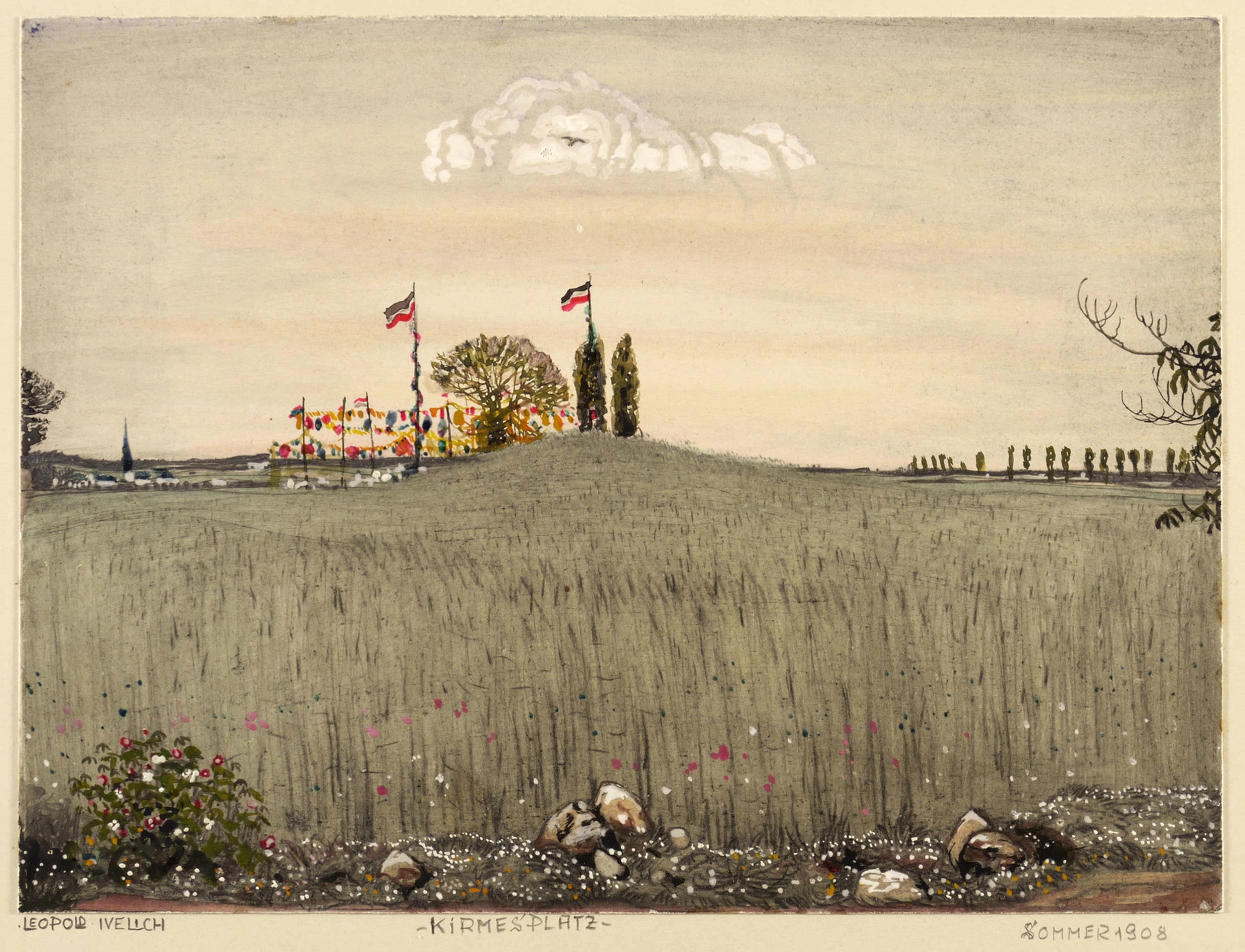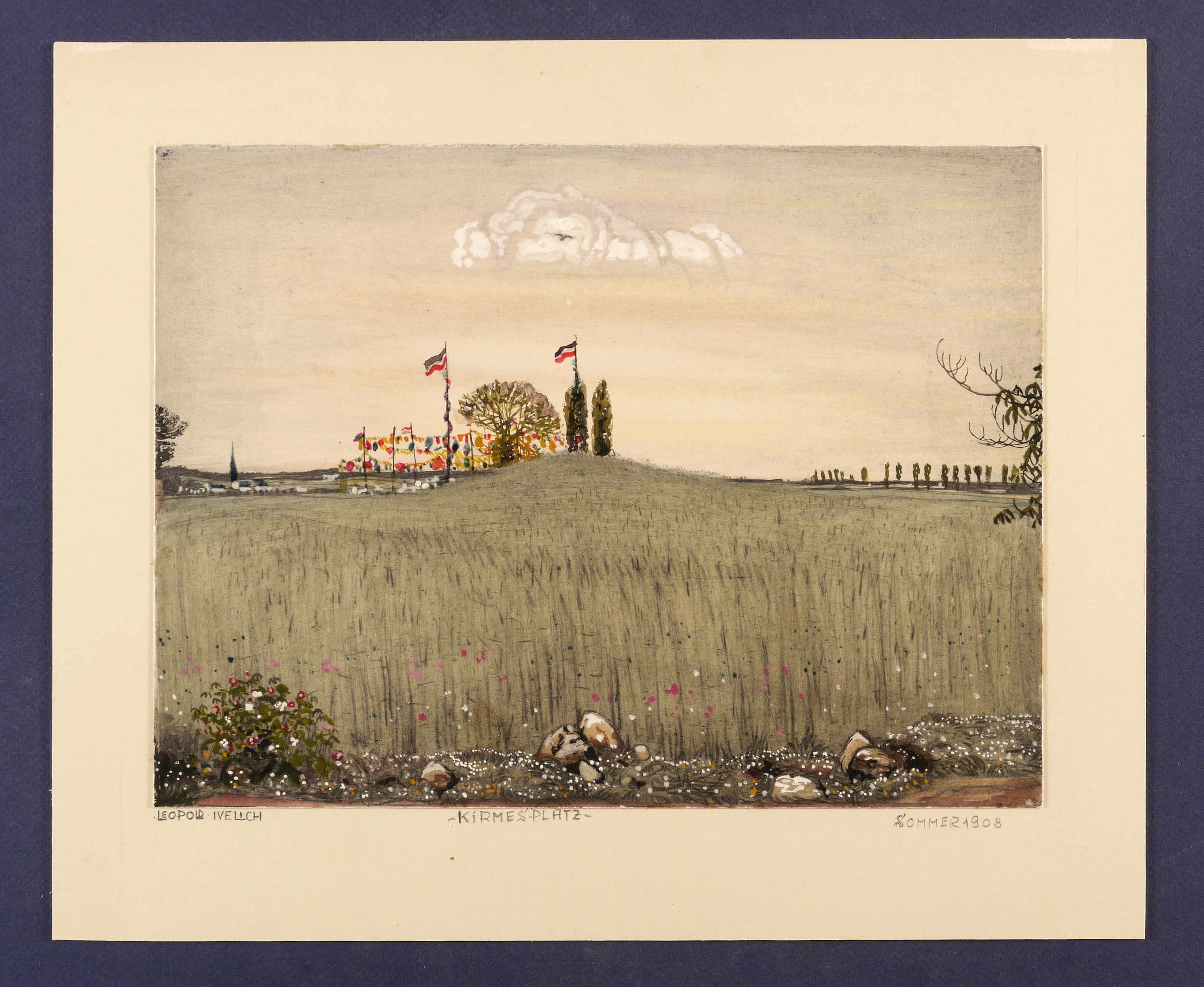 Auf deM Trägerkarton links unten in Bleistift signiert: ″LEOPOLD IUELICH″. Rechts Titel und Jahr: ″KIRMESPLATZ / SOMMER 1908″. – Original vom Künstler auf Trägerkarton gesetzt. Tadellos erhalten. Sehr guter Zustand.