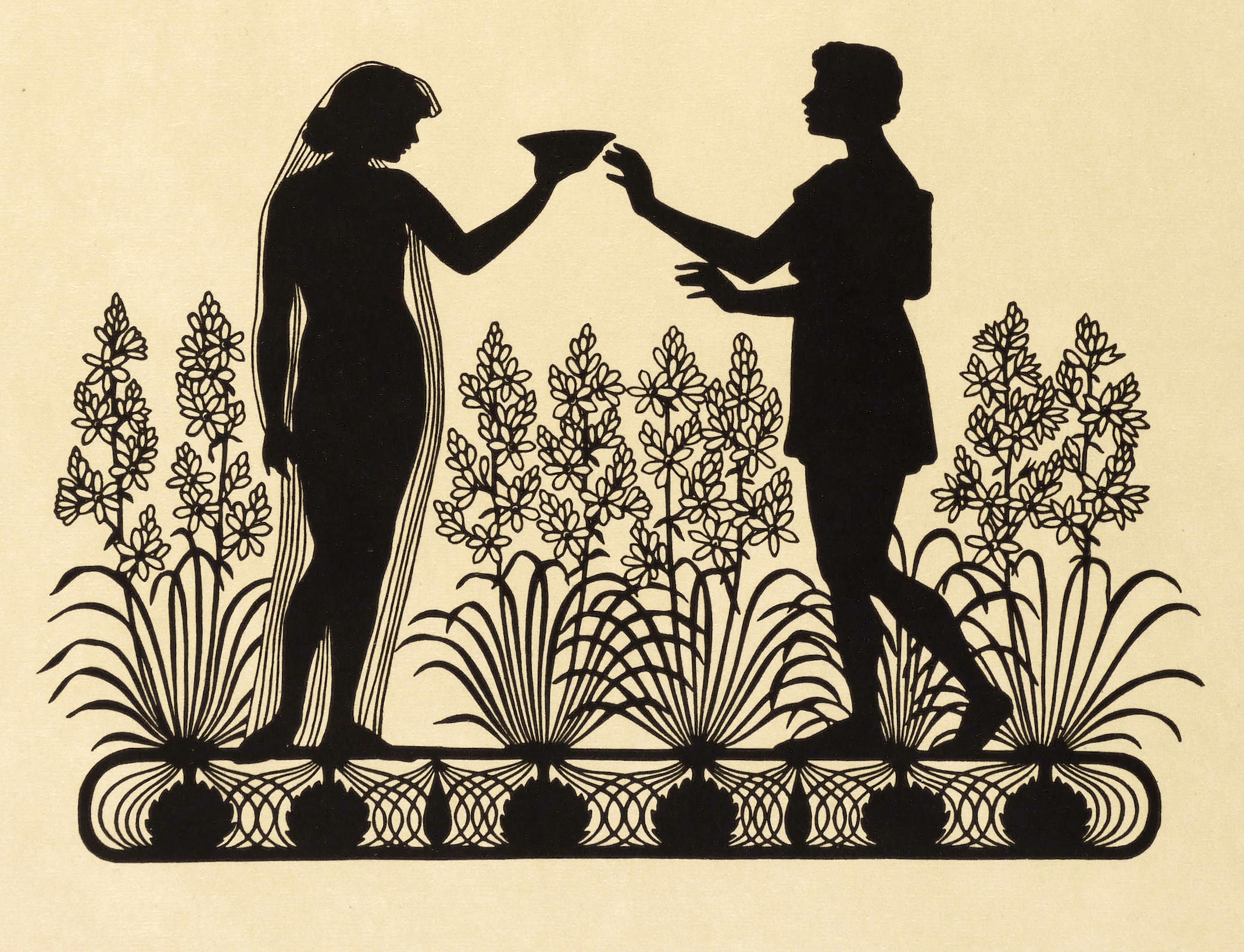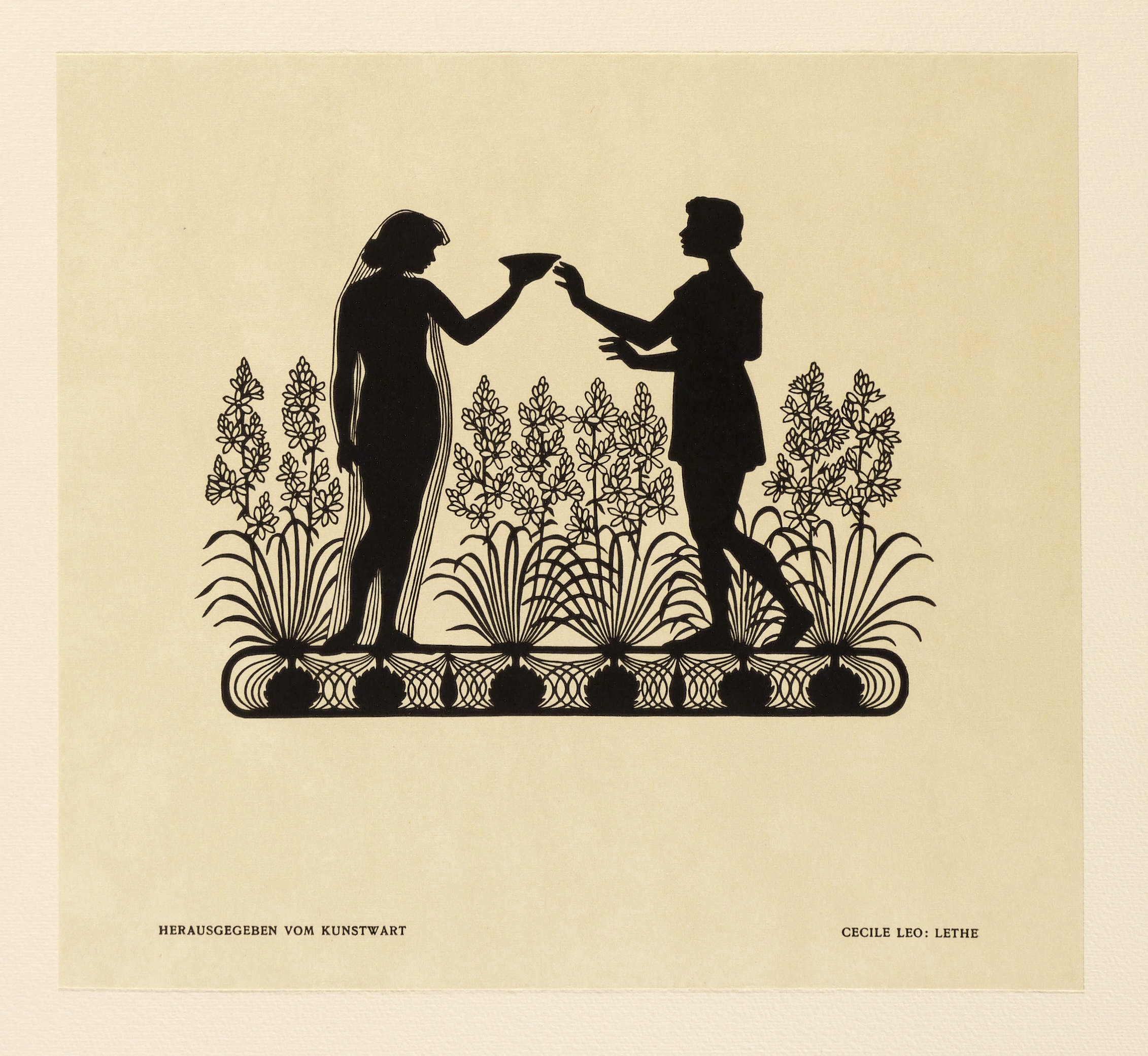 Aus: Cecile Leo, Schattenschnitte (München: Kunstwart - Georg D.W. Callwey 1914). – Rechts unten typografisch bezeichnet: ″CECILE LEO: LETHE″. – Zum Gedicht ″Lethe″ von Conrad Ferdinand Meyer: ″Jüngst im Traume sah ich auf den Fluten / Einen Nachen ohne Ruder ziehn, / Strom und Himmel stand in matten Gluten / Wie bei Tages Nahen oder Fliehn. // Sassen Knaben drin mit Lotoskränzen, / Mädchen beugten über Bord sich schlank, / Kreisend durch die Reihe sah ich glänzen / Eine Schale, draus ein jedes trank. // Jetzt erscholl ein Lied voll süsser Wehmut, / Das die Schar der Kranzgenossen sang – / Ich erkannte deines Nackens Demut, / Deine Stimme, die den Chor durchdrang. // In die Welle taucht ich. Bis zum Marke / Schaudert ich, wie seltsam kühl sie war. / Ich erreicht' die leise ziehnde Barke, / Drängte mich in die geweihte Schar. // Und die Reihe war an dir zu trinken, / Und die volle Schale hobest du, / Sprachst zu mir mit trautem Augenwinken: / 'Herz, ich trinke dir Vergessen zu!'.″ – Tadellos. Original im Passepartout montiert. Sehr guter Zustand.