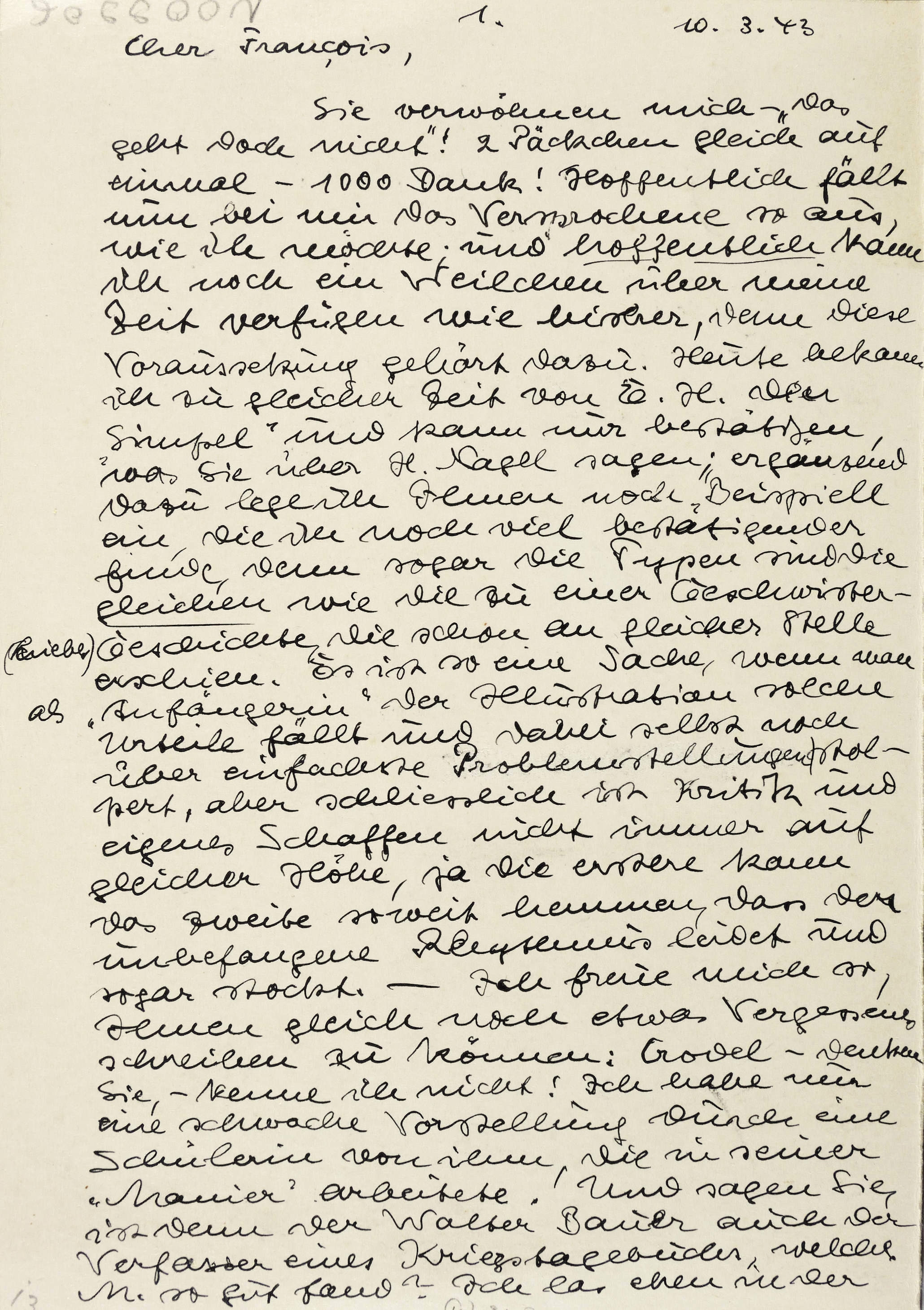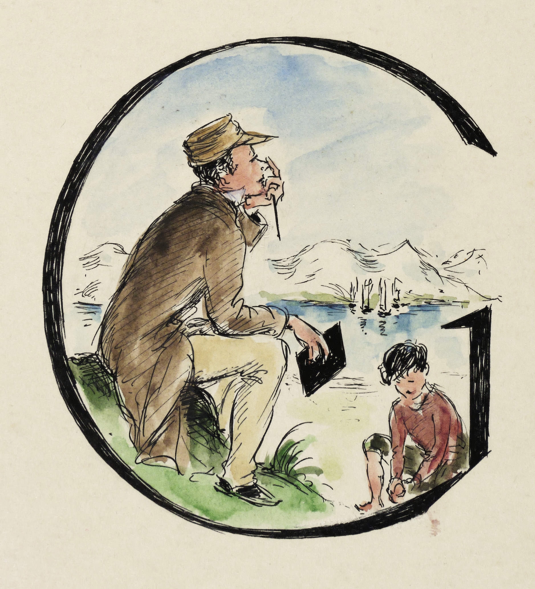 Unterhalb in schwarzer Feder Kommentar. Verso erster Teil eines Kartengrusses der Künstlerin an Franz Schwimmer, gen. Siska. – Entwurfszeichnung für die Initiale G zu Gottfried Keller ″Was der Herr Pate aus dem alten Zürich erzählte. Der Züricher Novellen Erster Teil″, das 1943 mit Buchillustrationen der Künstlerin im Leipziger Verlag Buch und Volk erschien. - Aus dem Nachlass des Malers Franz Schwimmer, gen. Siska, Privatbesitz Leipzig. – Tadellos erhalten. Sehr guter Zustand.