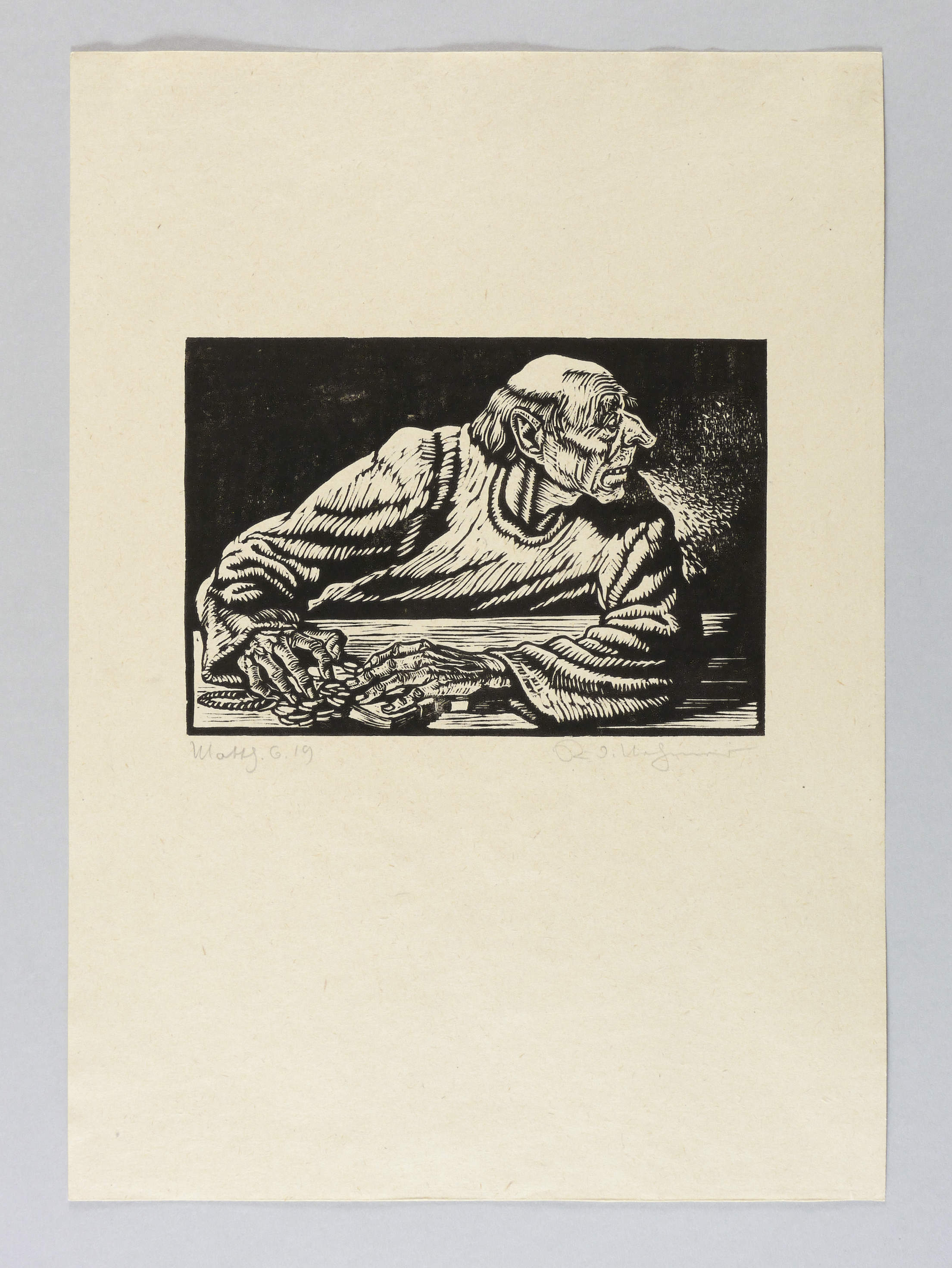 Rechts unten in Bleistift signiert. Links bezeichnet: ″Matth. 6.19″. – Blatt aus der bekannten Holzschnitt-Folge ″Die Bergpredigt″ zu Matthäus 6.19: ″Sammelt euch nicht Schätze hier auf der Erde, wo Motte und Wurm sie zerstören und wo Diebe einbrechen und sie stehlen, sondern sammelt euch Schätze im Himmel.″ – Tadelloses Exemplar. Verso minimale Montagereste. Sehr guter Zustand.