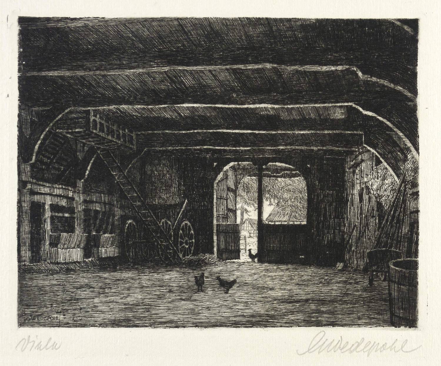 Gerhard Wedepohl (1893 Schönebeck bei Bremen - 1930 Bremen). Deutscher Maler und Grafiker. Studium bei Johann Vincenz Cissarz und Alexander Eckener an der Stuttgarter Akademie. Vor allem Landschaften, Ansichten und ländliche Sujets. Veröffentlichte Mitte der 1920er Jahre Folgen von Zeichnungen u.a. zu Osnabrück, Ravensberg und Bevensen. Daneben Buchillustrationen und Exlibris.