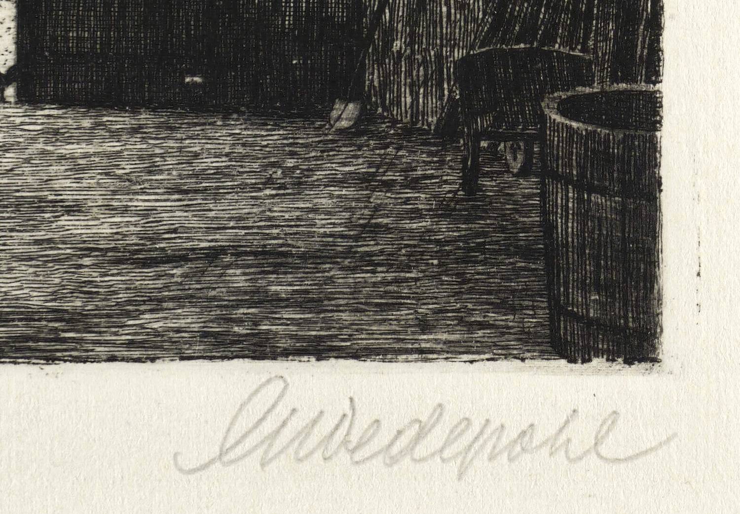 1915-1925. Radierung / Strichätzung, in Schwarz, auf wolkigem gelbem Büttenpapier. – Originale Künstlergrafik, von Gerhard Wedepohl. – 13,4 x 17,2 cm (Darstellung / Platte), 28 x 31 cm (Blatt).