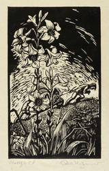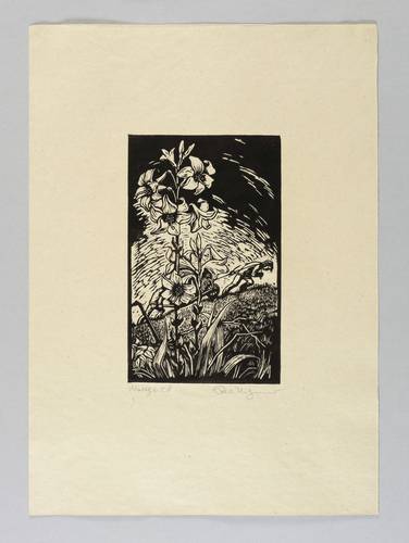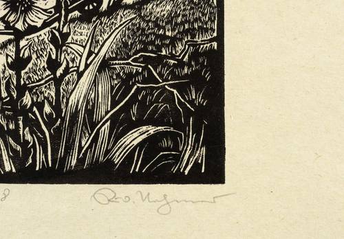 Rechts unten in Bleistift signiert. Links bezeichnet: ″Matth. 6.28″. – Blatt aus der bekannten Holzschnitt-Folge ″Die Bergpredigt″ zu Matthäus 6.28: ″Und was sorgt ihr euch um eure Kleidung? Lernt von den Lilien des Feldes, wie sie wachsen: Sie arbeiten nicht und spinnen nicht.″ – Tadelloses Exemplar. Verso minimale Montagereste. Sehr guter Zustand.