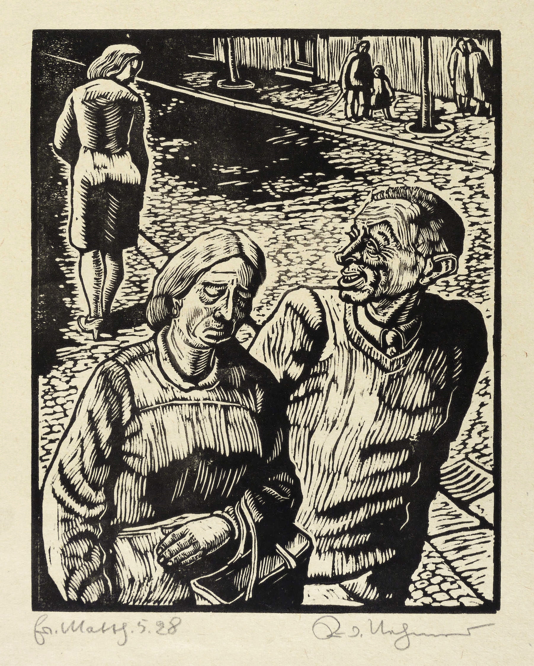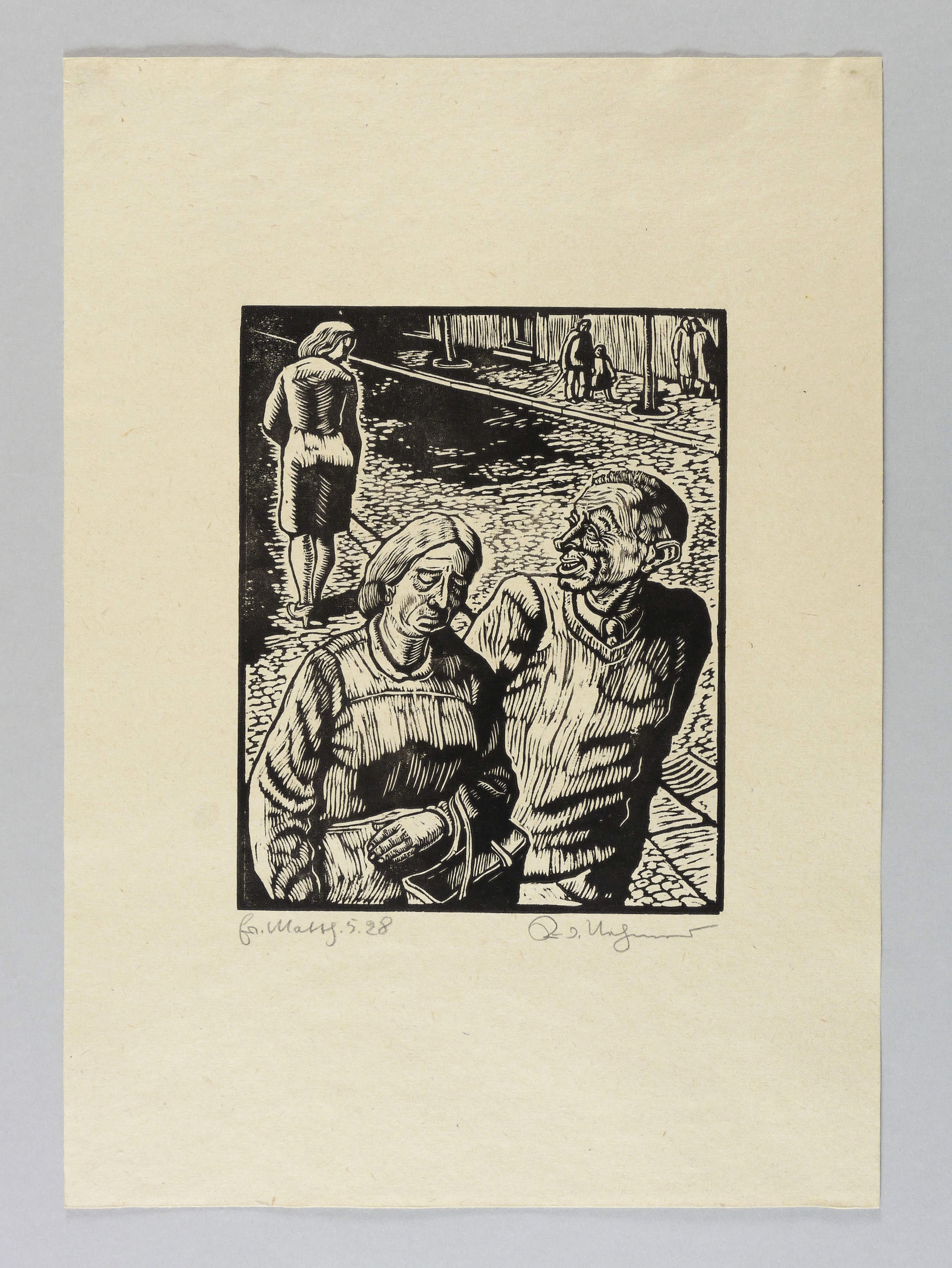 Rechts unten in Bleistift signiert. Links bezeichnet: ″Matth. 5.28″. – Blatt aus der bekannten Holzschnitt-Folge ″Die Bergpredigt″ zu Matthäus 5.28: ″Ich aber sage euch: Jeder, der eine Frau ansieht, um sie zu begehren, hat in seinem Herzen schon Ehebruch mit ihr begangen.″ – Tadelloses Exemplar. Verso minimale Montagespuren. Sehr guter Zustand.