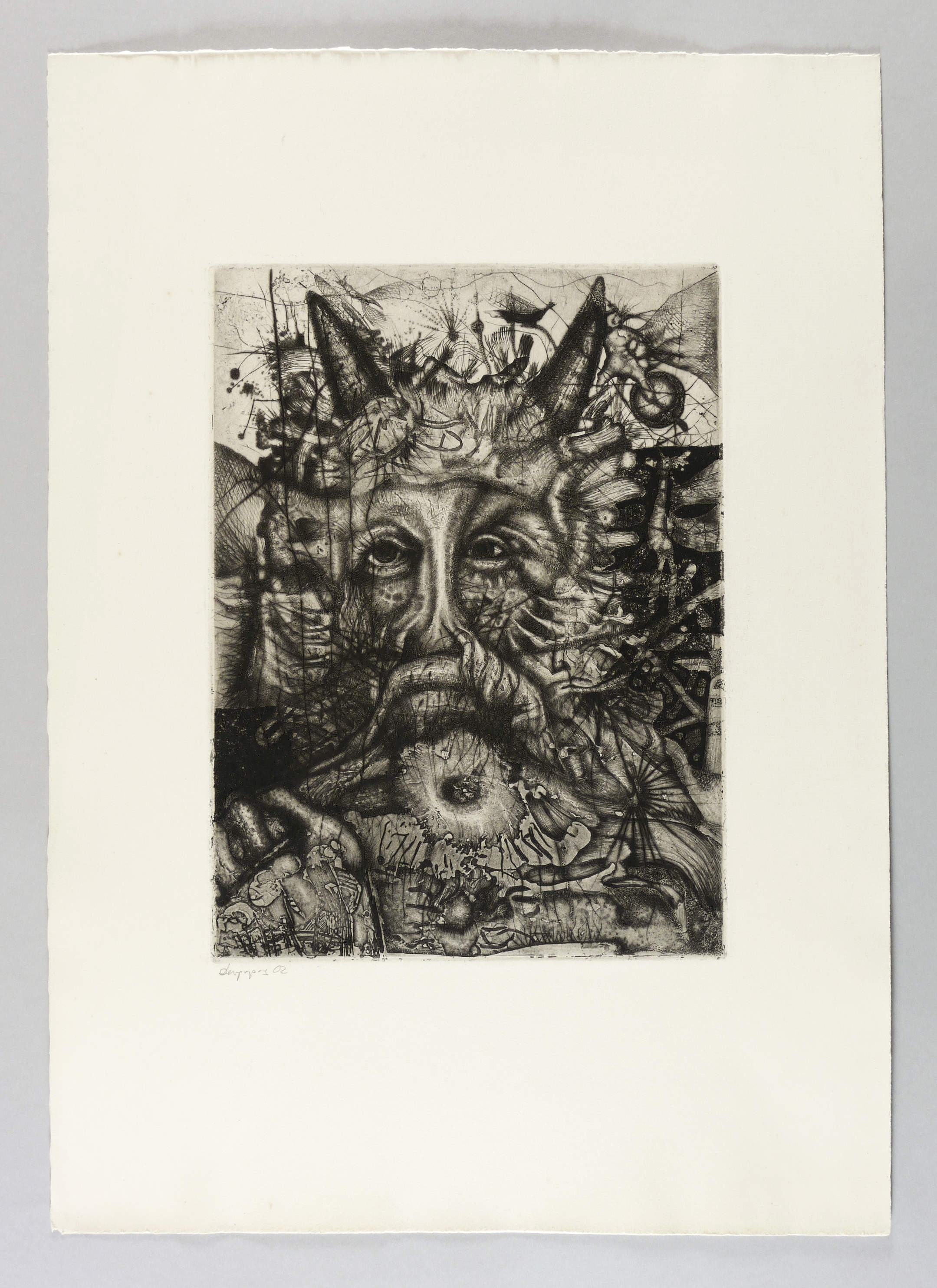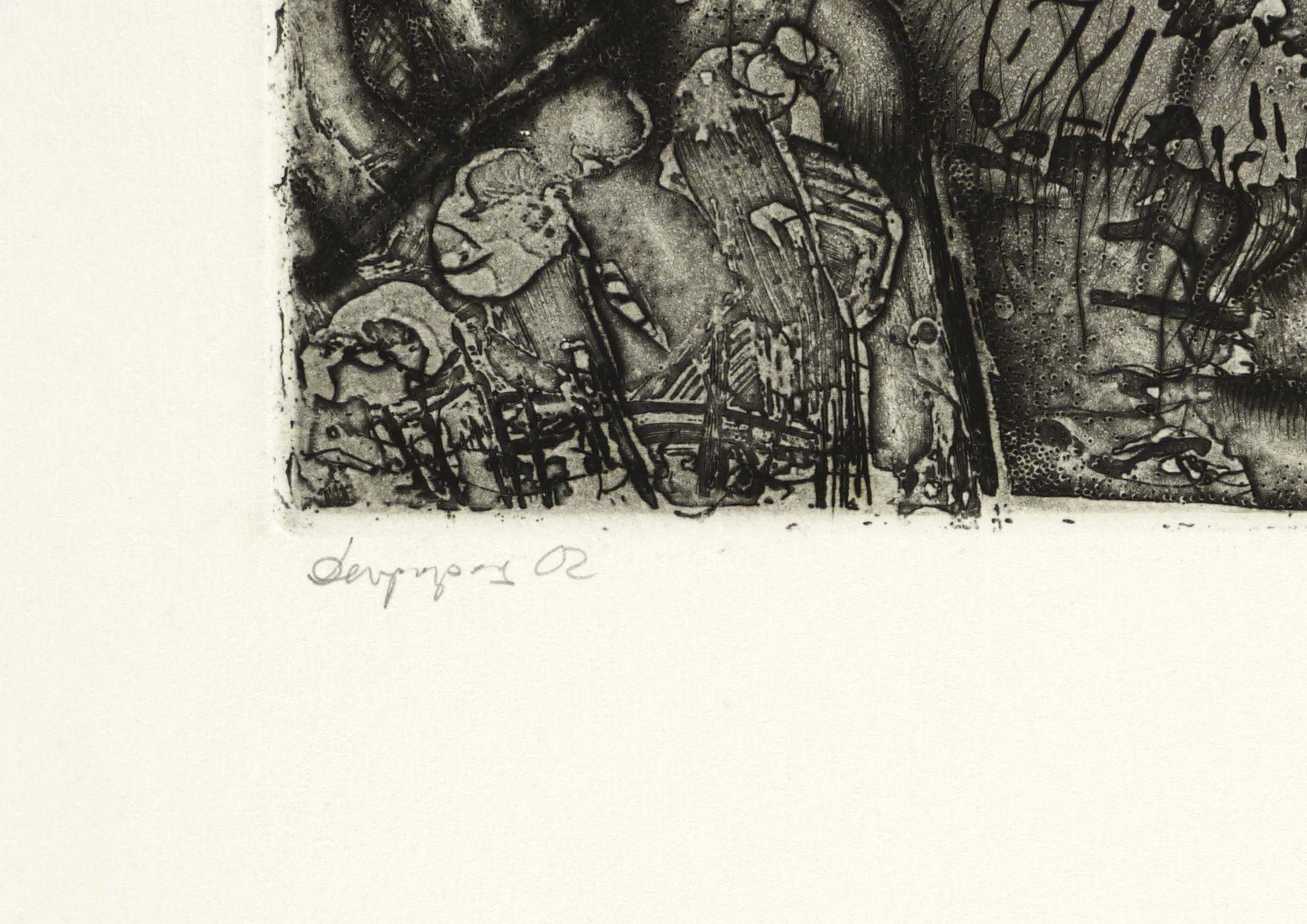 1962. Radierung / Strichätzung, Kaltnadel & Punzenstich, in Schwarz, mit Plattenton, auf gelbem Velinkarton. – Originale Künstlergrafik, von Georgios Derpapas. – 31,8 x 23,6 cm (Darstellung / Platte), 54 x 39 cm (Blatt).