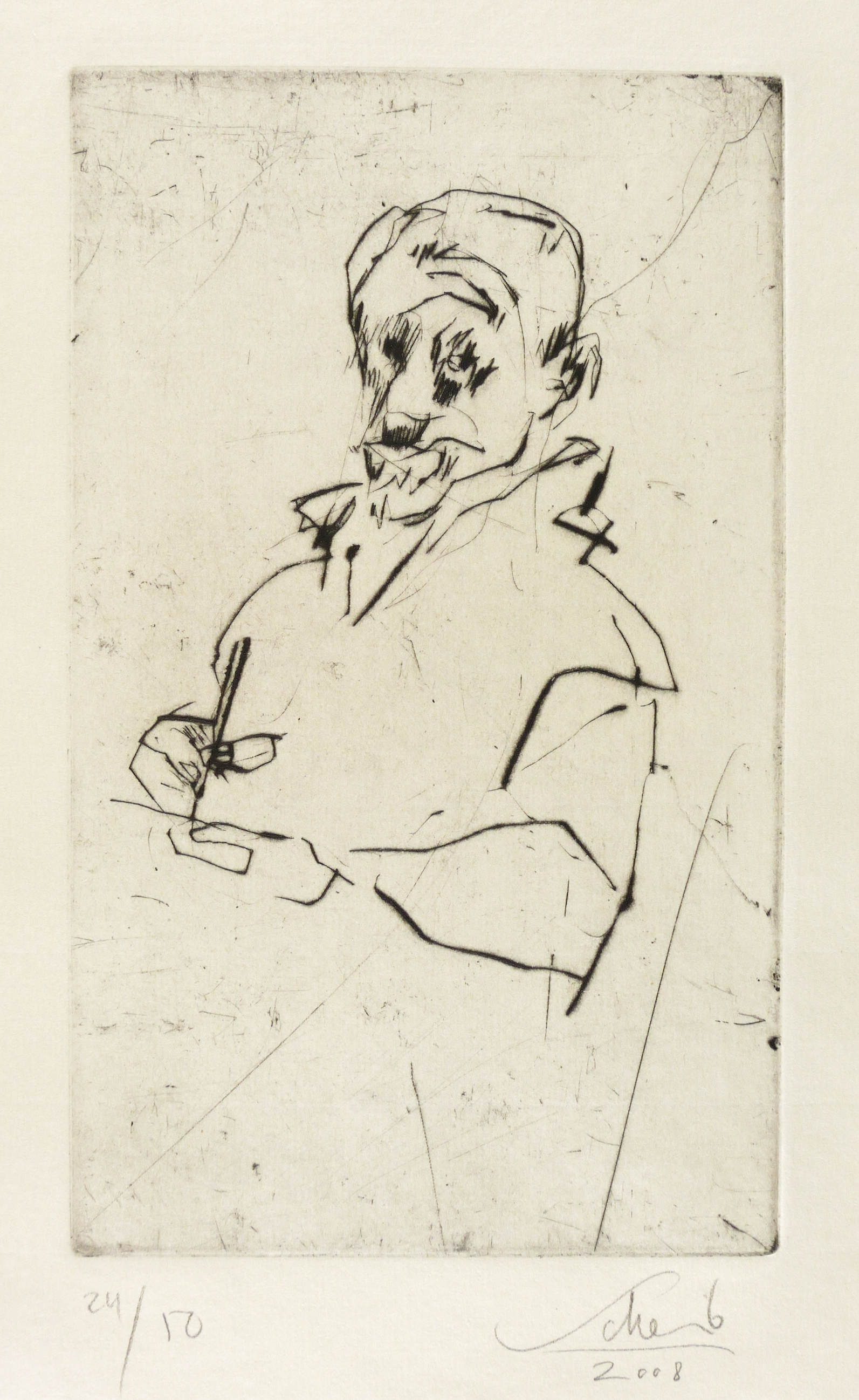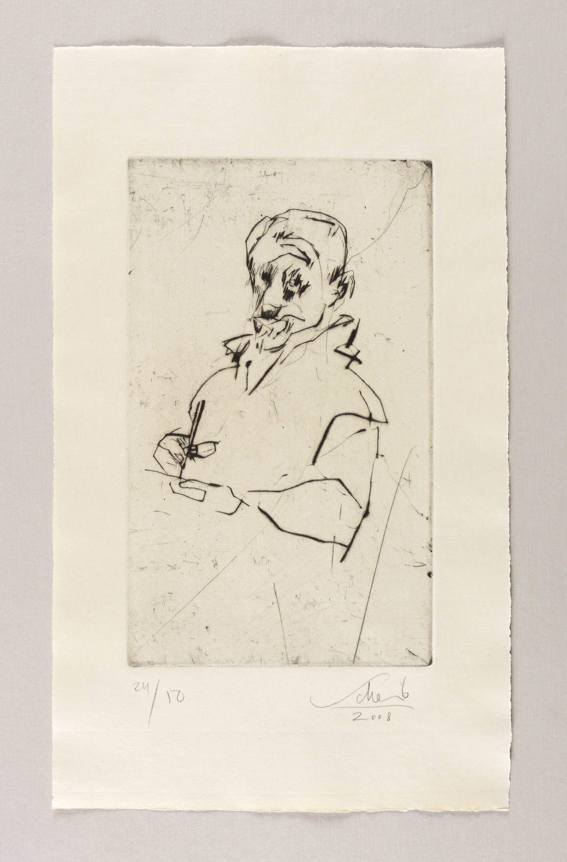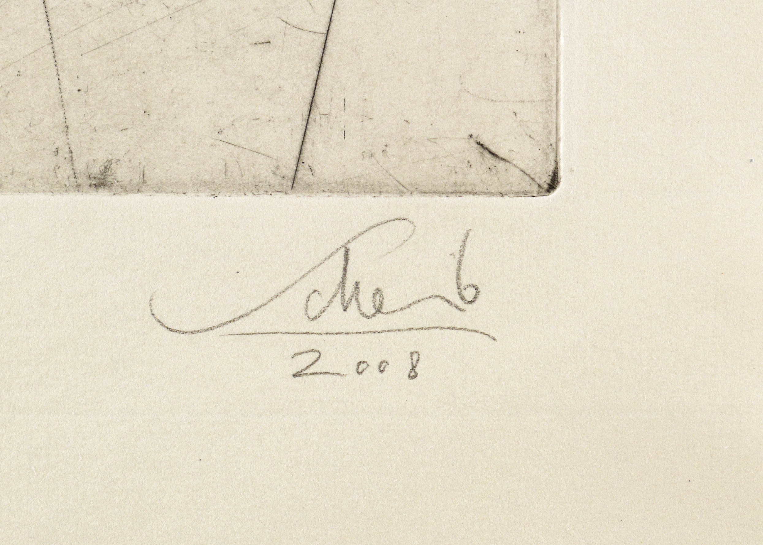 2008. Radierung / Kaltnadel, in Schwarz, auf feinem gelbem Bütten. – Von Hans Scheib. – Auflage Exemplar Nr. 24/50. – 19,8 x 12,0 cm (Darstellung / Platte), 30 x 18 cm (Blatt).