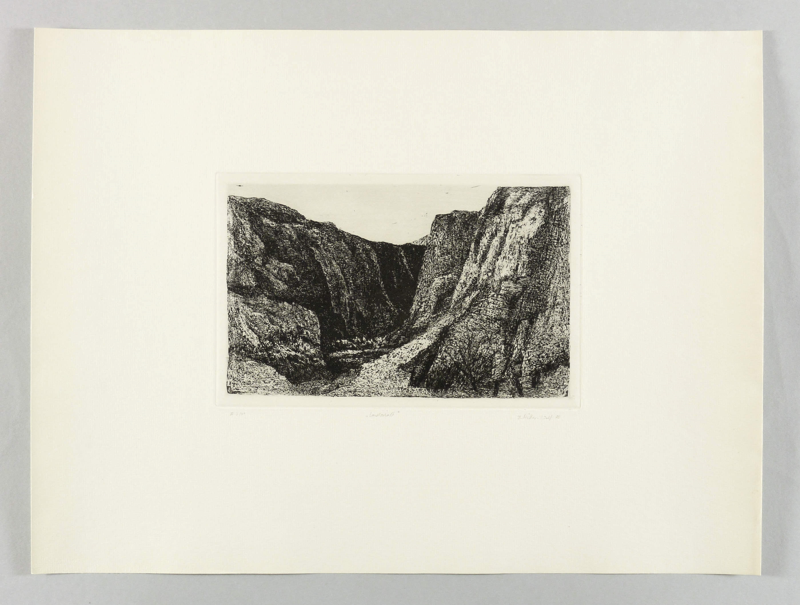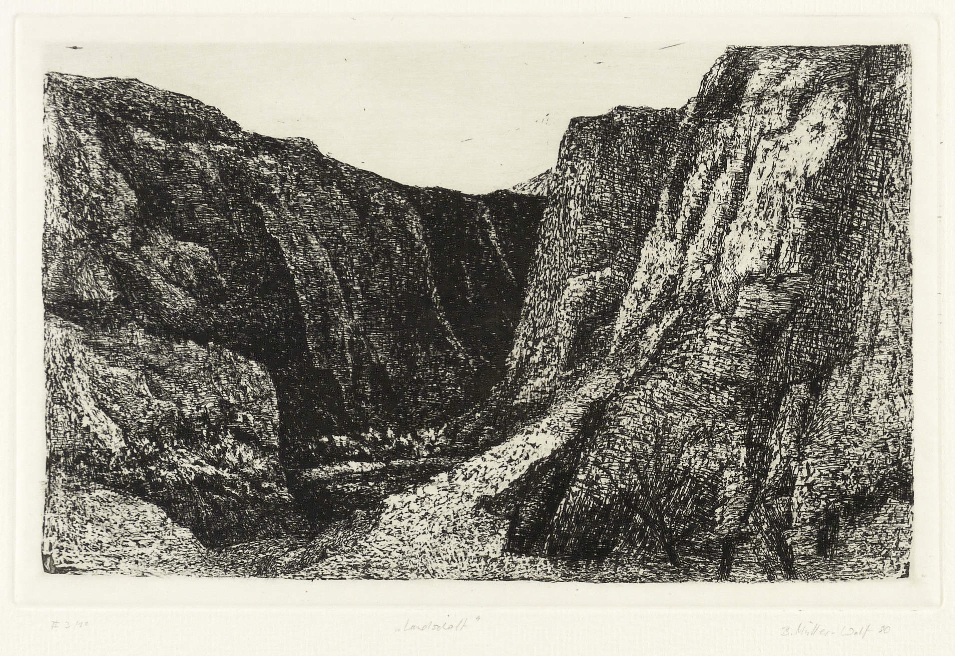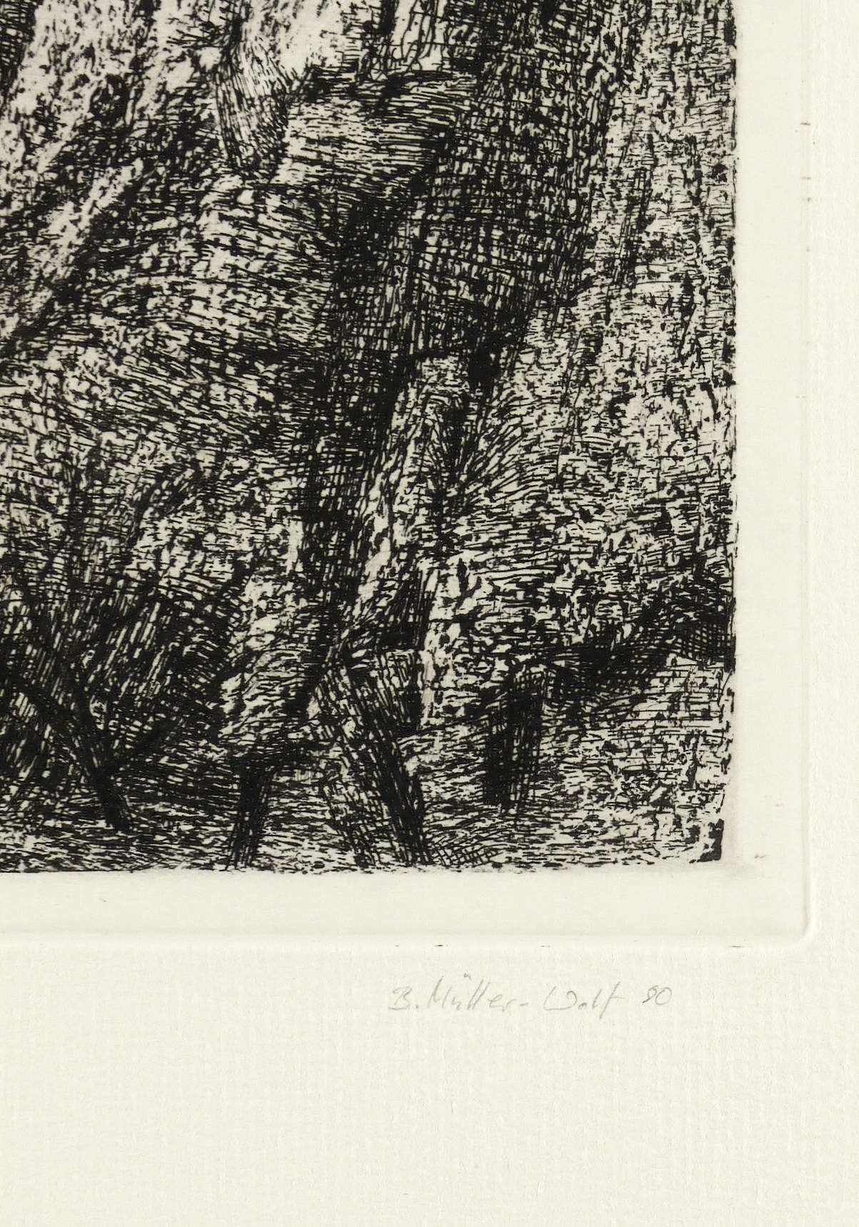 1980. Radierung / Strichätzung, in Schwarz, auf hellgelbem Büttenpapier. – Originale Künstlergrafik, von Barbara Müller-Wolf. – Auflage Exemplar Nr. 3/10. – 14,4 x 23,2 cm (Darstellung), 16,0 x 25,0 cm (Platte), 37 x 49,5 cm (Blatt).