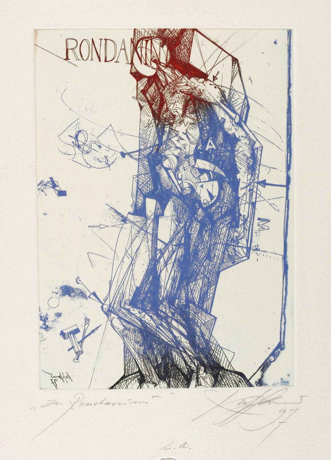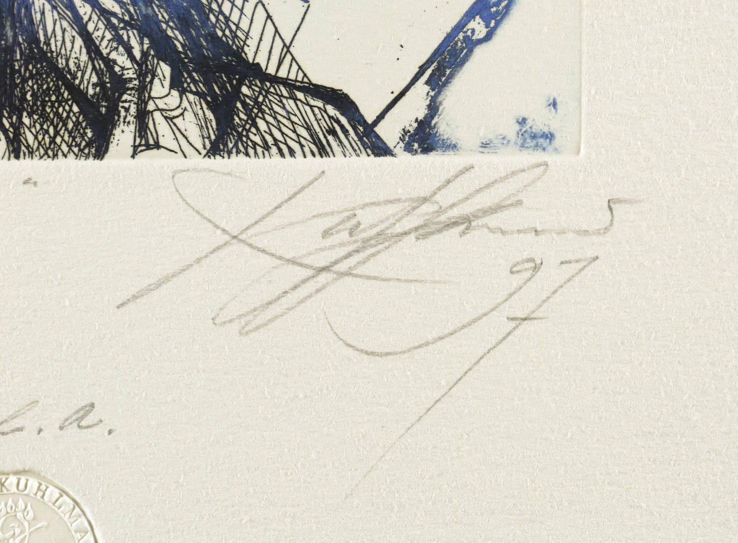 1997. Farbradierung / Strichätzung & Reservage, in Rot, Blau & Schwarz, auf hellem Velinkarton. – Von Joachim Kuhlmann. – Künstlerexemplar (e.a.). – 20,8 x 14,7 cm (Darstellung / Platte), 33 x 24 cm (Blatt).