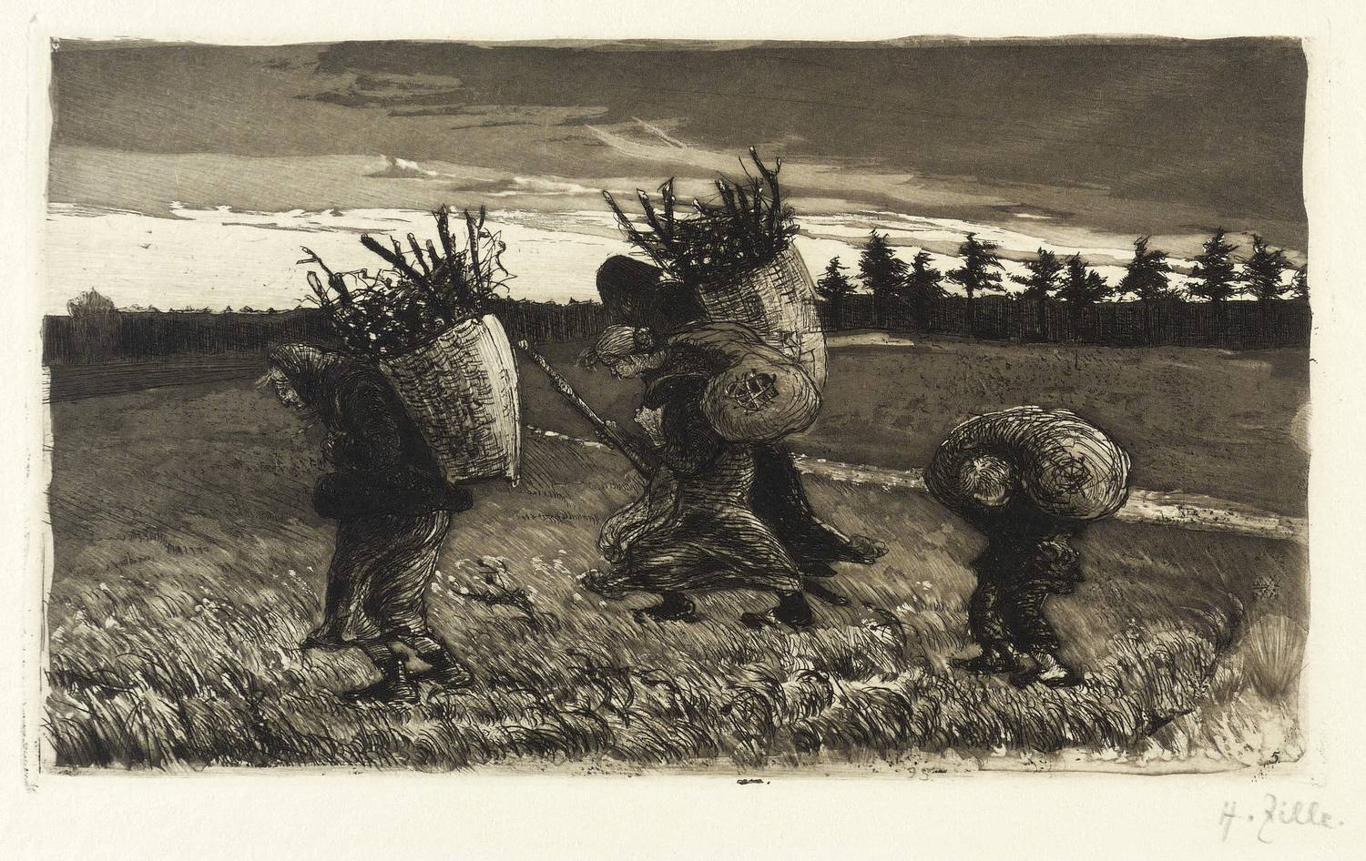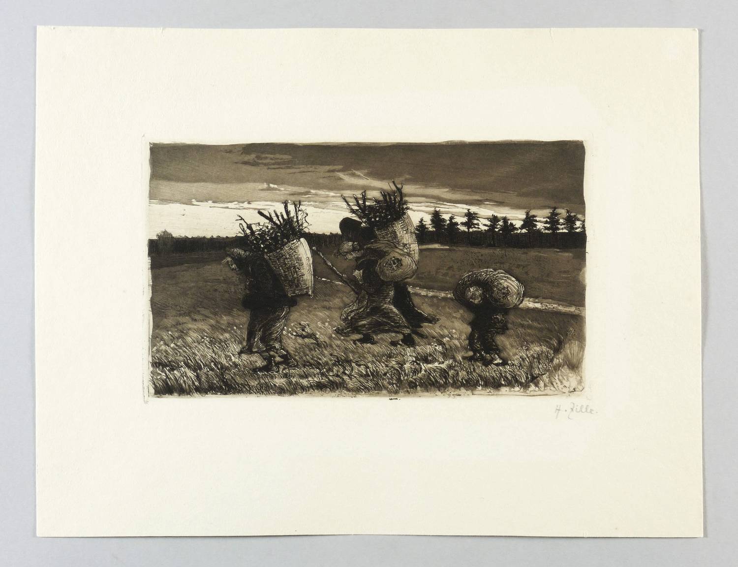 1895. Radierung / Aquatinta & Strichätzung, in Braunschwarz, auf gelbem Kupferdruckkarton. – Originale Künstlergrafik, von Heinrich Zille. – 13,2 x 22,4 cm (Darstellung / Druckbild), 13,8 x 23,1 cm (Platte), 26 x 34 cm (Blatt).