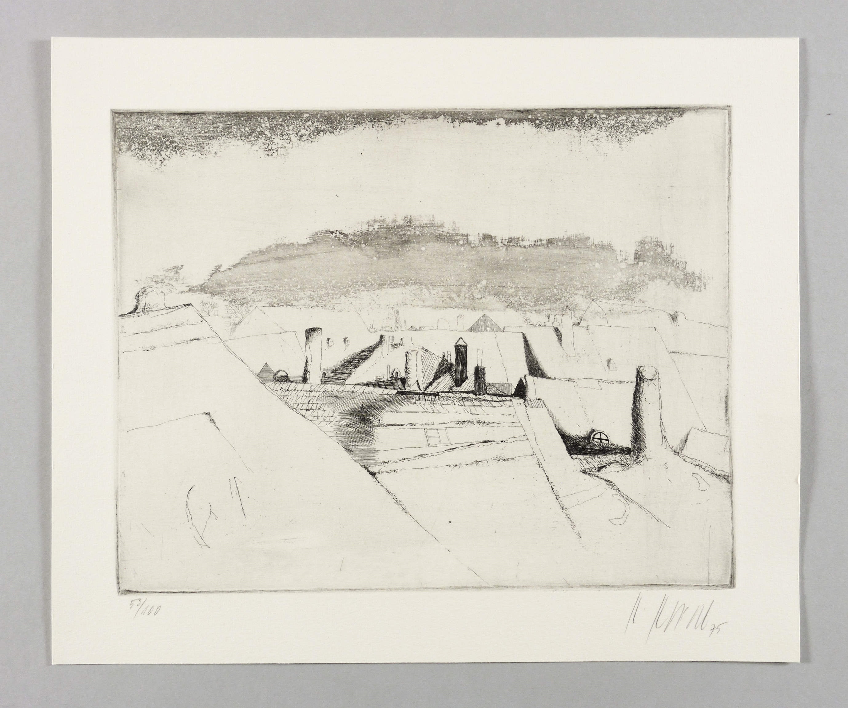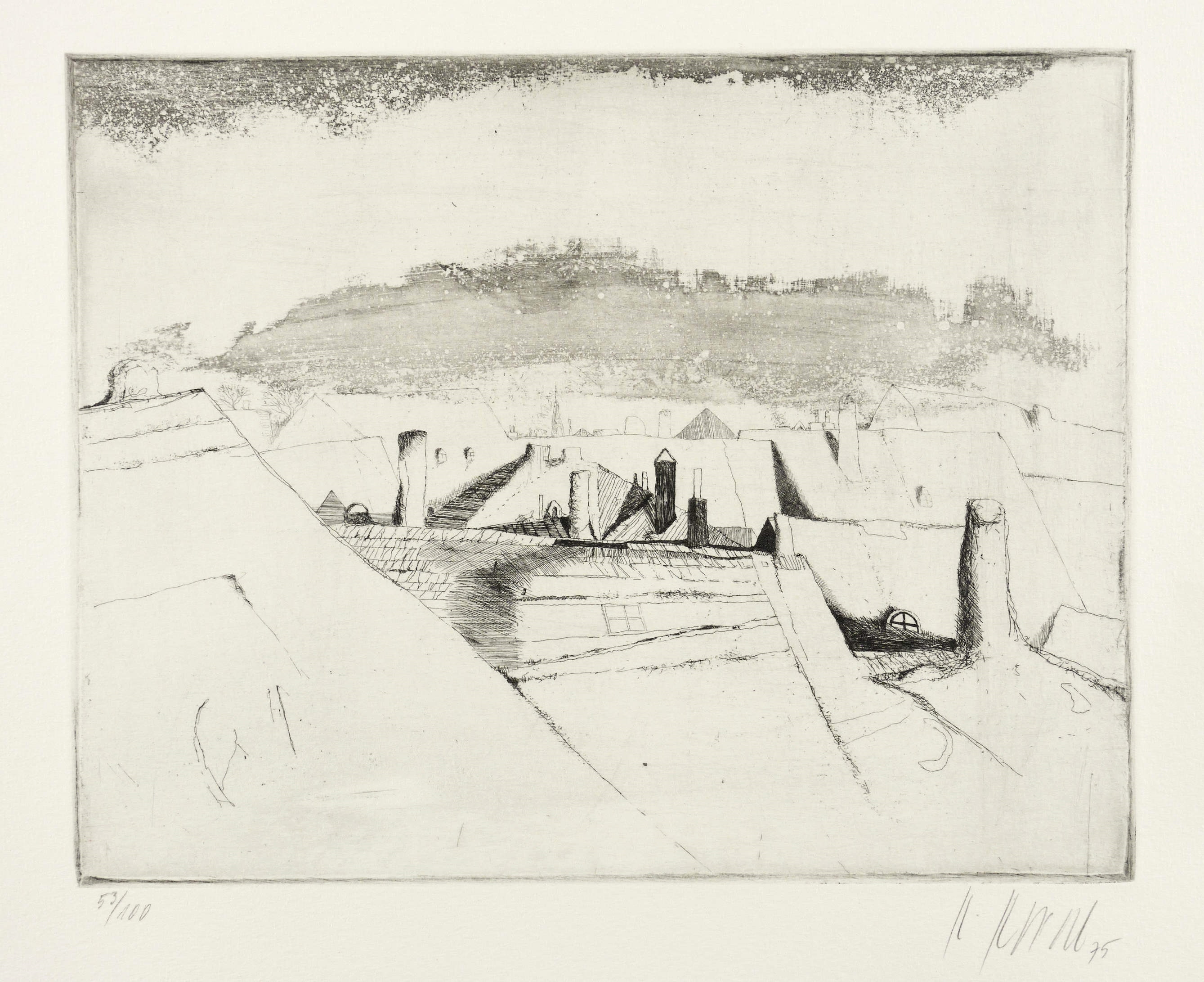 1975. Radierung / Strichätzung & Aquatinta, mit zartem Plattenton, in Schwarz, auf schwerem Hahnemühle-Bütten. – Von Karl Korab. – Auflage Exemplar Nr. 53/100. – 23,2 x 29,5 cm (Darstellung / Platte), 30 x 36 cm (Blatt).