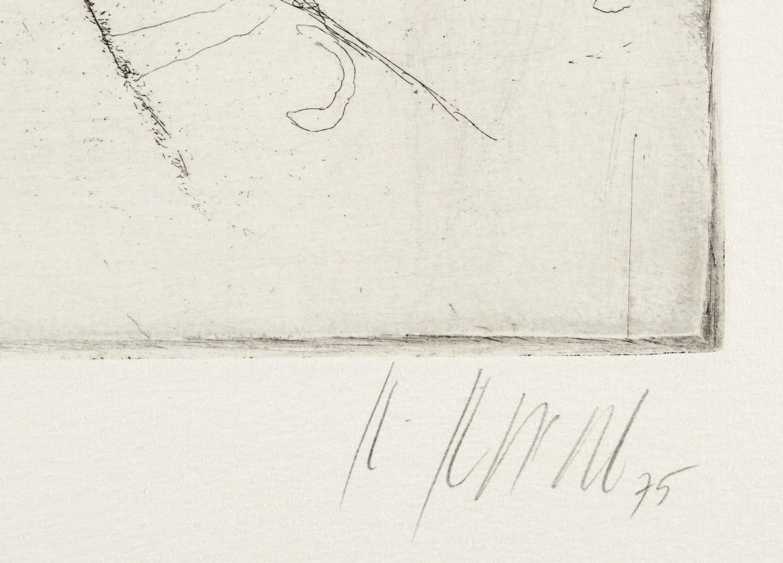 Aus: Karl Korab, 10 Radierungen zu Texten von Adalbert Stifter (Wien: Edition Tusch 1975). – Rechts unten in Bleistift signiert und datiert. Links Auflagenbezeichnung. – Blatt aus der Radierfolge ″10 Radierungen zu Texten von Adalbert Stifter″ mit illustrierenden Versuchen bzw. Adaptionen zur unvollendeten Material- und Romansammlung ″Die Mappe meines Urgrossvaters″ von Adalbert Stifter (1841). – Tadellos. Sehr guter Erhaltungszustand.
