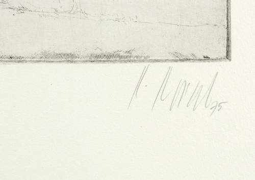 Aus: Karl Korab, 10 Radierungen zu Texten von Adalbert Stifter (Wien: Edition Tusch 1975). – Rechts unten in Bleistift signiert und datiert. Links Auflagenbezeichnung. – Blatt aus der Radierfolge ″10 Radierungen zu Texten von Adalbert Stifter″ mit illustrierenden Versuchen bzw. Adaptionen zur unvollendeten Material- und Romansammlung ″Die Mappe meines Urgrossvaters″ von Adalbert Stifter (1841). – Tadellos. Sehr guter Erhaltungszustand.
