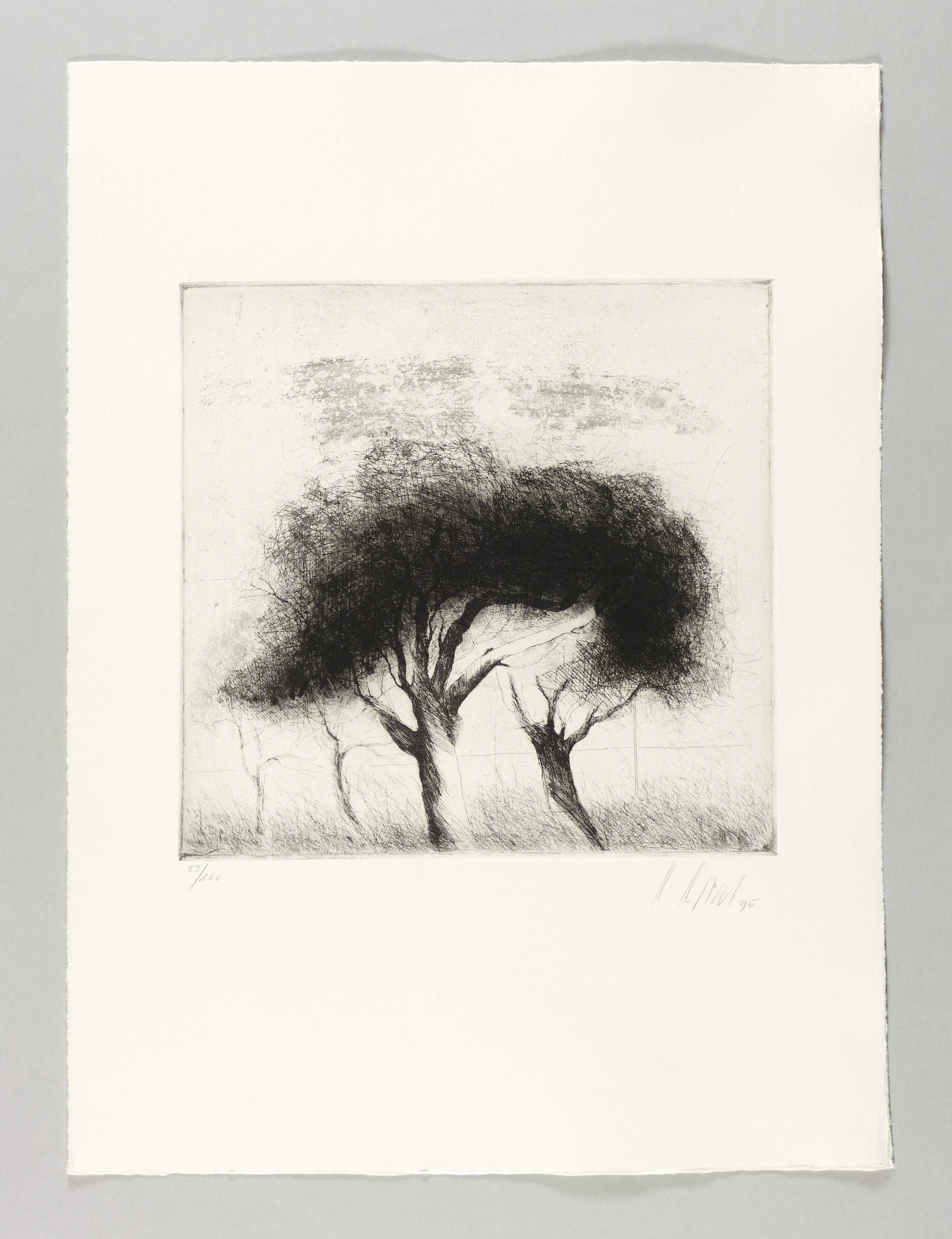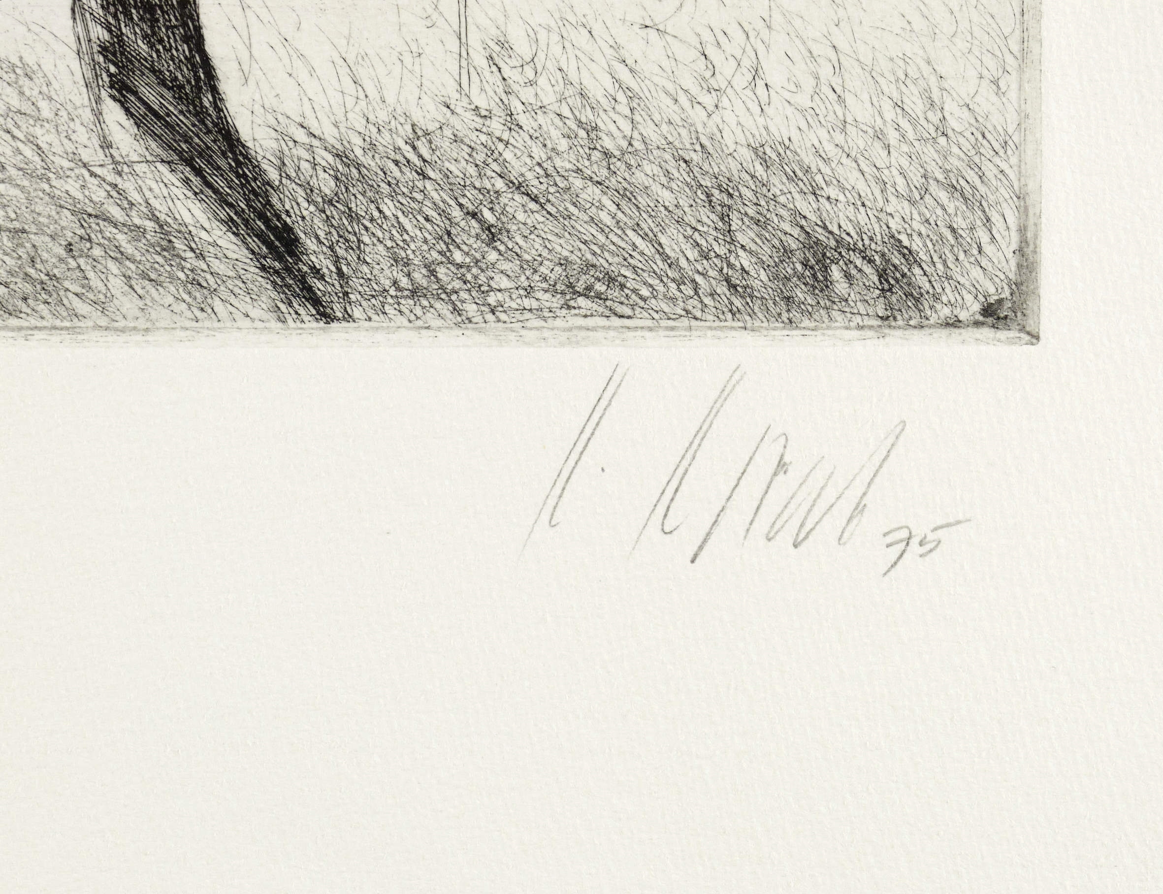 Aus: Karl Korab, 10 Radierungen zu Texten von Adalbert Stifter (Wien: Edition Tusch 1975). – Rechts unten in Bleistift signiert und datiert. Links Auflagenbezeichnung. – Blatt aus der Radierfolge ″10 Radierungen zu Texten von Adalbert Stifter″ mit illustrierenden Versuchen bzw. Adaptionen zur unvollendeten Material- und Romansammlung ″Die Mappe meines Urgrossvaters″ von Adalbert Stifter (1841). – Tadellos. Sehr guter Erhaltungszustand.