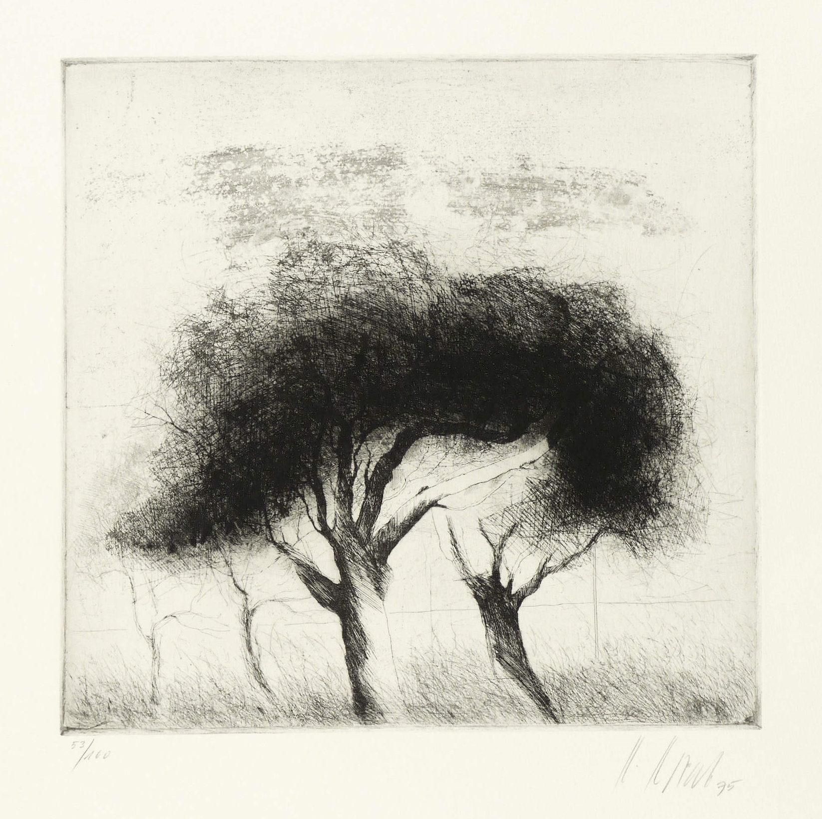 1975. Radierung / Strichätzung & Aquatinta, mit zartem Plattenton, in Schwarz, auf schwerem Hahnemühle-Bütten. – Von Karl Korab. – Auflage Exemplar Nr. 53/100. – 27,8 x 28,6 cm (Darstellung / Platte), 54 x 40 cm (Blatt).