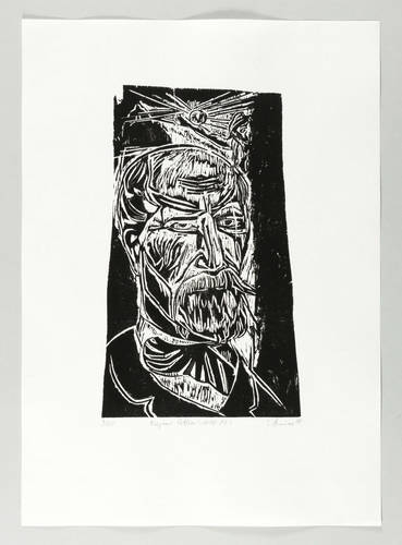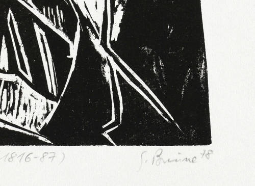 1978. Holzschnitt, in Schwarz, auf rauem weißem Japan. – Originale Künstlergrafik, von Gudrun Brüne. – Auflage Exemplar Nr. 3/60. – 31,5 x 18,9 cm (Darstellung), 48 x 34 cm (Blatt).