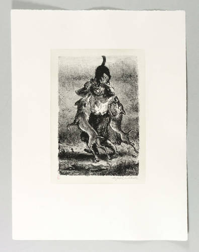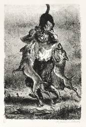 Nicht bei Arp. – Links unten in der Tonplatte Stempel in Rot mit dem Signet der Clan- Presse (ehem. Widerstandskreis). Rechts Stempel-Signatur. Verso Nachlass-Stempel mit Signatur vom Sohn Christian Weber in Bleistift. – Um 1925 plante Weber eine Holzschnitt-Folge zum Schelmenroman ″Der abenteuerliche Simplicissimus″ von Grimmelshausen. 1967- 69 setzte er die bis dahin entstandenen Vorarbeiten dann als Folge von 45 Lithografien um (Gütersloh: Bertelsmann 1971). Einblattdrucke aus der Entstehungszeit sind selten. Hier die gängige 1984 für die Edition Griffelkunst aus dem Nachlass herausgegebene Originallithografie (W 78). – Sehr guter Zustand.