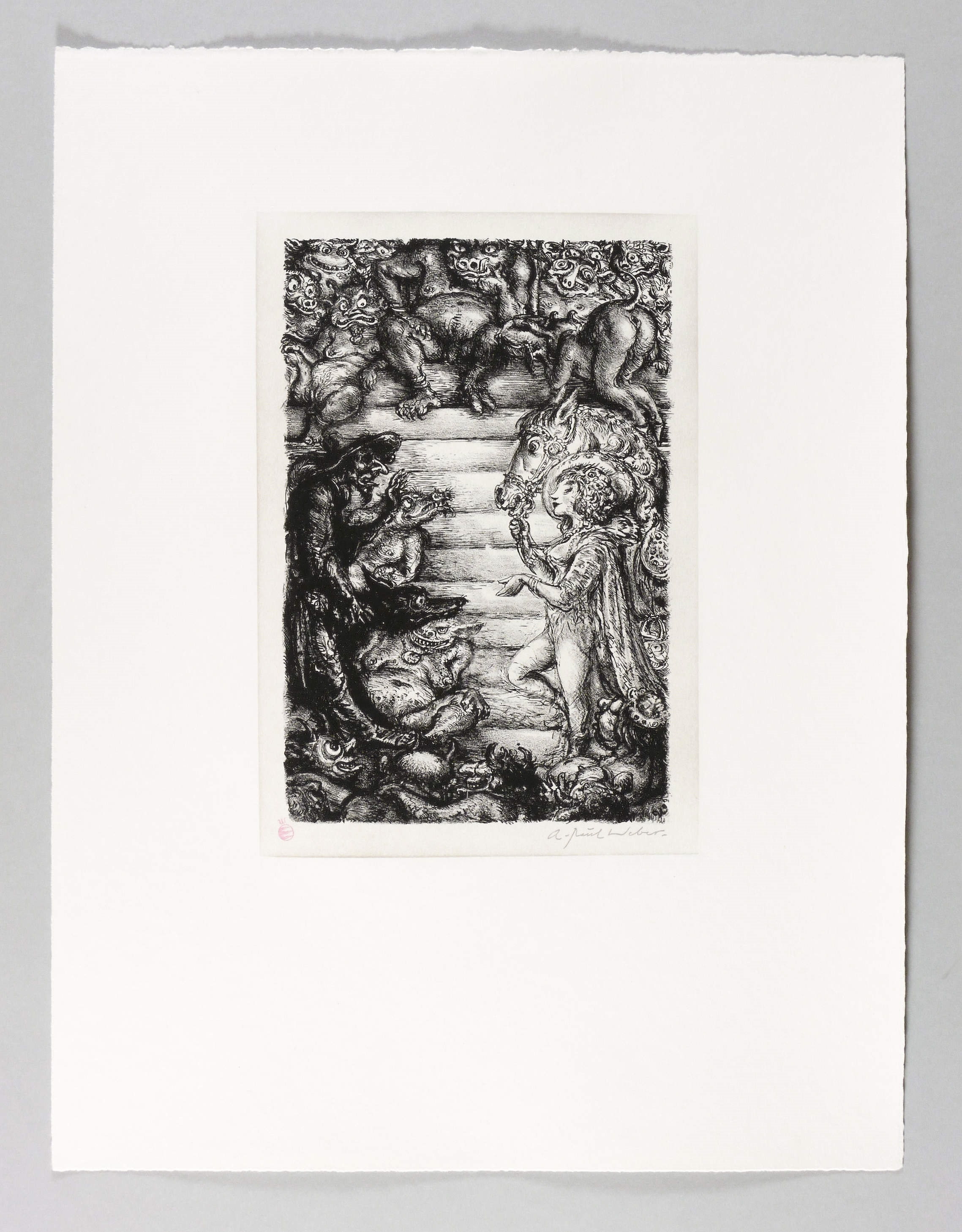 Nicht bei Arp. – Links unten in der Tonplatte Stempel in Rot mit dem Signet der Clan- Presse (ehem. Widerstandskreis). Rechts Stempel-Signatur. Verso Nachlass-Stempel mit Signatur vom Sohn Christian Weber in Bleistift. – Um 1925 plante Weber eine Holzschnitt-Folge zum Schelmenroman ″Der abenteuerliche Simplicissimus″ von Grimmelshausen. 1967- 69 setzte er die bis dahin entstandenen Vorarbeiten dann als Folge von 45 Lithografien um (Gütersloh: Bertelsmann 1971). Einblattdrucke aus der Entstehungszeit sind selten. Hier die gängige 1984 für die Edition Griffelkunst aus dem Nachlass herausgegebene Originallithografie (W 75). – Ohne jeden Tadel. Sehr guter Zustand.