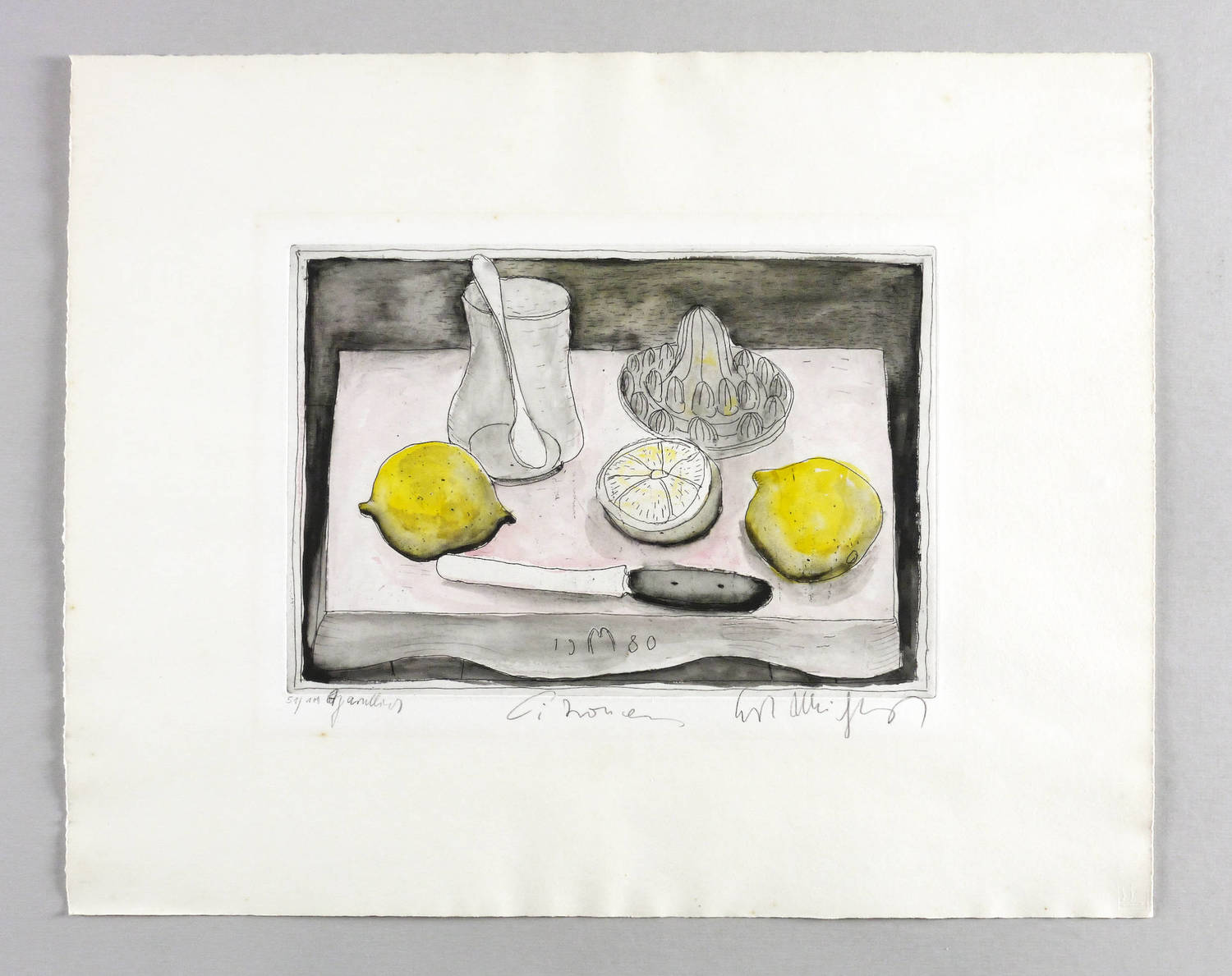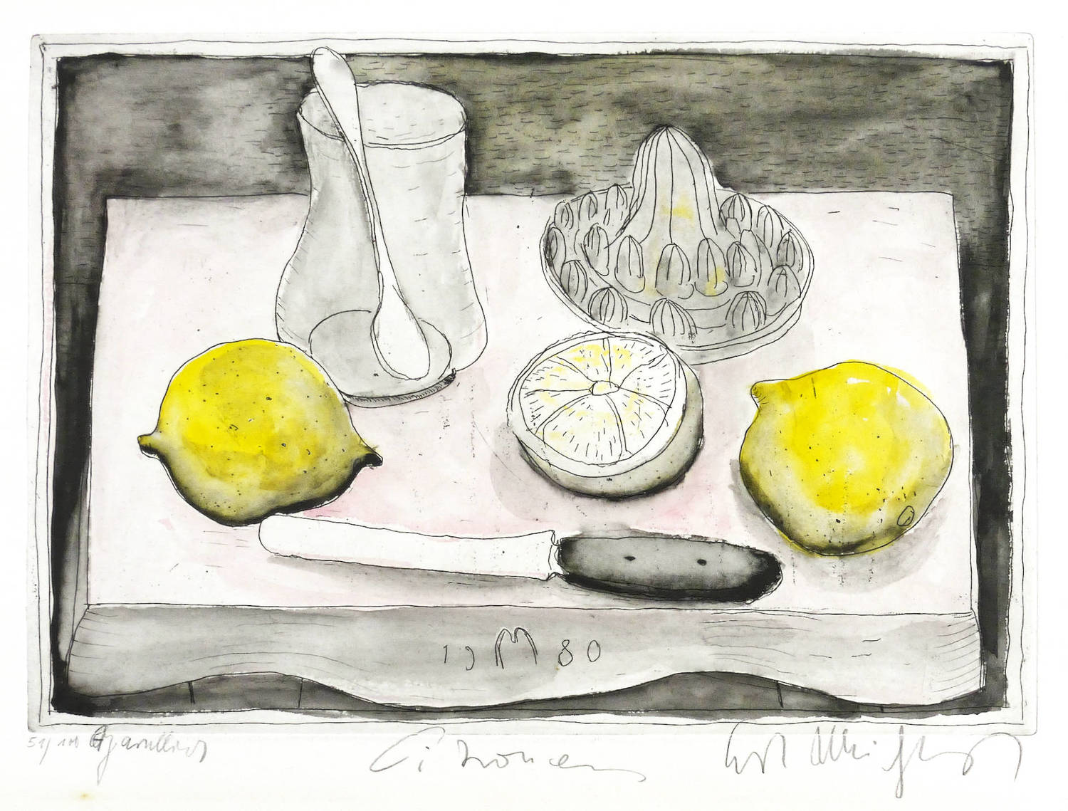 Rechts unten in Bleistift signiert: ″Curt Mühlenhaupt″. Links Auflagenbezeichnung: ″51/100″. Dazu bezeichnet: ″aquarelliert / Citronen″. In der Platte unten zusätzlich Monogramm und Jahr. – Originalrandiges Exemplar. Leichter Lichtrand außerhalb der Darstellung. Insgesamt mäßig guter Zustand.