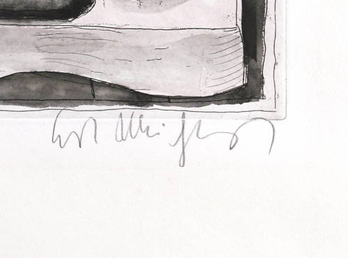 1980. Radierung / Strichätzung, aquarelliert, auf hellgelbem Velin. – Originale Künstlergrafik, von Kurt Mühlenhaupt. – Auflage Exemplar Nr. 51/100. – 20,8 x 29,8 cm (Darstellung / Platte), 40 x 50 cm (Blatt).