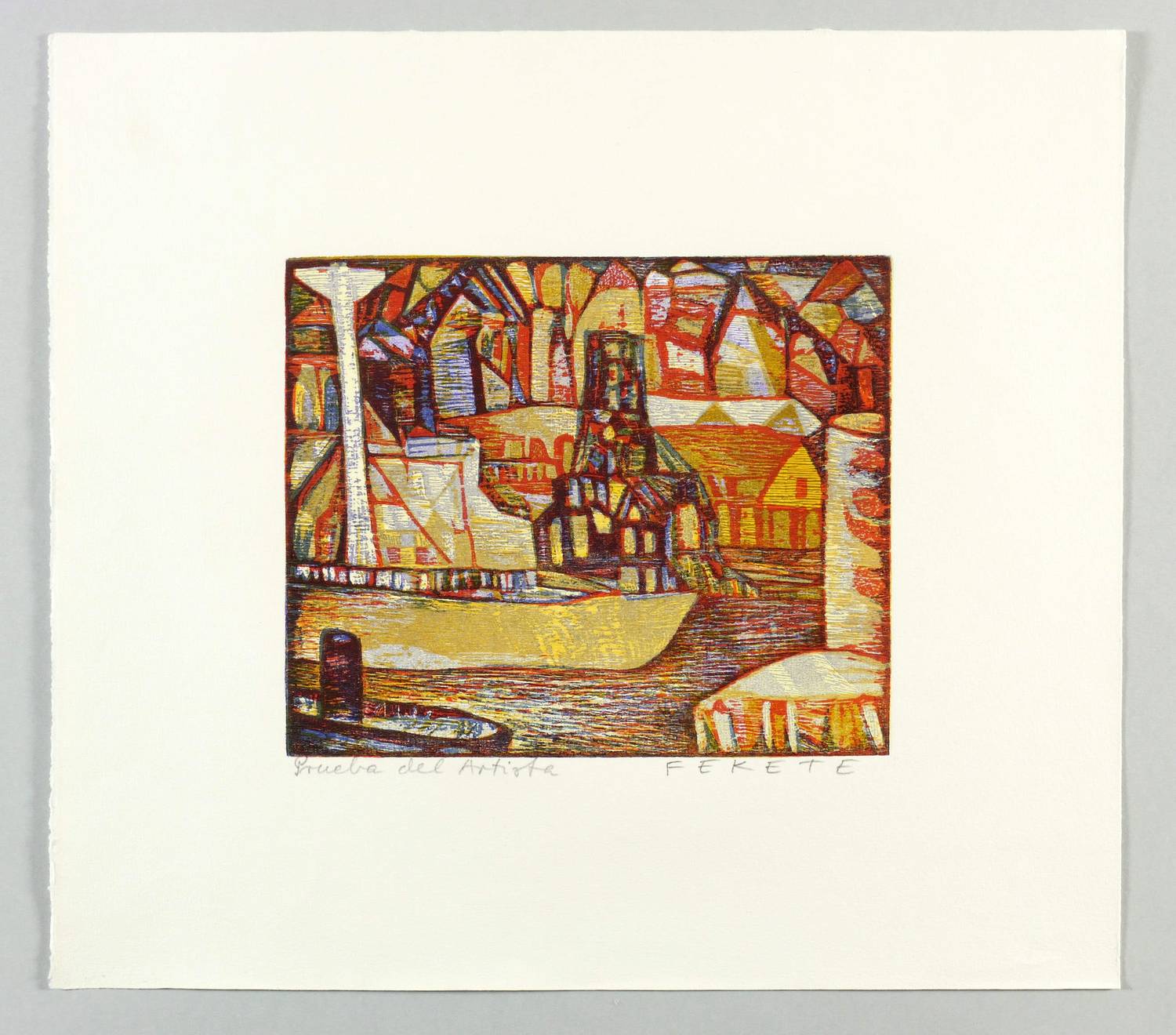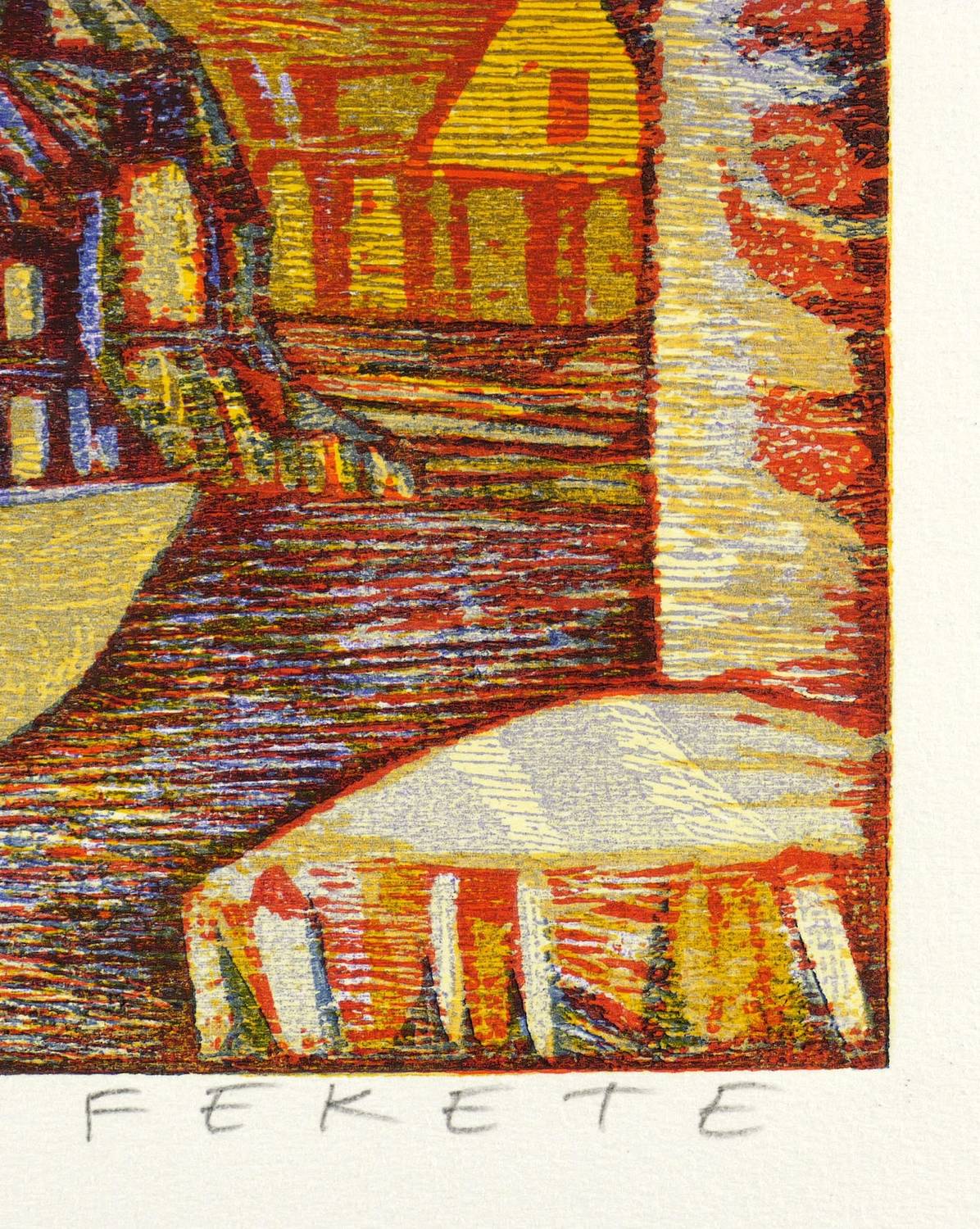 Esteban Fekete (1924 Cinkota / Budapest - 2009 Dieburg). Deutsch-argentinischer Maler, Zeichner und Grafiker. Arbeitete in verschiedenen Techniken wie Öl und Tempera, aber auch in Mischtechniken auf Papier, Holz oder Hartfaser. Anfang der 1970er Jahre entstanden Email-Bilder, Zeichnungen und Linolschnitt. Seine ureigene Technik ist allerdings der Holzschnitt, insbesondere der Farbholzschnitt, mit dem er sich einen Namen machte. So entwickelte er eine eigene Schnitt- und Bearbeitungstechnik für die Holzplatten. Für die Farbgebung verwendete er eigens dafür gesuchte Ölfarben.