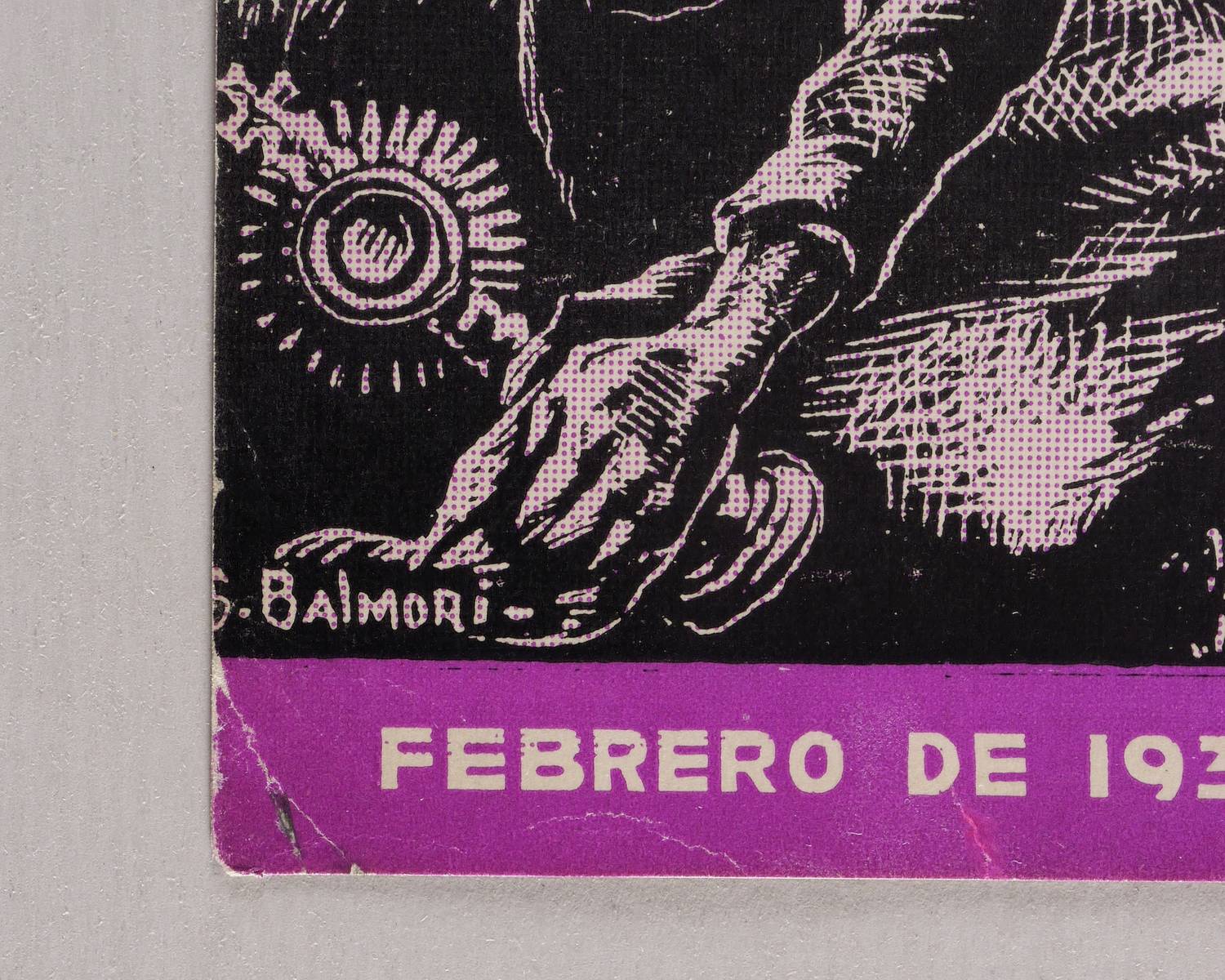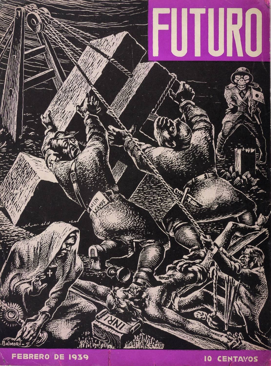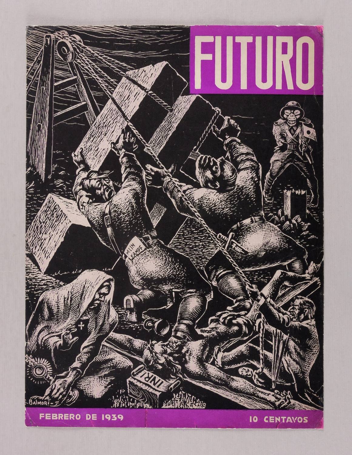 Aus: Futuro (Mexiko: Universidad Obrera de Mexico 1939), Bd. 36. – Nicht handsigniert. In der Druckform links unten geschnittene Signatur: ″S. BALMORI″. Weitere Inschriften: ″FUTURO // MEIN KAMPF // INRI // FEBRERO″. – Darstellung der Aufrichtung eines monumentalen Hakenkreuzes auf dem Golgata-Berg über dem abgebrochenen Kreuz Christi mit dem Gekreuzigten. – Umschlag- und Titelgestaltung für das antifaschistische Magazin ″Futuro″ in Mexiko. – Provenienz: Sammlung Gerlint Söder & Erhard Frommhold, Dresden. – Die etwas bestoßenen Ecken fachgerecht restauriert und gefestigt. INsgesamt schöner Gesamteindruck. Guter Zustand.