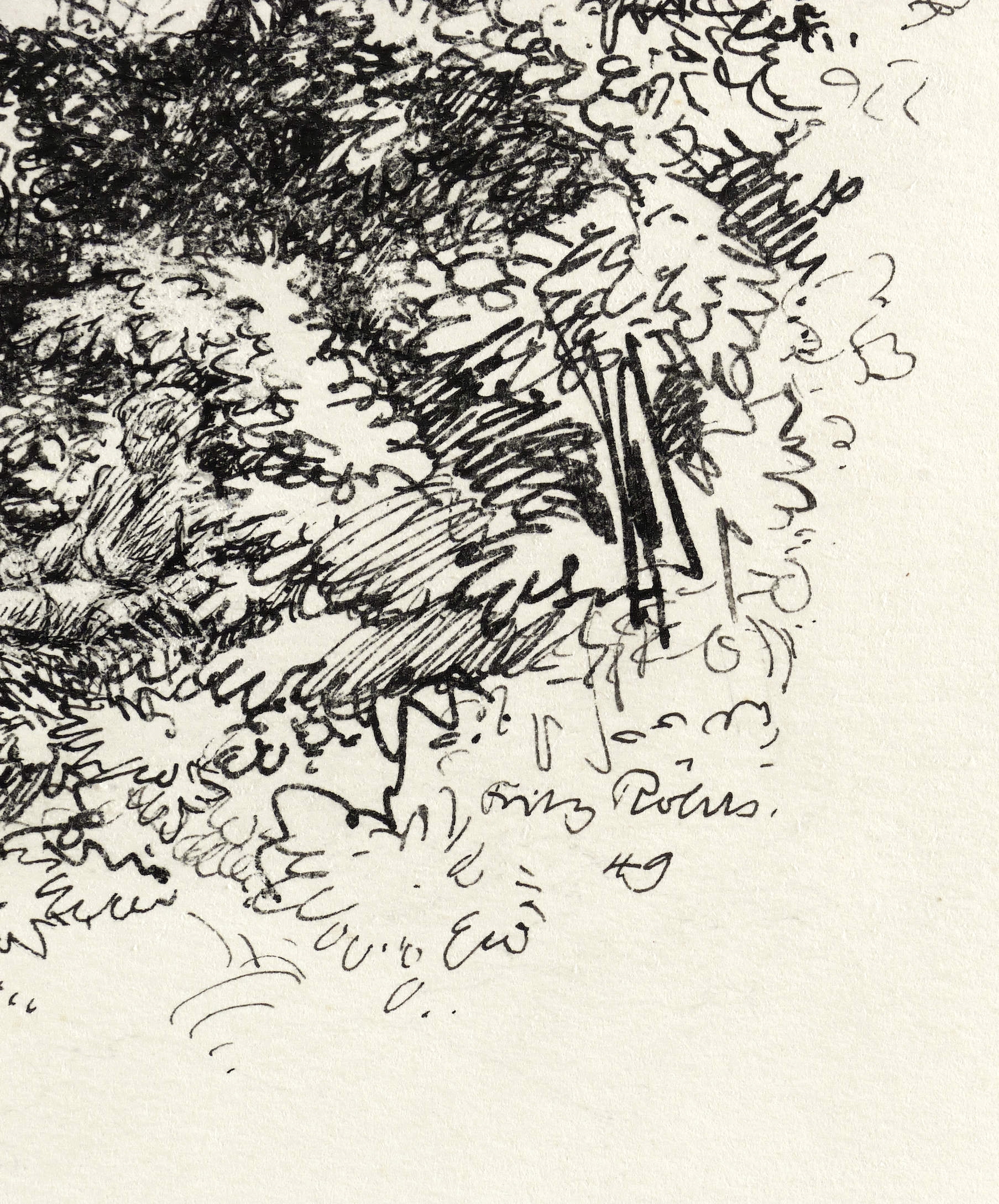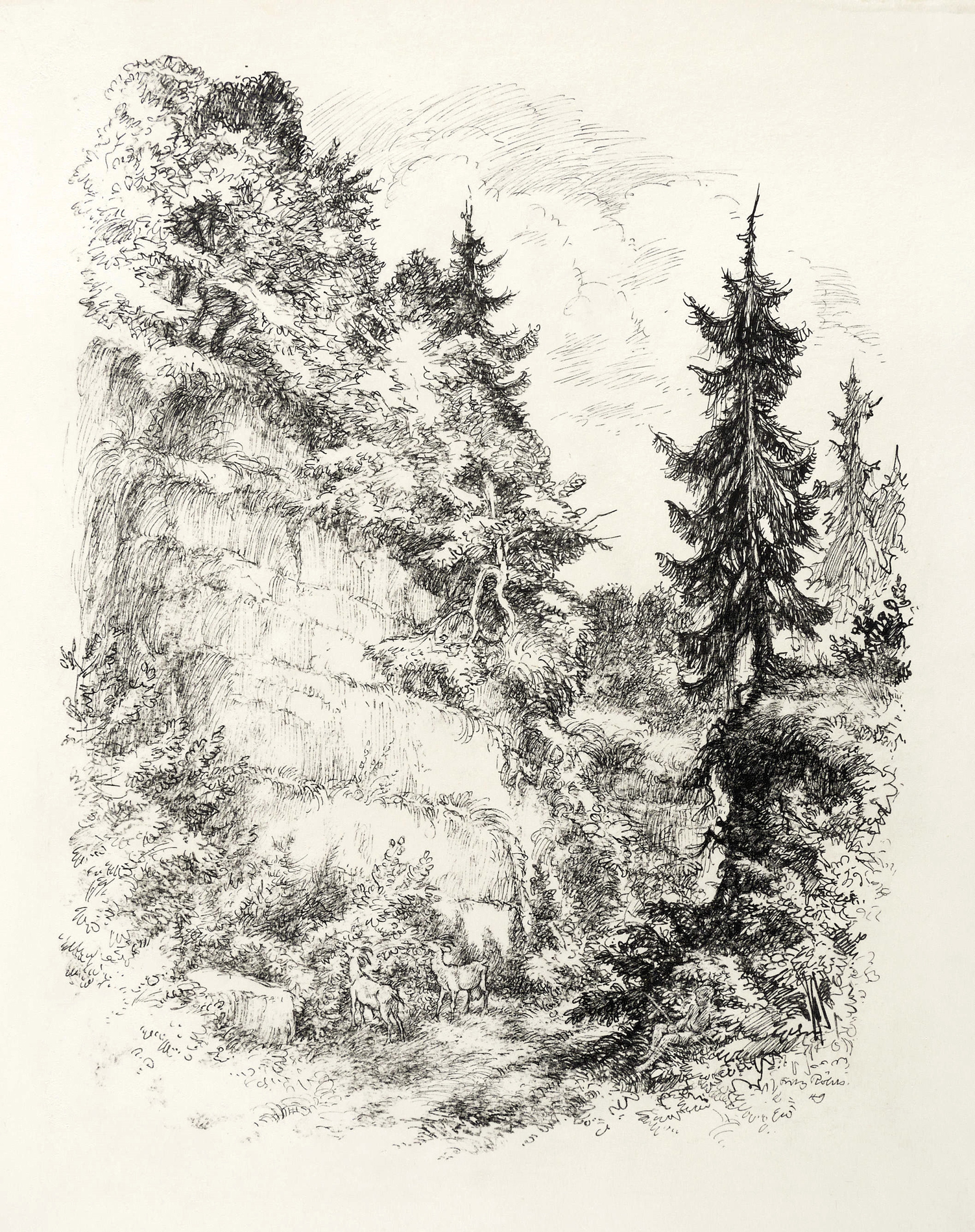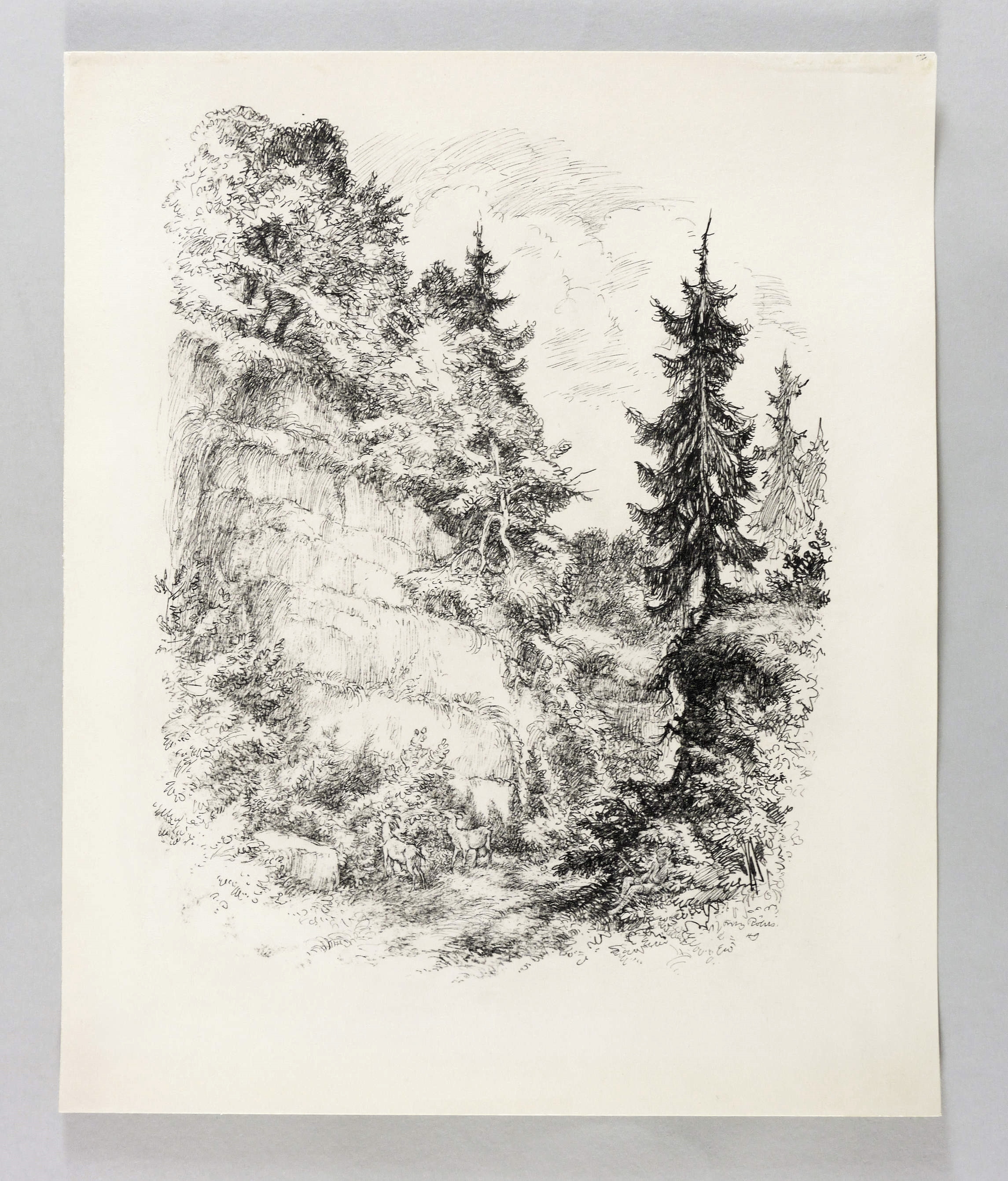 In der Darstellung rechts unten in schwarzer Feder signiert und datiert: ″Fritz Röhrs 49″. – Zeitlose oder -vergessene Schilderung einer Naturidylle mit Anklängen an die Spätromatik eines Adrian Ludwig Richter. – Äußerer Blattrand oben mit leichten Montagespuren. Sonst tadellos und ohne Mängel. Sehr guter Zustand.