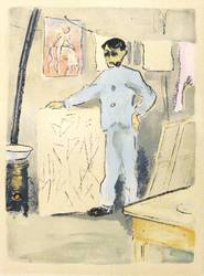 Juffermans B 13. – Aus: Roland Dorgelès, Au beau temps de la Butte (Paris: Nouvelle Librairie de France 1949). – Nicht signiert. Verso typografisch bezeichnet: ″Pablo Picasso au temps de l'Époque bleue″. Im unteren Blattrand in Bleistift bezeichnet: ″VAN DONGEN / LITHOGRAPHIE ORIGINALE″. – Blatt 7 der 20 ganzseitigen originalgrafischen Illustrationen von Kees van Dongen zu den Erinnerungen ″Au beau temps de la Butte″ von Roland Dorgelès (Paris: Nouvelle Librairie de France 1949). - Limitierte Auflage von 25 auf Arches gedruckten Exemplaren. - Sowohl der Text als auch die Bilder speisen sich aus Erinnerungen an das Bateau-Lavoir, den Freundeskreis um Pablo Picasso und das Leben auf dem Montmarte. – Leichter Lichtrand um die Darstellung. Insgesamt recht guter Zustand.