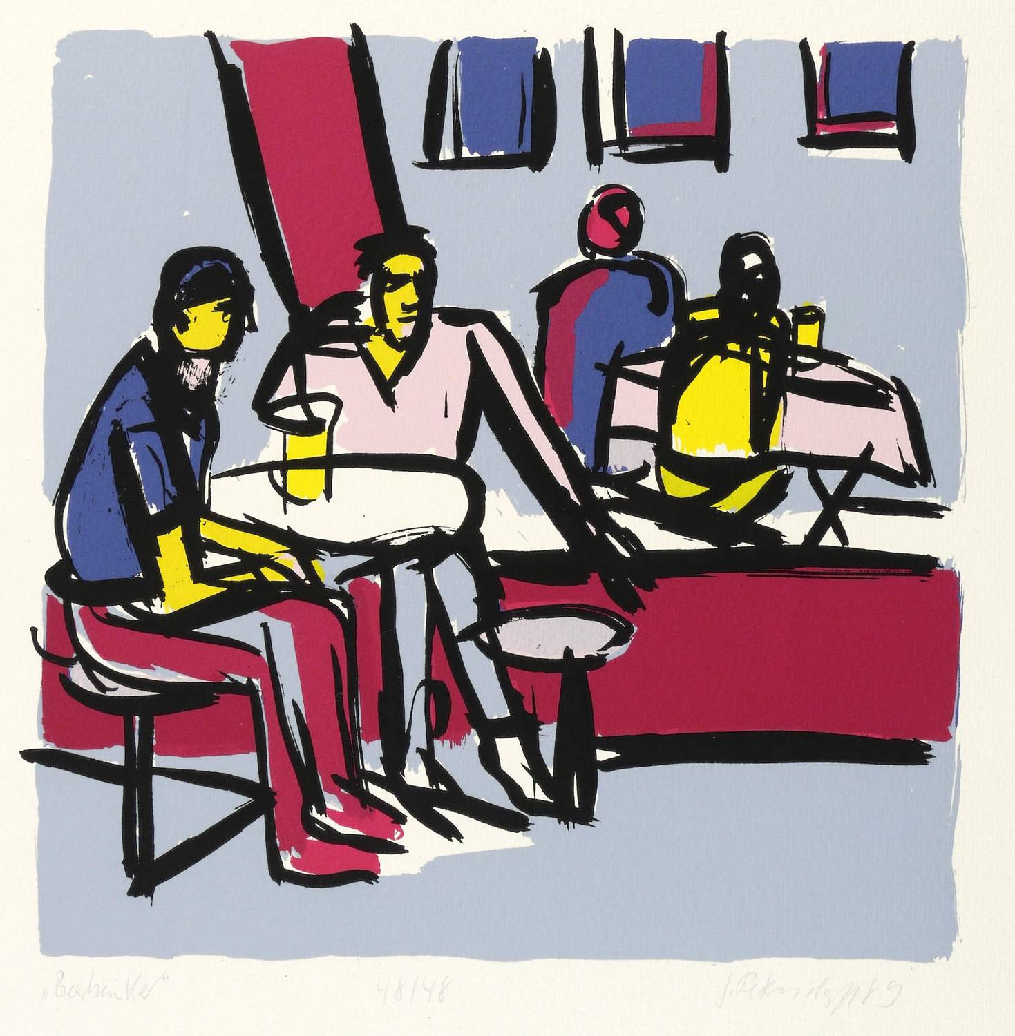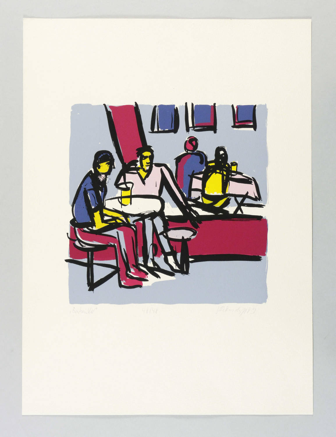 1989. Farbsiebdruck / Farbserigrafie, in 6 Farben, auf gehämmertem Maschinenbütten. – Originale Künstlergrafik, von Gudrun Petersdorff. – Auflage Exemplar Nr. 48/48. – 25,8 x 26,0 cm (Darstellung), 51 x 37 cm (Blatt).