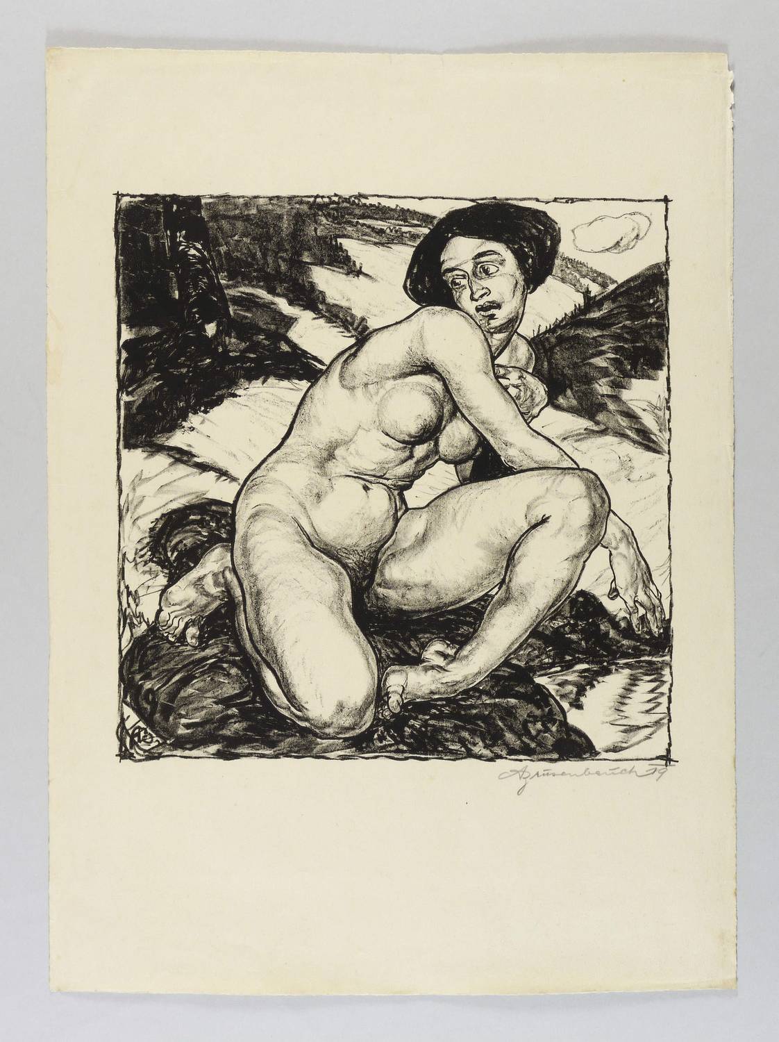 Brusenbauch, Arthur. – „Kauernder Akt in der Landschaft”.