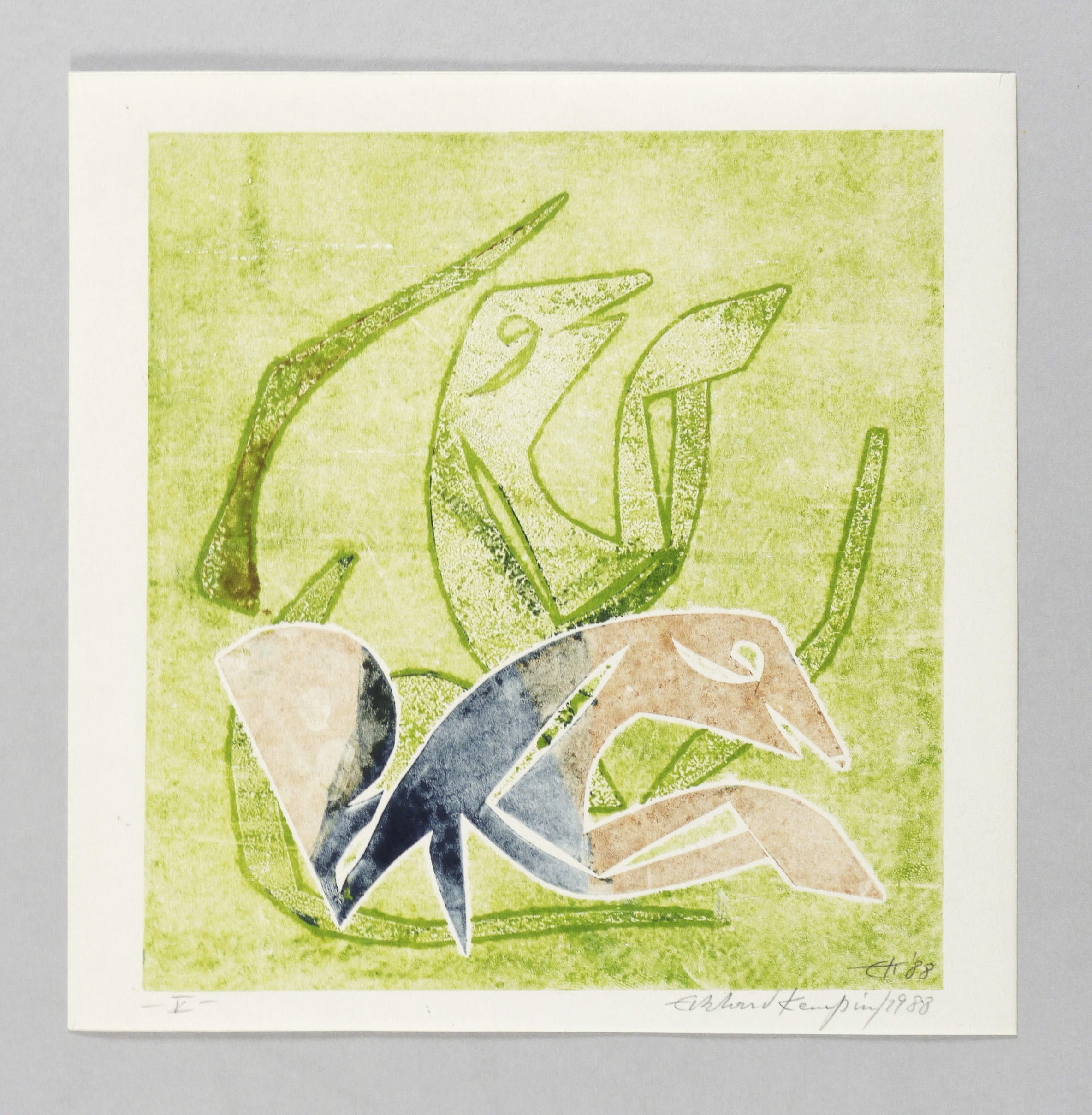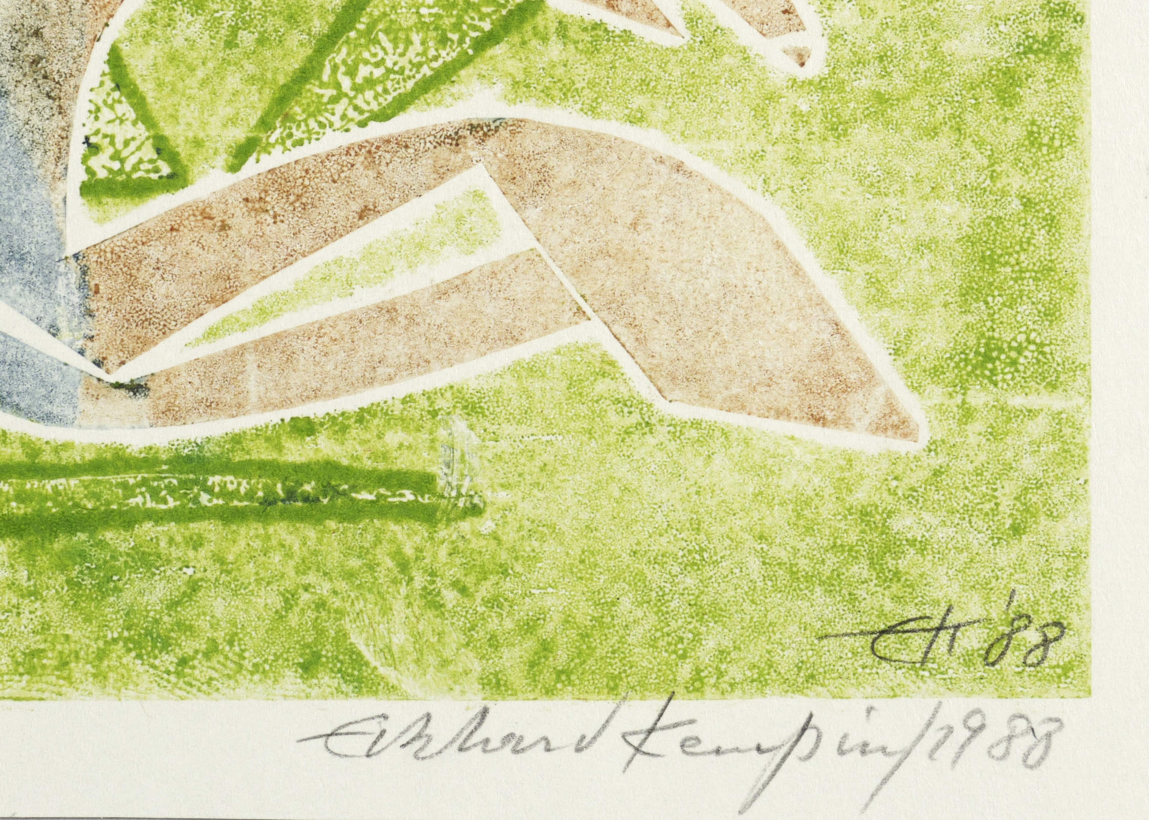 1988. Farbmonotypie, in 4 Farben, auf leichtem weißem Maschinenpapier. – Originale Künstlergrafik, von Eckhard Kempin. – 18,7 x 17,4 cm (Darstellung), 21 x 20,5 cm (Blatt).