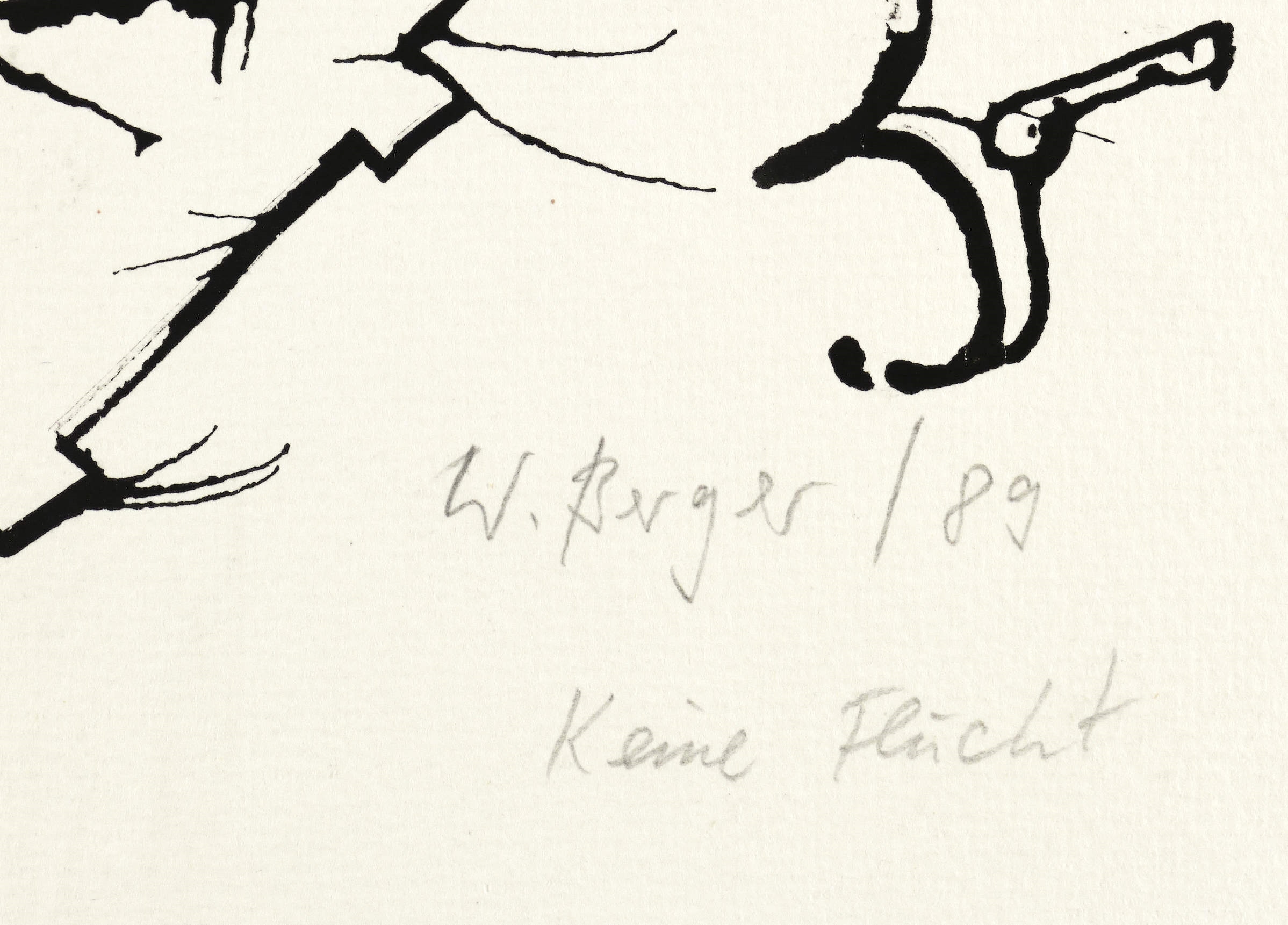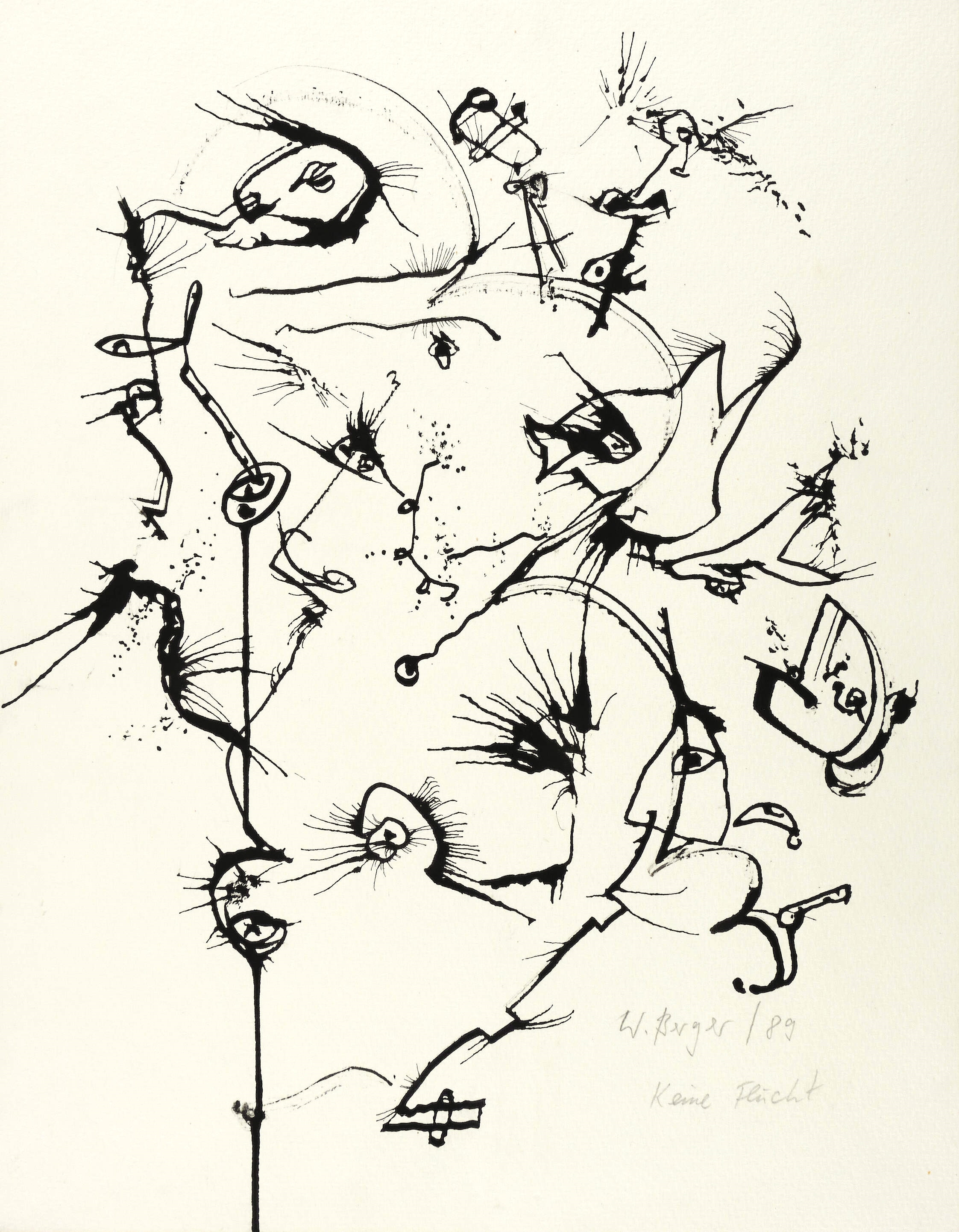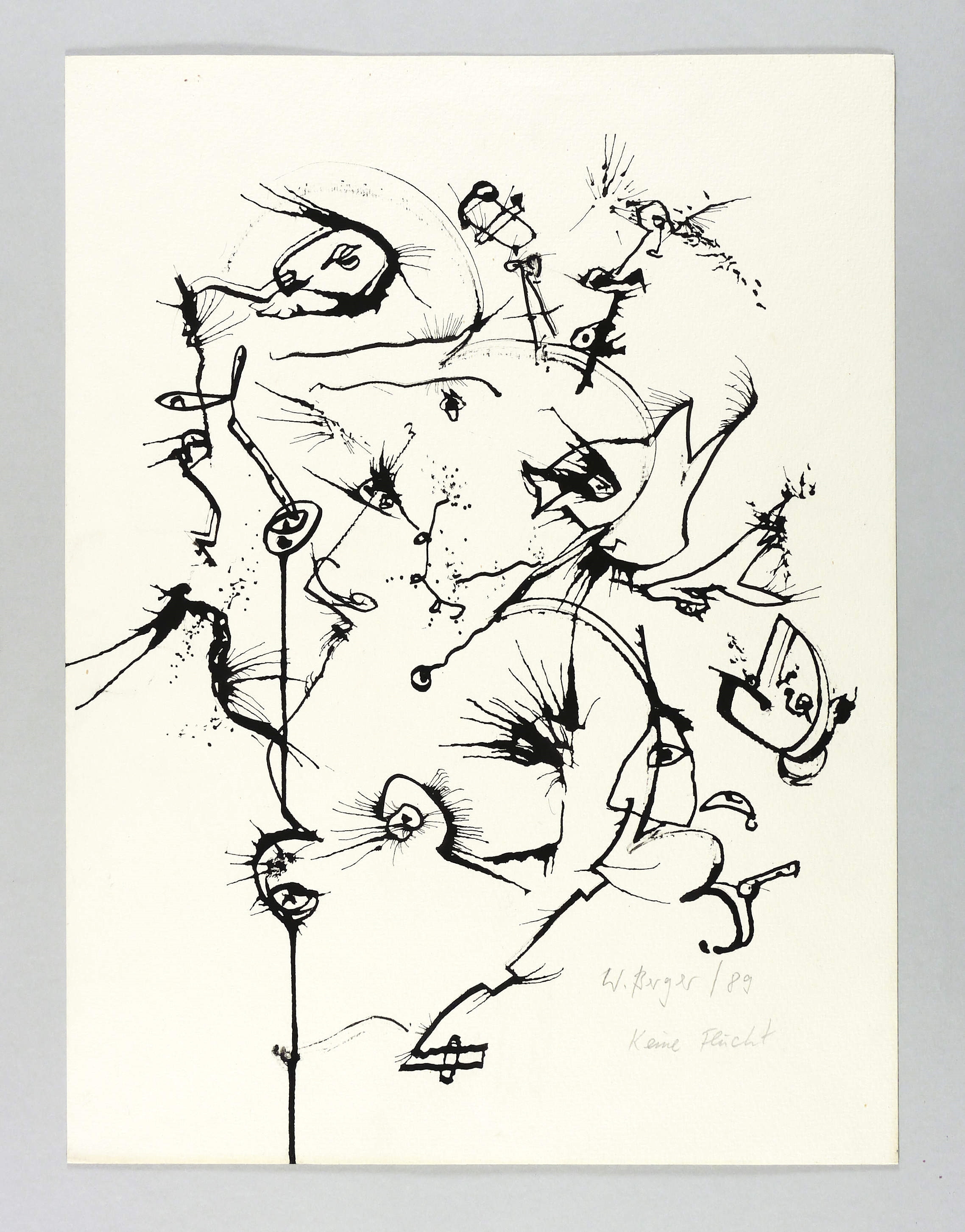 1989. Zeichnung / Feder- & Pinselzeichnung, in schwarzer Tusche, auf gehämmertem hellgelbem Karton. – Originale Künstlergrafik, von Wolfgang Berger. – Unikat. – 44,4 x 34,2 cm (Darstellung), 48 x 36 cm (Blatt).