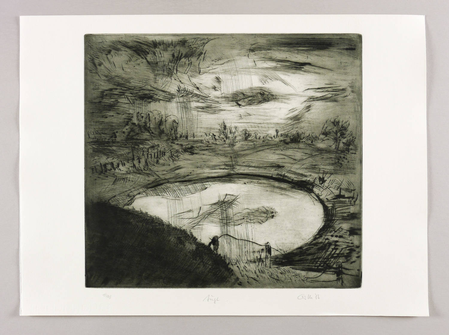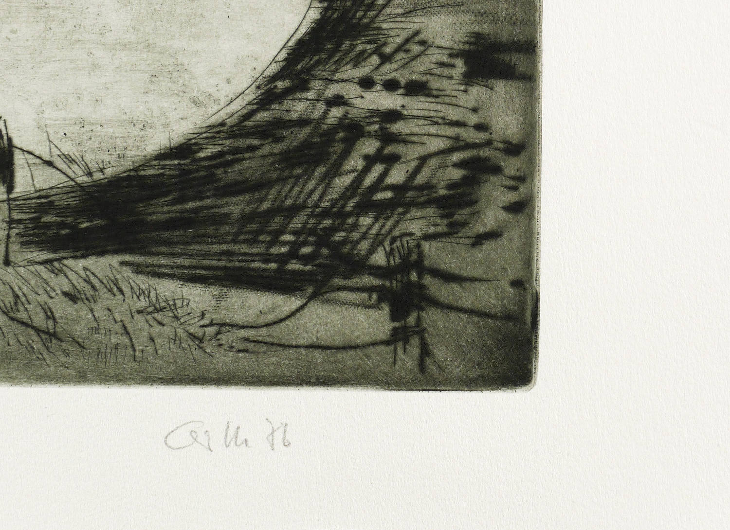 Aus: Sighard Gille, auge ufer hain. Sechs Radierungen, gewidmet Wassili Schukschin (Leipzig: Reclam 1987). – Rechts unten in Bleistift signiert und datiert: ″Gille 86″. Links Auflagenbezeichnung: ″18/110″. Mittig Titel: ″Auge″. – Sehr gut erhalten.
