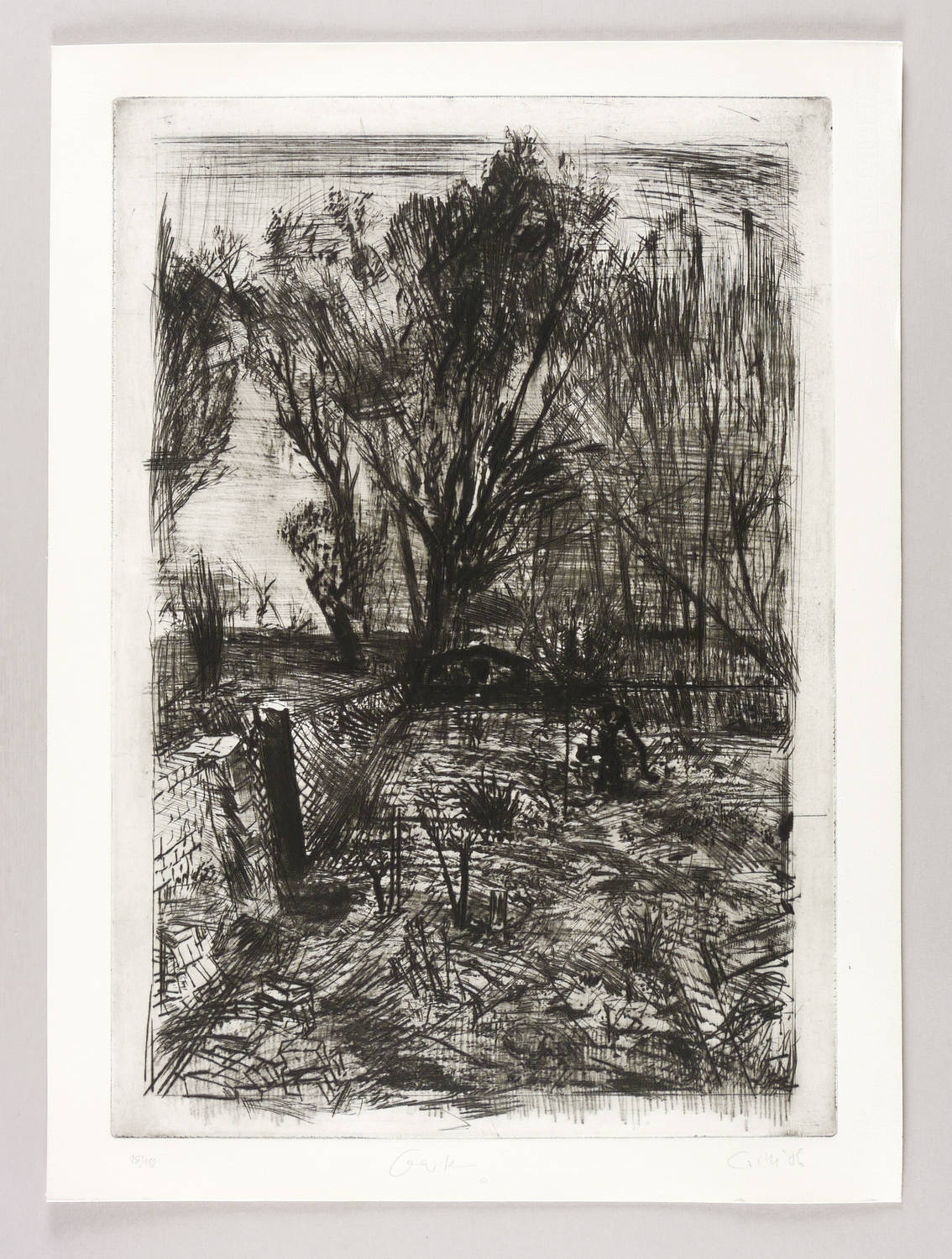 Aus: Sighard Gille, auge ufer hain. Sechs Radierungen, gewidmet Wassili Schukschin (Leipzig: Reclam 1987). – Rechts unten in Bleistift signiert und datiert: ″Gille 86″. Links Auflagenbezeichnung: ″18/110″. Mittig Titel. – Sehr gut erhalten.