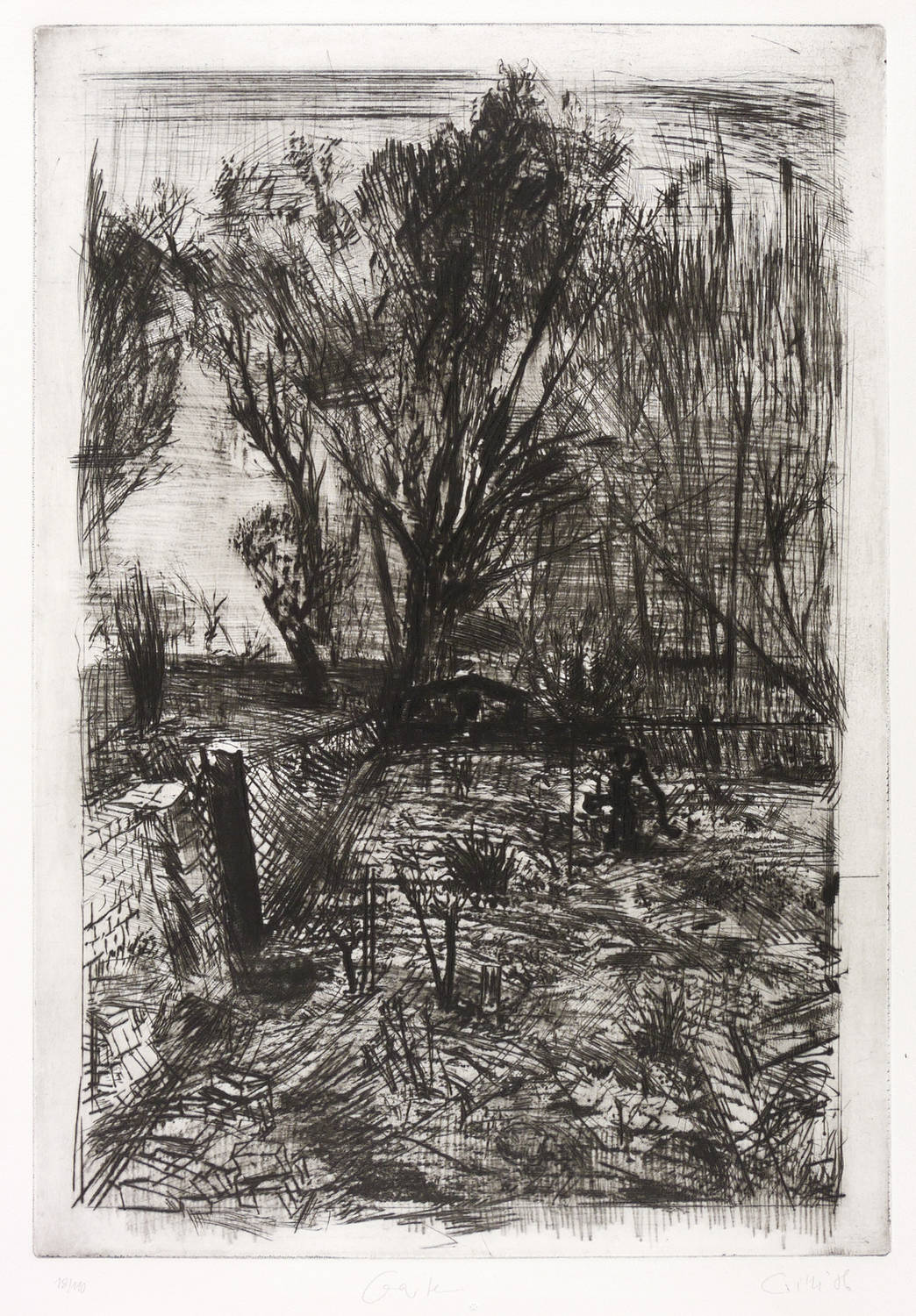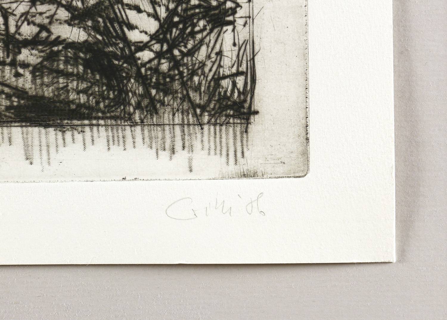 1986. Radierung / Roulette & Kaltnadel, in Schwarz, auf schwerem hellchamois Velin. – Originale Künstlergrafik, von Sighard Gille. – Auflage Exemplar Nr. 18/110. – 47,4 x 33,0 cm (Darstellung / Platte), 53 x 39 cm (Blatt).
