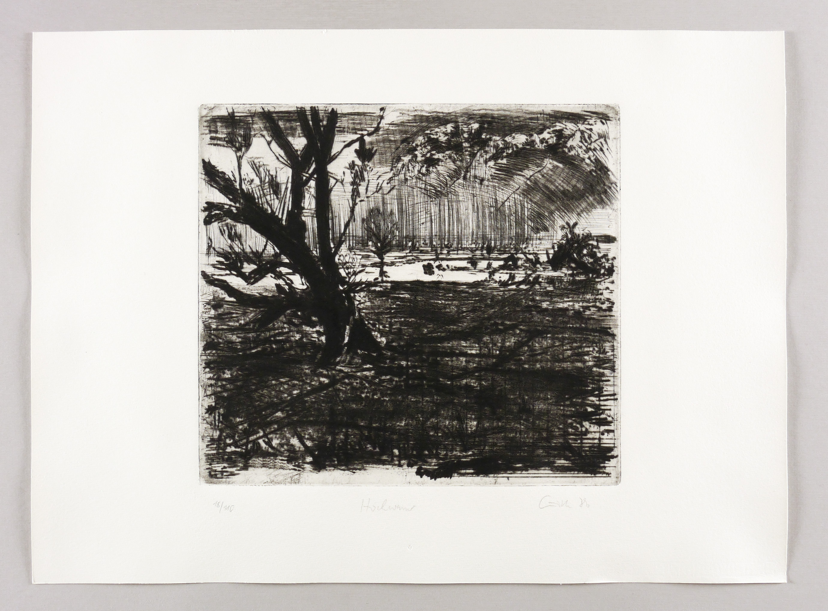 Aus: Sighard Gille, auge ufer hain. Sechs Radierungen, gewidmet Wassili Schukschin (Leipzig: Reclam 1987). – Rechts unten in Bleistift signiert und datiert: ″Gille 86″. Links Auflagenbezeichnung: ″18/110″. Am Mittig Titel. – Tadelloses Exemplar. Sehr guter Zustand.