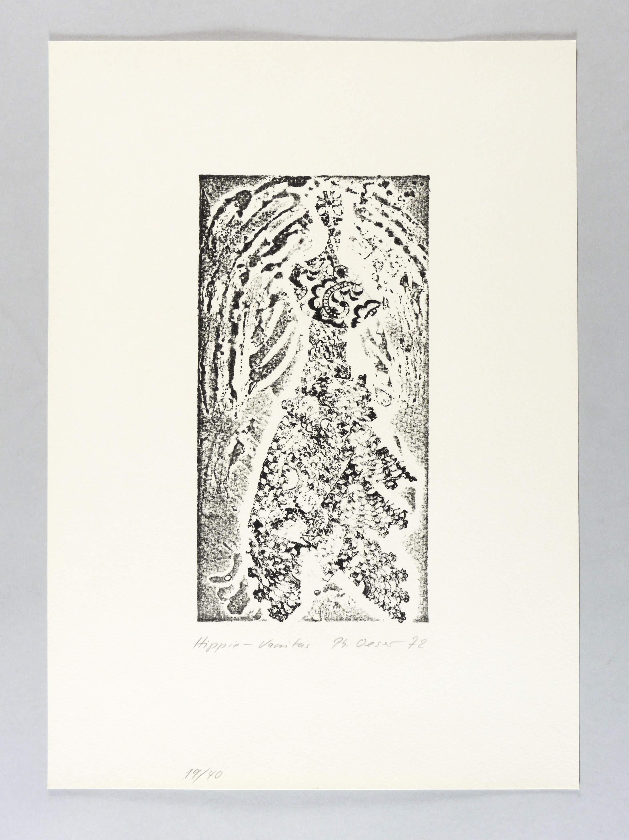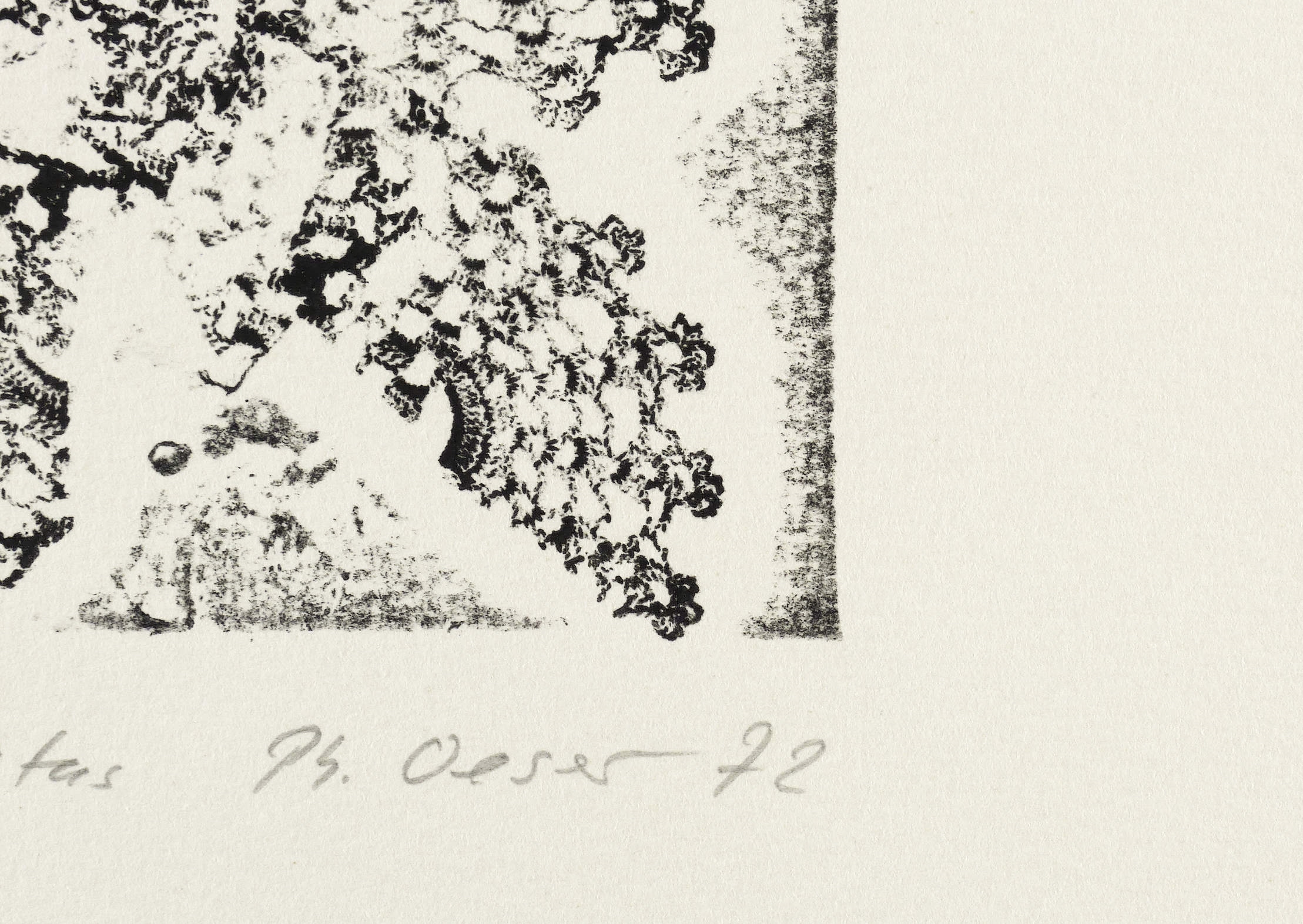 1972. Materialdruck, in Schwarz, auf hartem Maschinenpapier. – Originale Künstlergrafik, von Philip Oeser. – Auflage Exemplar Nr. 19/40. – 24,9 x 13,0 cm (Darstellung / Platte), 42 x 30 cm (Blatt).