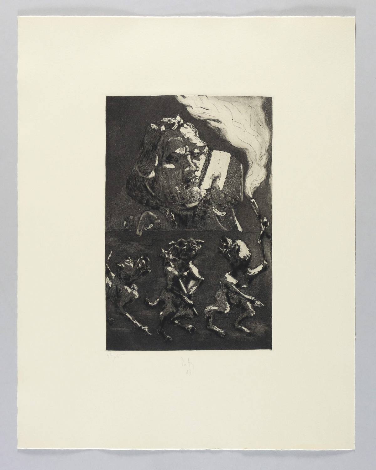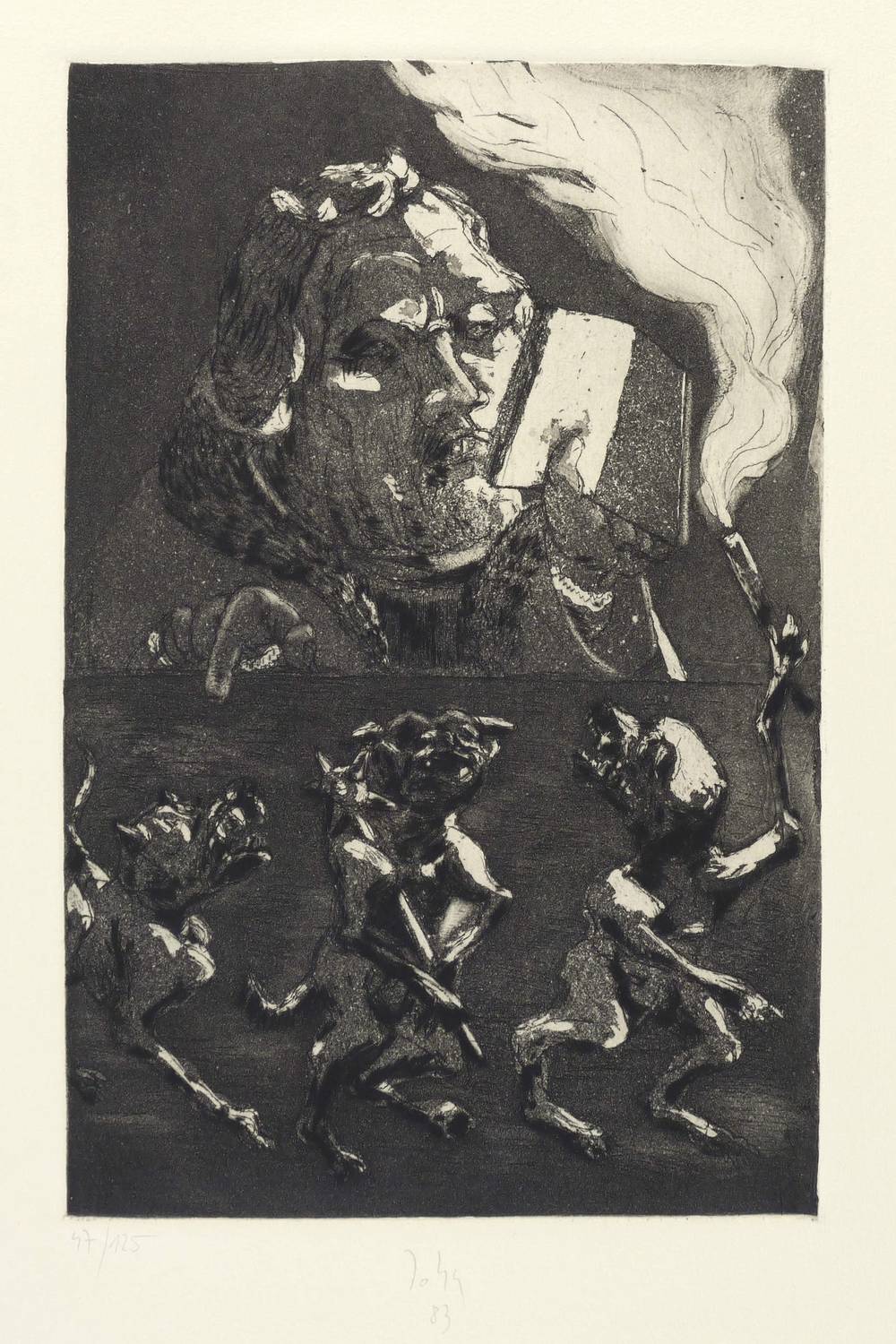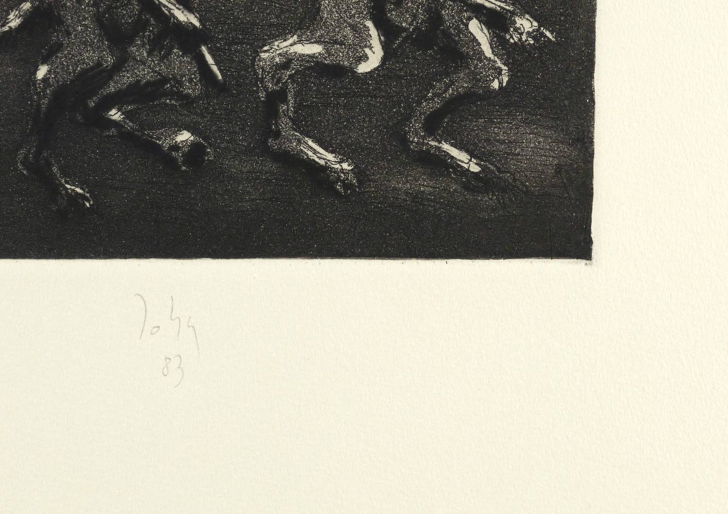1983. Radierung / Aquatinta, in Schwarz, auf gelbem Büttenkarton. – Originale Künstlergrafik, von Joachim John. – Auflage Exemplar Nr. 47/125. – 29,5 x 19,3 cm (Darstellung / Platte), 50 x 39 cm (Blatt).