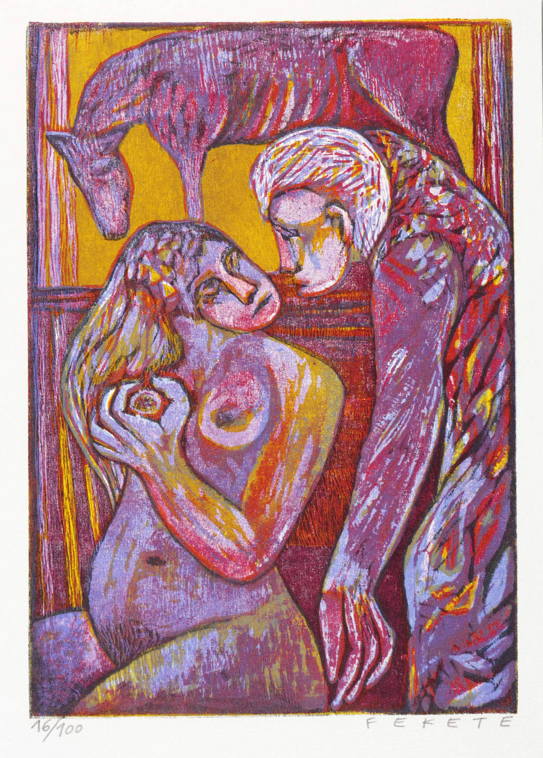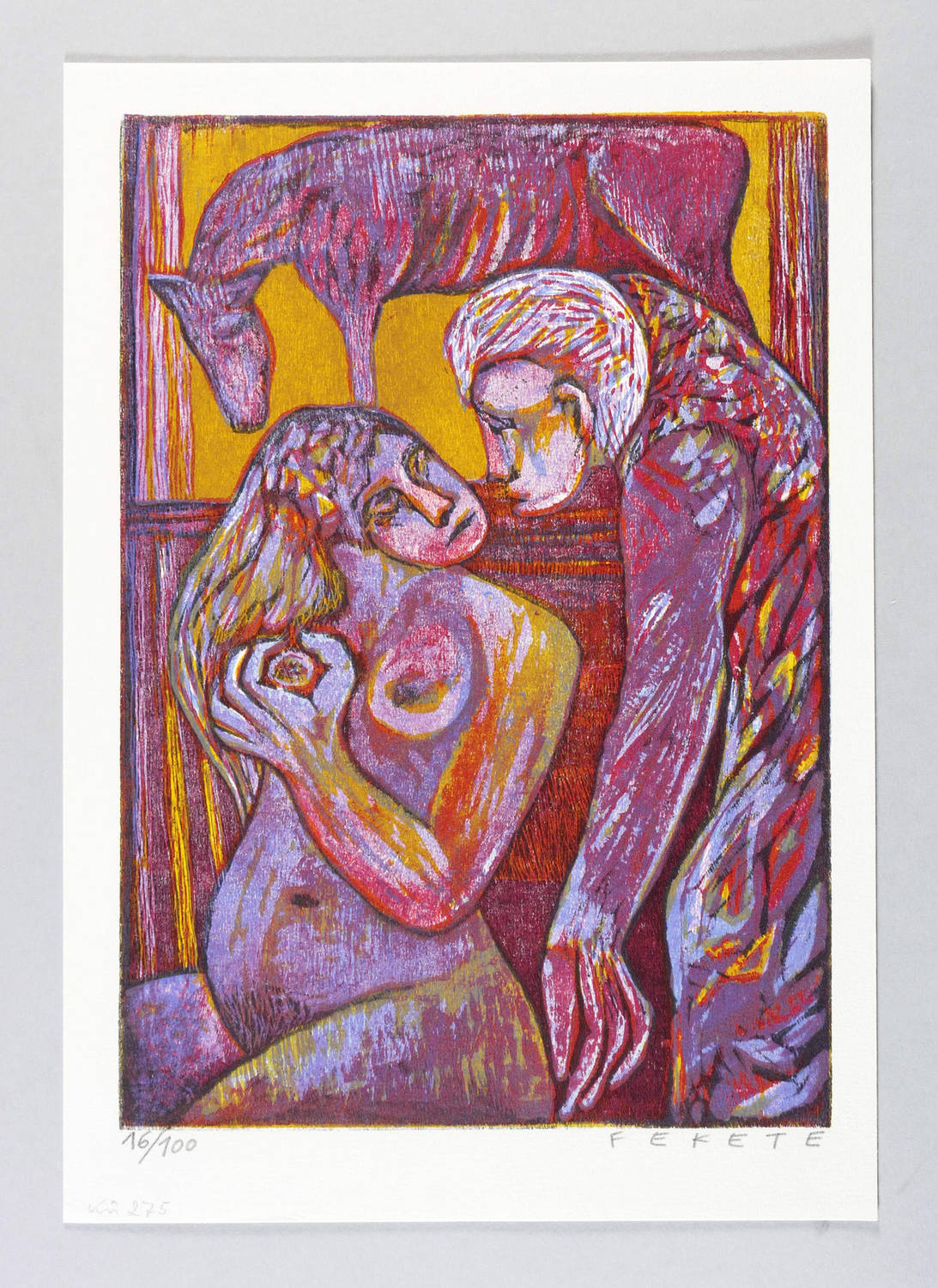 1969. Farbholzschnitt, in 5 Farben, auf Kupferdruckpapier. – Originale Künstlergrafik, von Esteban Fekete. – Auflage Exemplar Nr. 16/100. – 26,1 x 18,2 cm (Darstellung / Druckstock), 30 x 21 cm (Blatt).