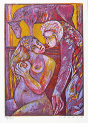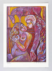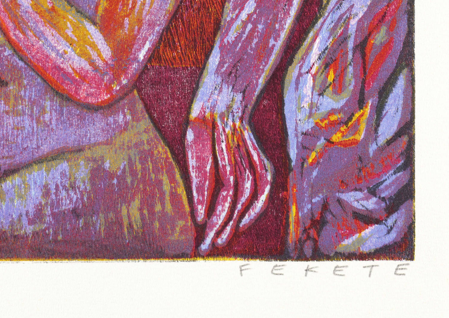 Esteban Fekete (1924 Cinkota / Budapest - 2009 Dieburg). Deutsch-argentinischer Maler, Zeichner und Grafiker. Arbeitete in verschiedenen Techniken wie Öl und Tempera, aber auch in Mischtechniken auf Papier, Holz oder Hartfaser. Anfang der 1970er Jahre entstanden Email-Bilder, Zeichnungen und Linolschnitt. Seine ureigene Technik ist allerdings der Holzschnitt, insbesondere der Farbholzschnitt, mit dem er sich einen Namen machte. So entwickelte er eine eigene Schnitt- und Bearbeitungstechnik für die Holzplatten. Für die Farbgebung verwendete er eigens dafür gesuchte Ölfarben.
