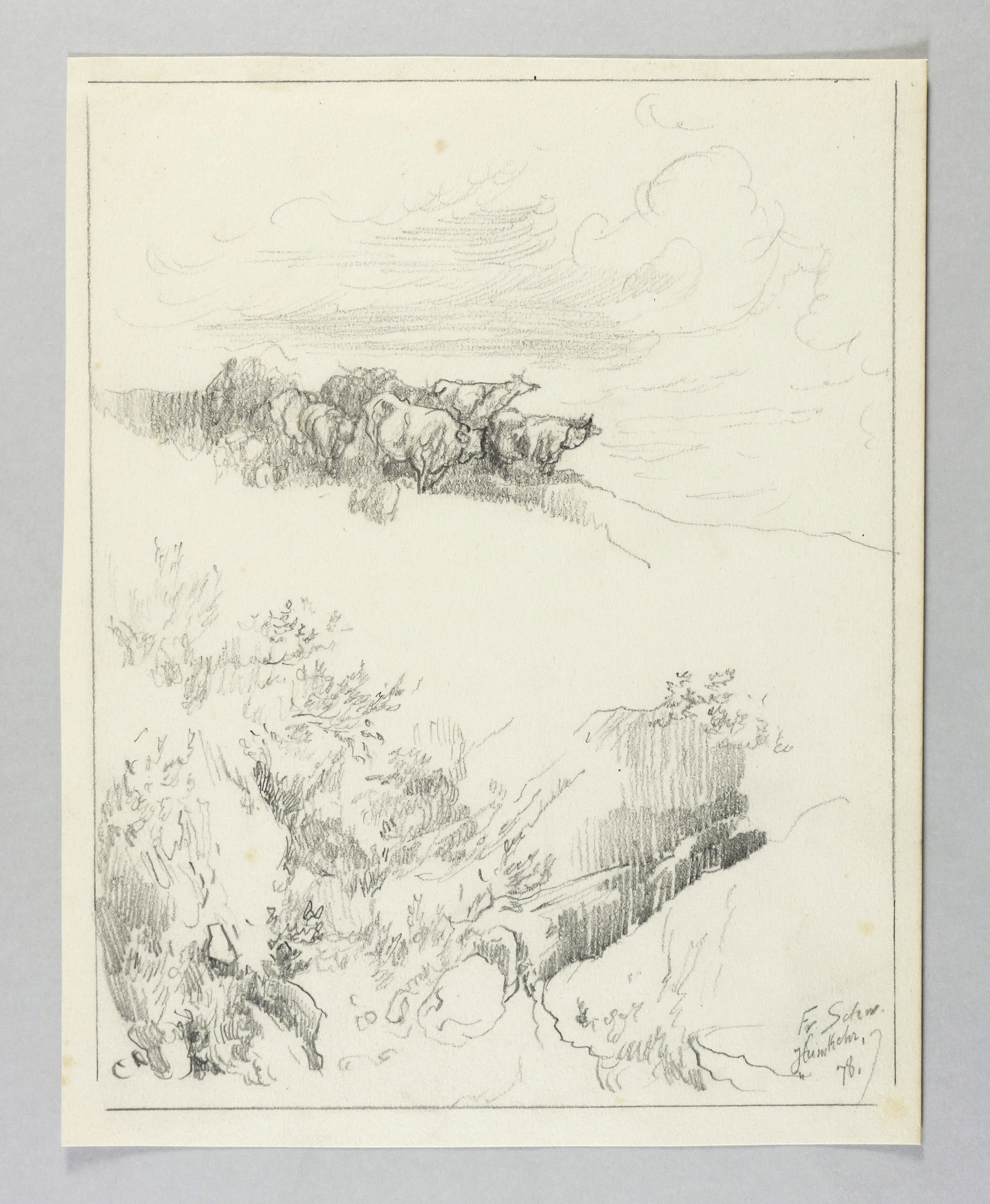 1878. Zeichnung / Bleistiftzeichnung, auf gelbem Karton. – Originale Künstlergrafik, von Friedrich Schwörer. – Unikat. – 26,0 x 20,3 cm (Darstellung / Einfassungslinie), 28 x 22 cm (Blatt).