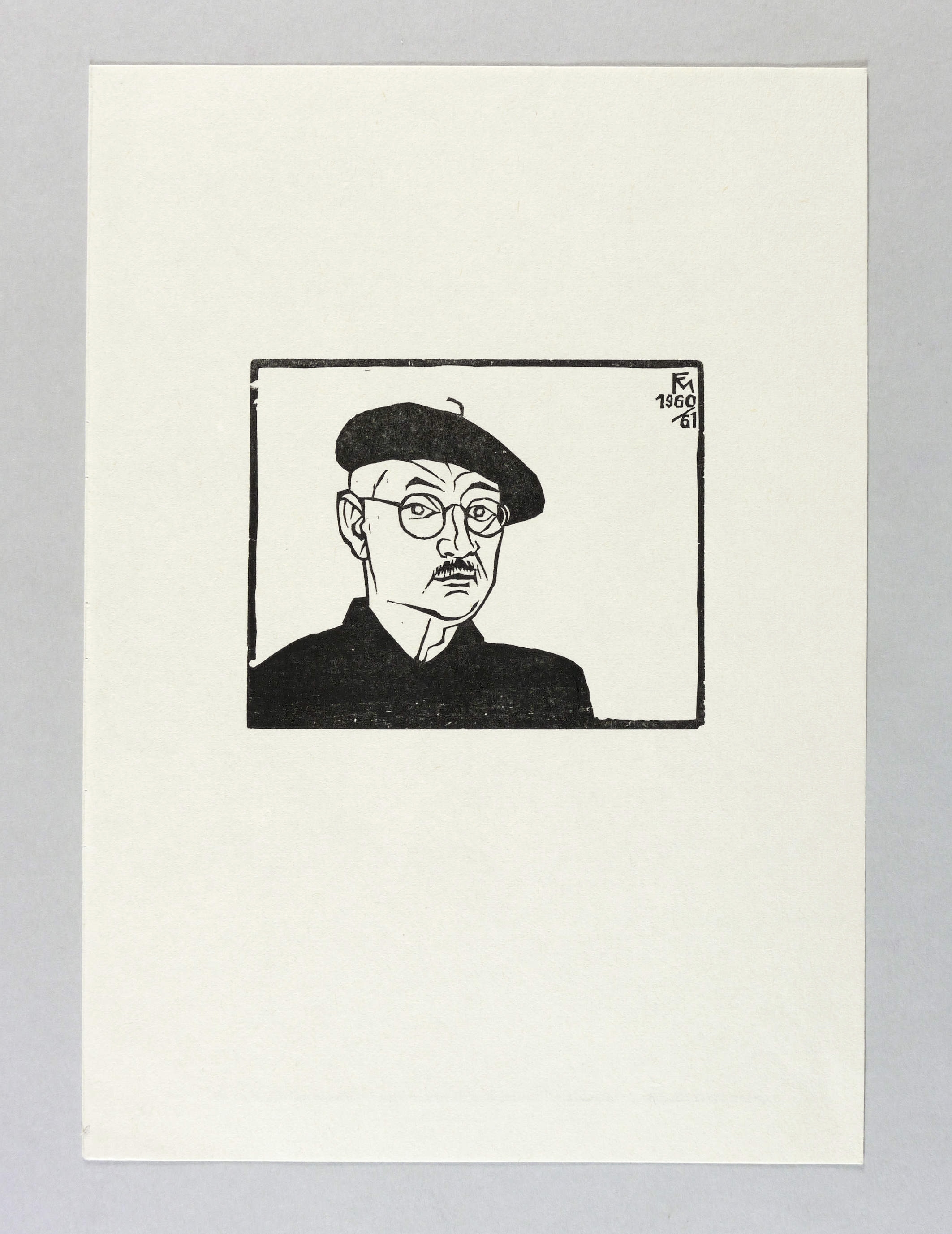Söhn 588. – Nicht handsigniert. Im Druckstock rechts oben Monogramm und Jahr: ″FM 1960/61″. Verso typografisch bezeichnet: ″CONRAD FELIXMÜLLER, 'Selbstbildnis mit Baskenmütze' Original-Holzschnitt, Werkverzeichnis Söhn 588, 1960/61″. – Abzug vom originalen Druckstock aus Birnbaumholz. – Ohne Tadel. Sehr gut erhalten.