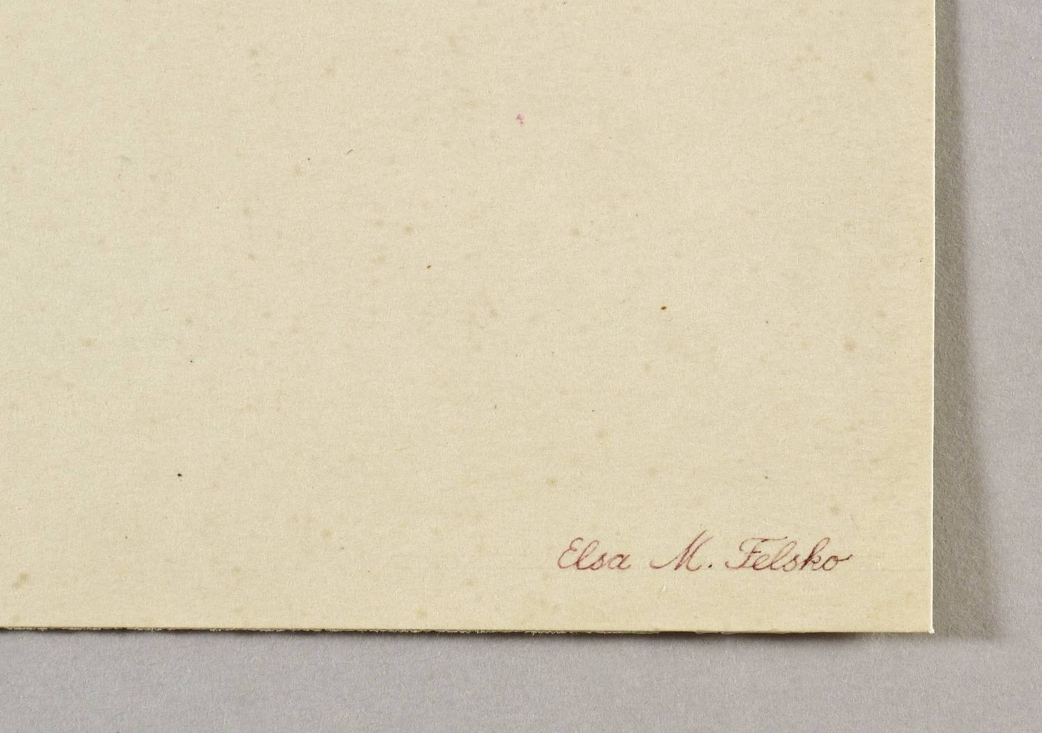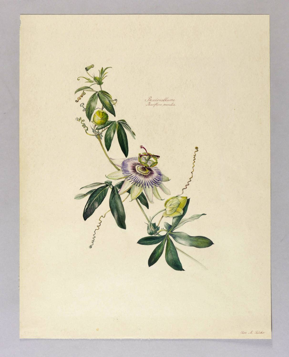 Rechts unten in brauner Feder signiert: ″Elsa M. Felsko″. Rechts oben in der Darstellung bezeichnet: ″Passionsblume. Passiflora caerulea″. Links unten in der Blattecke unscheinbar in Bleistift: ″Istanbul″. – Weitgehend ohne Alterungs- oder Lagerspuren. Sehr guter Erhaltungszustand.