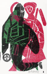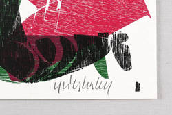 1976. Farbholzschnitt, in Rot, Grün & Schwarz, auf glattem hellchamois Werkdruck. – Originale Künstlergrafik, von HAP Grieshaber. – Künstlerexemplar (e.a.). – 25,5 x 22,4 cm (Darstellung / Druckbild), 26,6 x 17,0 cm (Blatt).