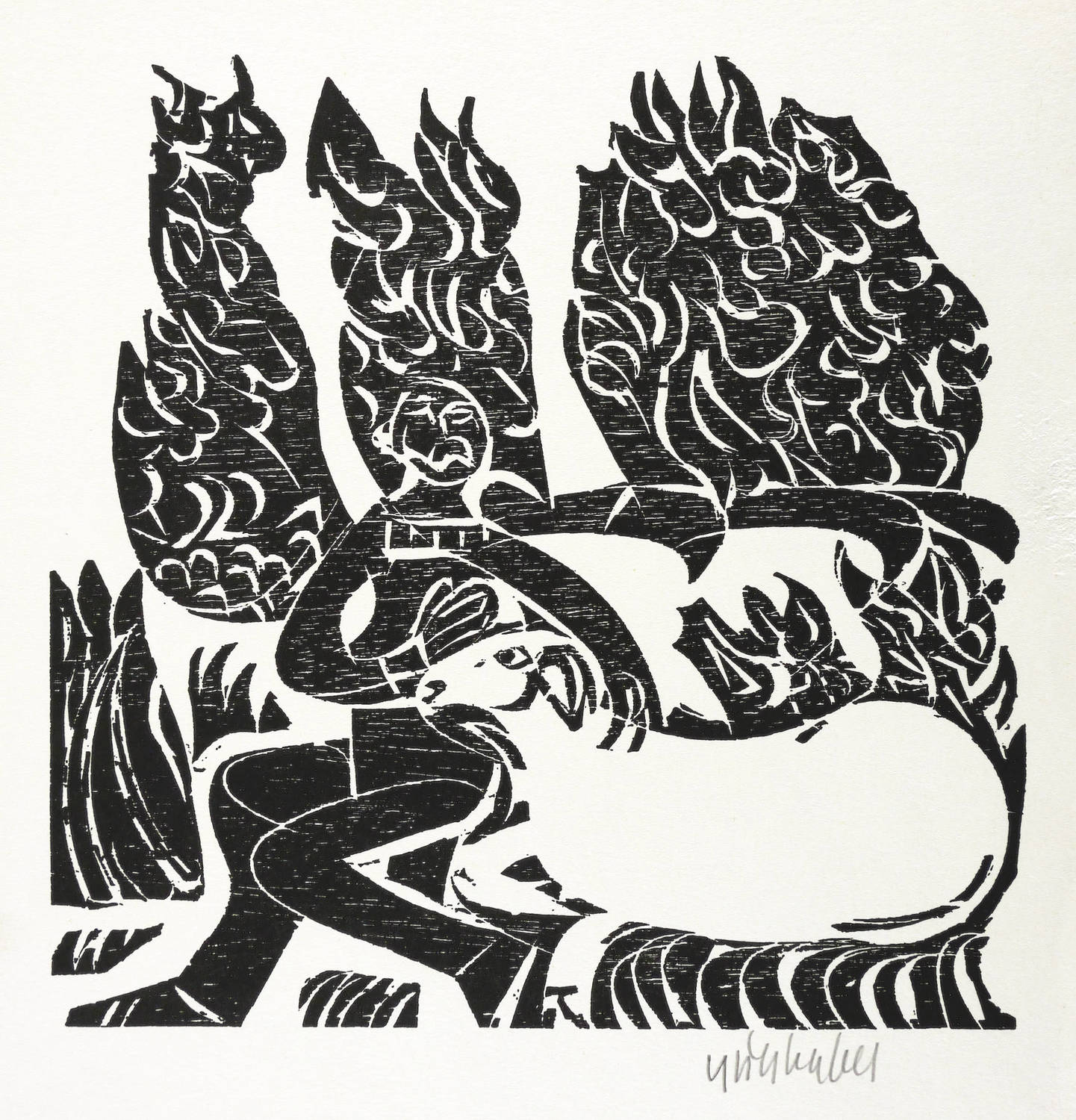 1977. Holzschnitt, in Schwarz, auf hellchamois Velin. – Originale Künstlergrafik, von HAP Grieshaber. – 30 x 24 cm (Blatt), 20,5 x 20,9 cm (Darstellung / Druckbild).
