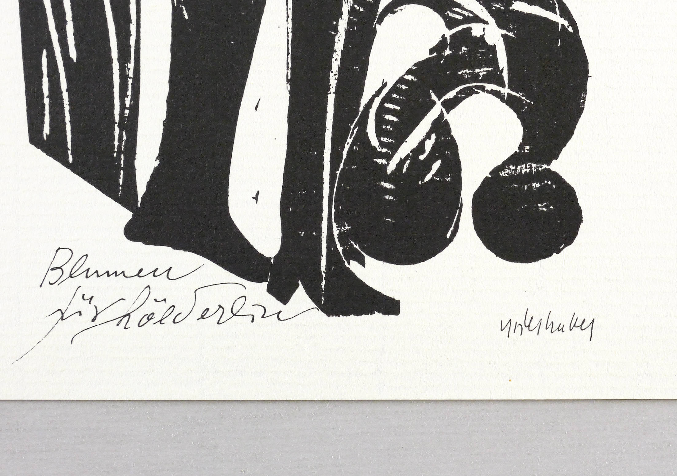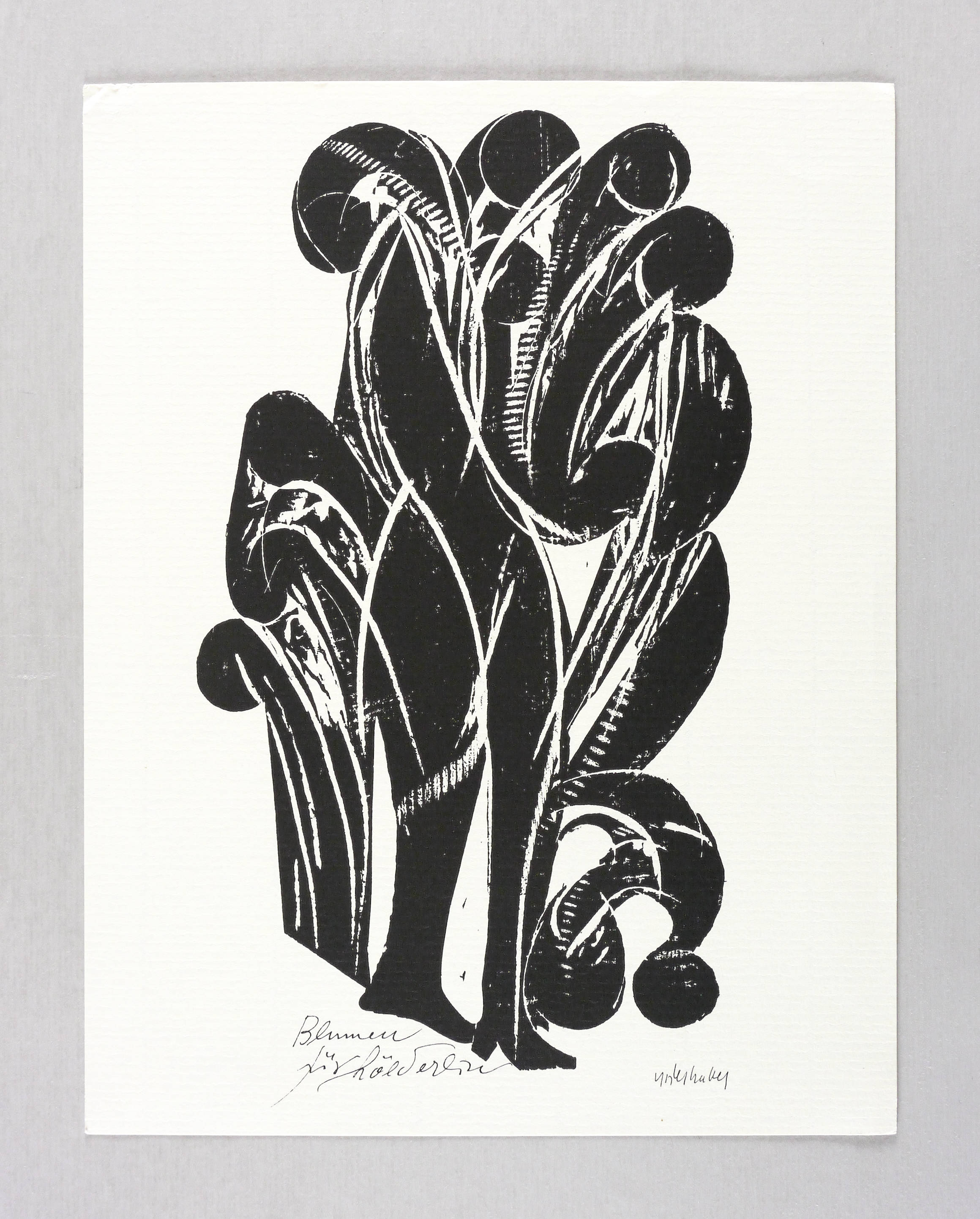 Nicht handsigniert. Rechts unten in der Druckform Signatur: ″Grieshaber″. Links Titel. – Verkleinernder Offsetdruck für das Mappenwerk ″HAP Grieshaber und die Eberhard-Karls-Universität Tübingen″ (Tübingen: Attempto 1981) von der Schwarzplatte des 1971 geschaffenen Farbholzschnitts ″Figurenstrauß″ (WVZ Fürst 71/36). – Sehr guter Zustand.