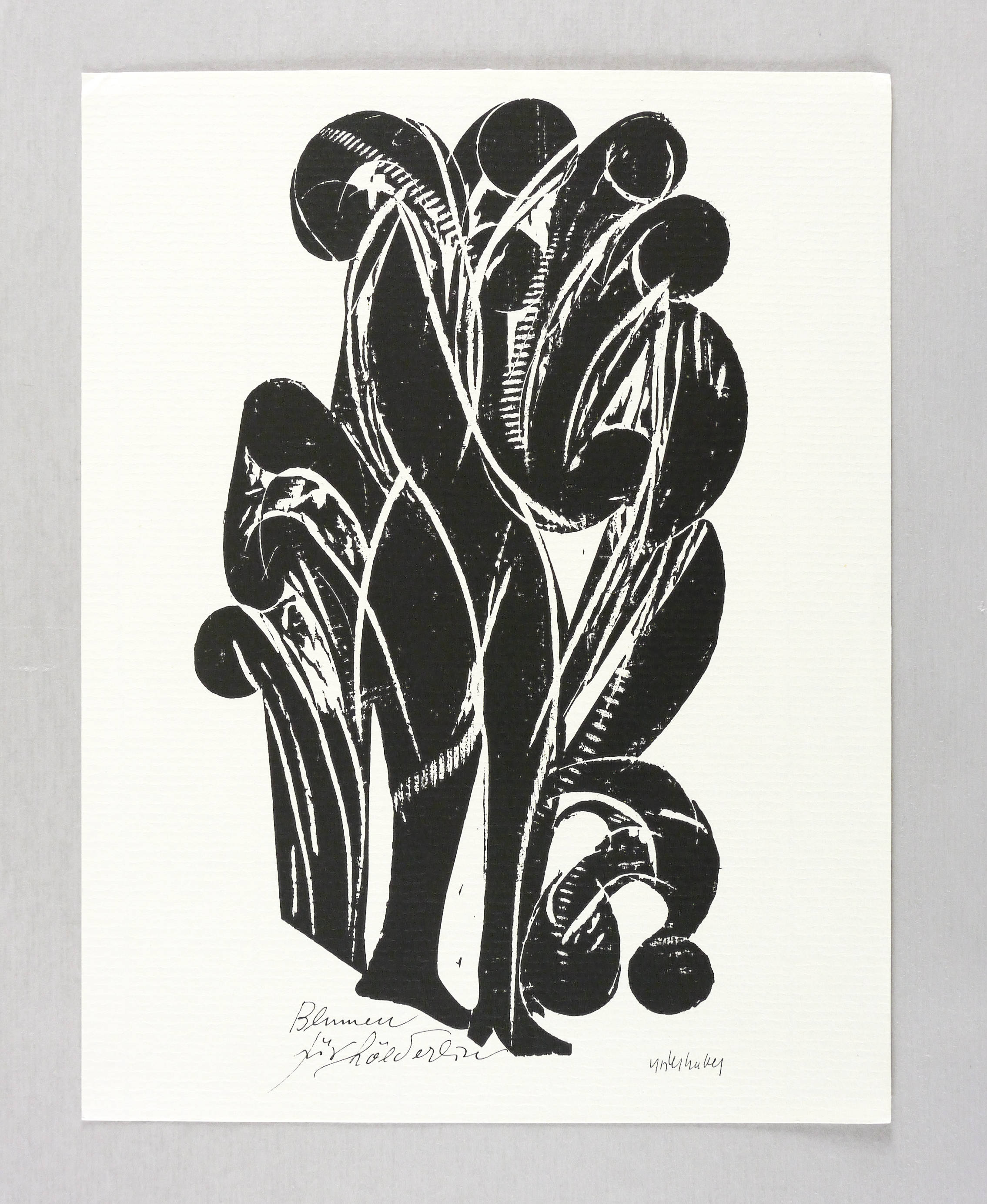Nicht handsigniert. Rechts unten in der Druckform Signatur: ″Grieshaber″. Links Titel. – Verkleinernder Offsetdruck für das Mappenwerk ″HAP Grieshaber und die Eberhard-Karls-Universität Tübingen″ (Tübingen: Attempto 1981) von der Schwarzplatte des 1971 geschaffenen Farbholzschnitts ″Figurenstrauß″ (WVZ Fürst 71/36). – Sehr guter Zustand.