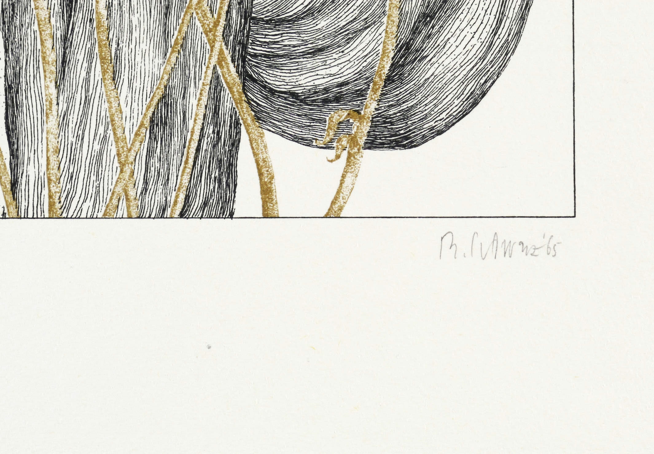 1965. Farblithografie / Feder- & Pinsellithografie, in Ocker & Schwarz, auf hartem hellchamois Velin. – Originale Künstlergrafik, von Reiner Schwarz. – Auflage Exemplar Nr. 6/80. – 24,2 x 30,0 cm (Darstellung / Druckbild), 52 x 38 cm (Blatt).