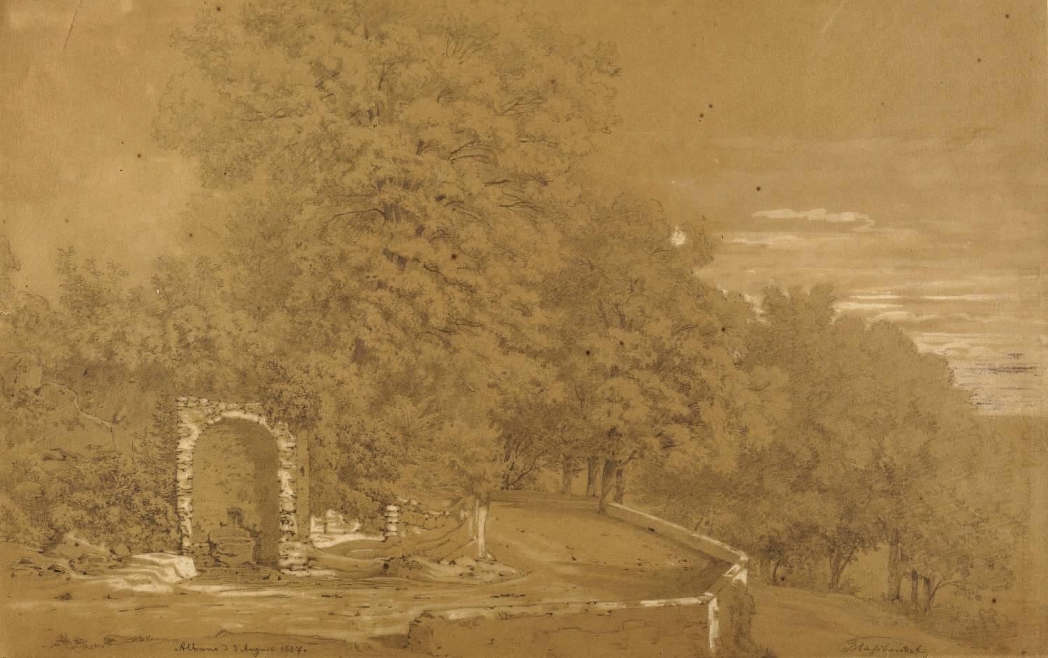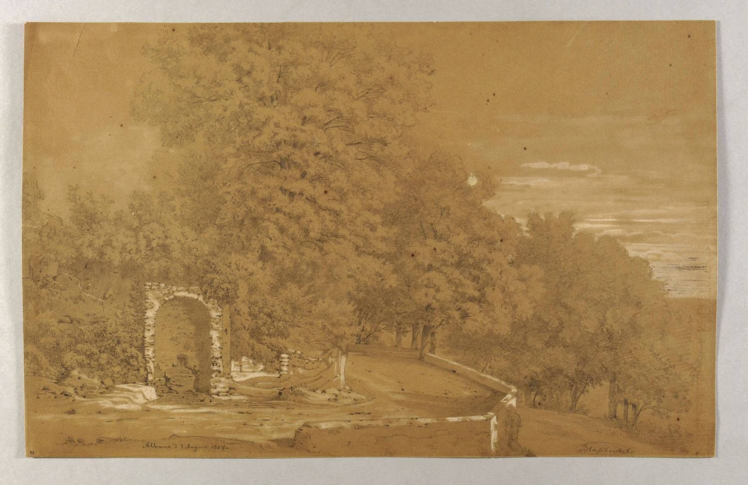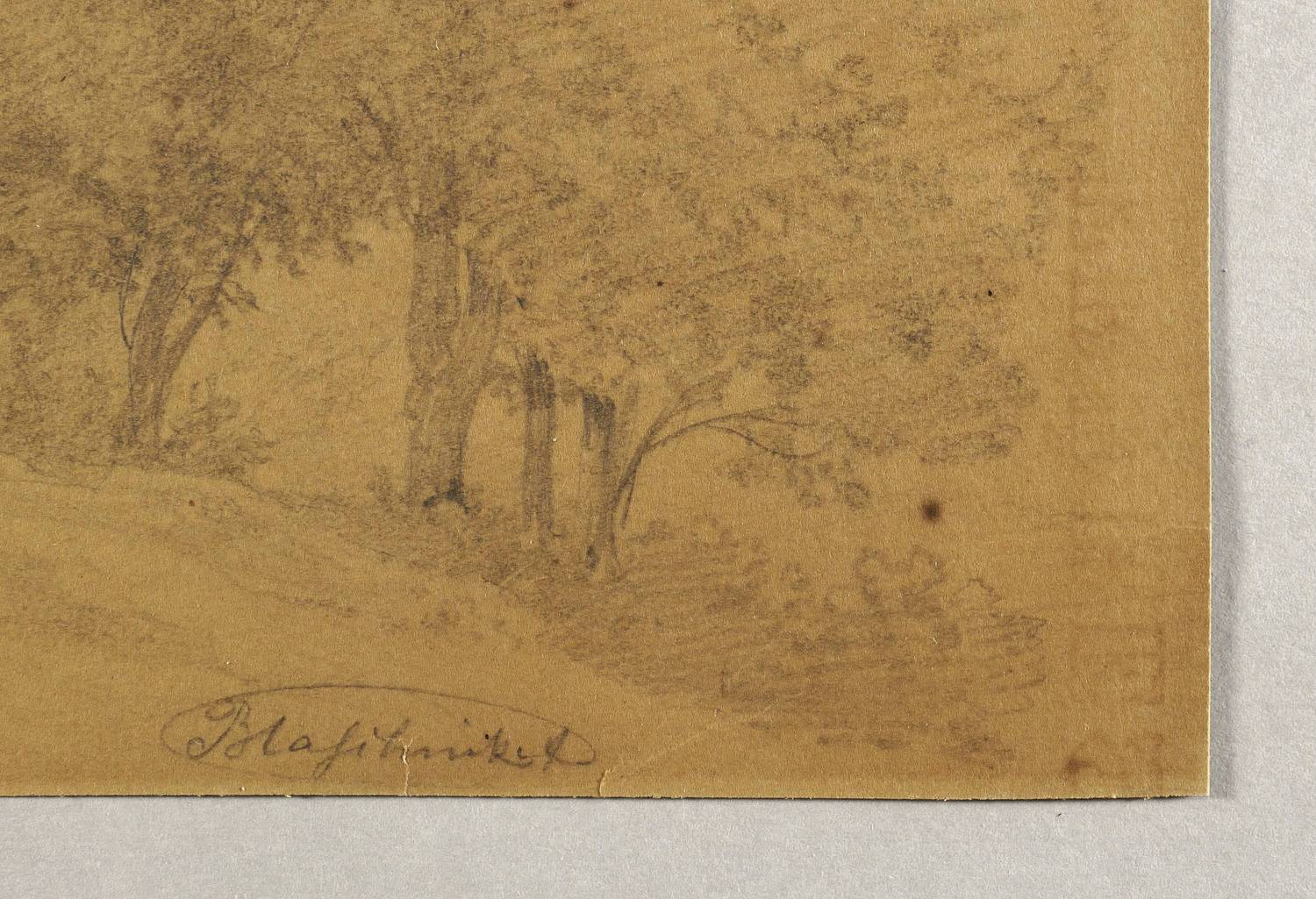 Rechts unten in Bleistift signiert: ″Blaschnik″. Links bezeichnet und datiert: ″Albano d. 9. August 1887.″ Wasserzeichen. – Der gezeigte Brunnen lag direkt an der Via Appia zwischen Ariccia und Albano Laziale (unmittelbar vor den Toren) und wurde von vielen kunstfertigen Italienreisenden gezeichnet oder gemalt. – Deckweiß an wenigen Stellen schwarz angelaufen. Einige Fleckchen wohl durch Eiseneinschluss. Verso vier Risse hinterlegt. Insgesamt nur mäßiger Zustand.