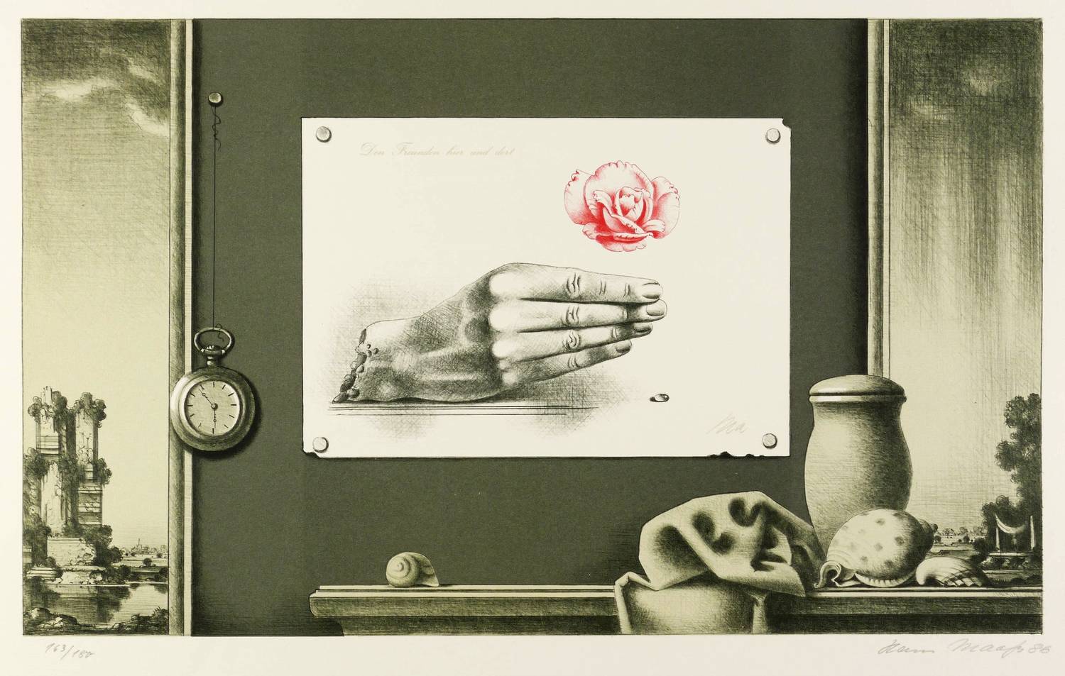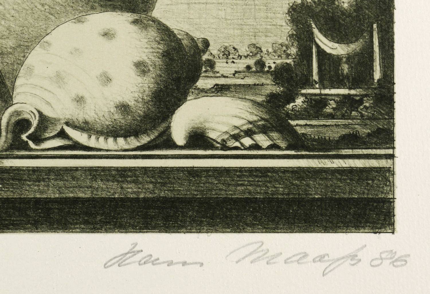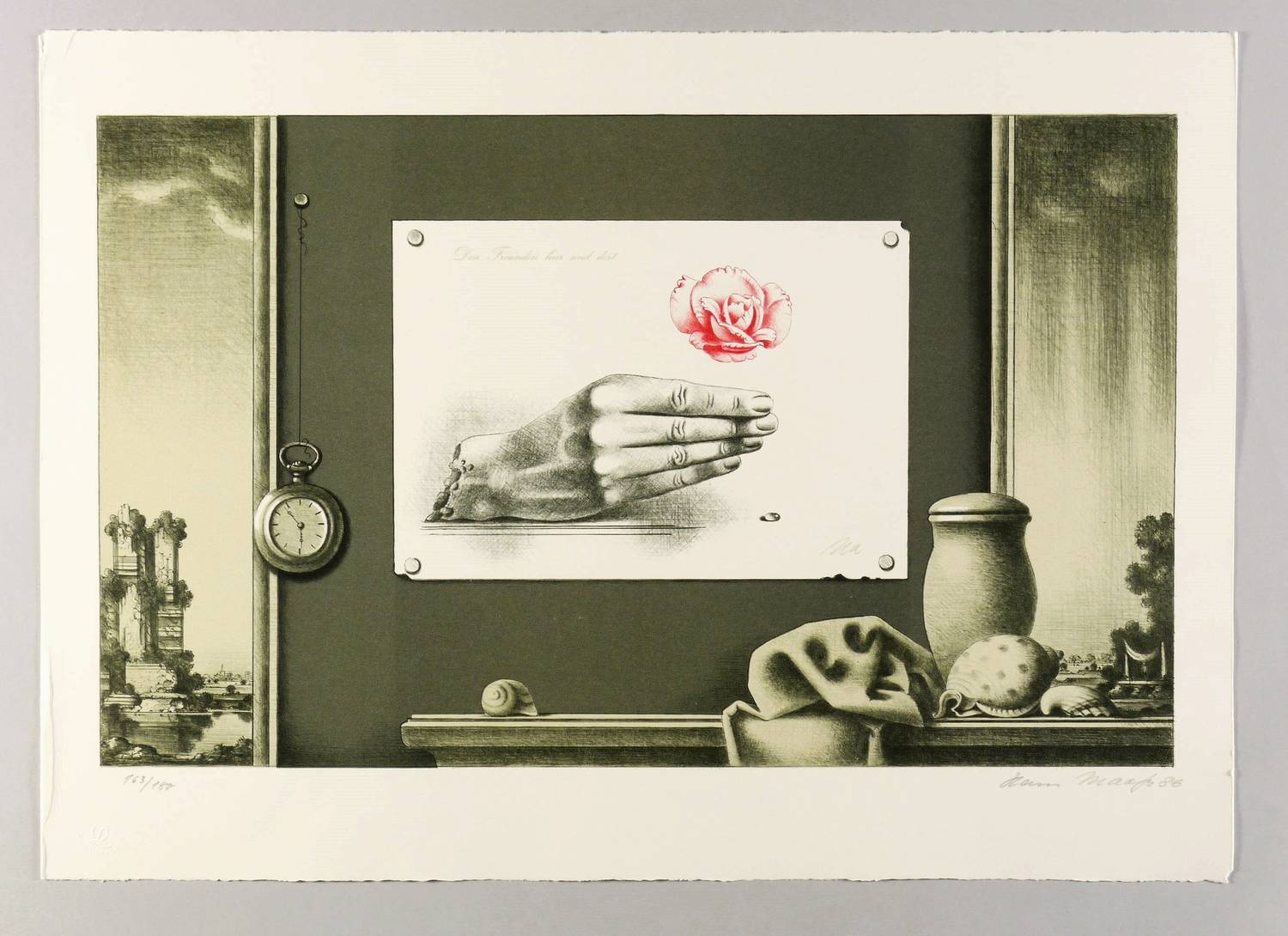 1986. Farblithografie / Kreide-, Feder- & Pinsellithografie, in 4 Farben, auf weißem Hahnemühle-Kupferdruckbütten. – Originale Künstlergrafik, von Hans Maaß. – Auflage Exemplar Nr. 163/180. – 37,8 x 62,1 cm (Darstellung / Druckbild), 50 x 69 cm (Blatt).