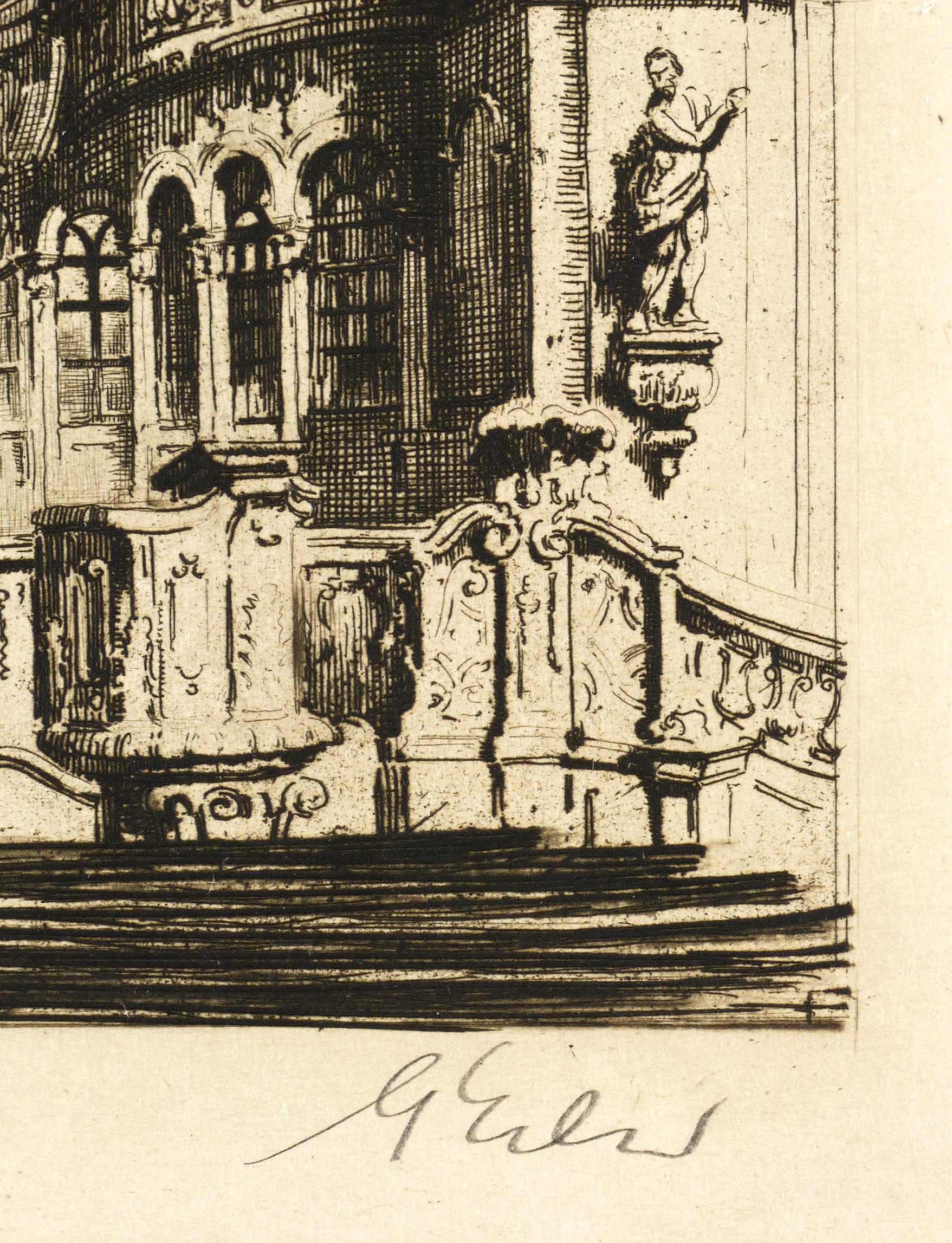 1920-1925. Radierung / Strichätzung, in Schwarz, auf leichtem gelbem Kupferdruckpapier. – Originale Künstlergrafik, von Georg Erler. – 31,3 x 21,1 cm (Darstellung), 36,8 x 24,6 cm (Platte), 43 x 30 cm (Blatt).